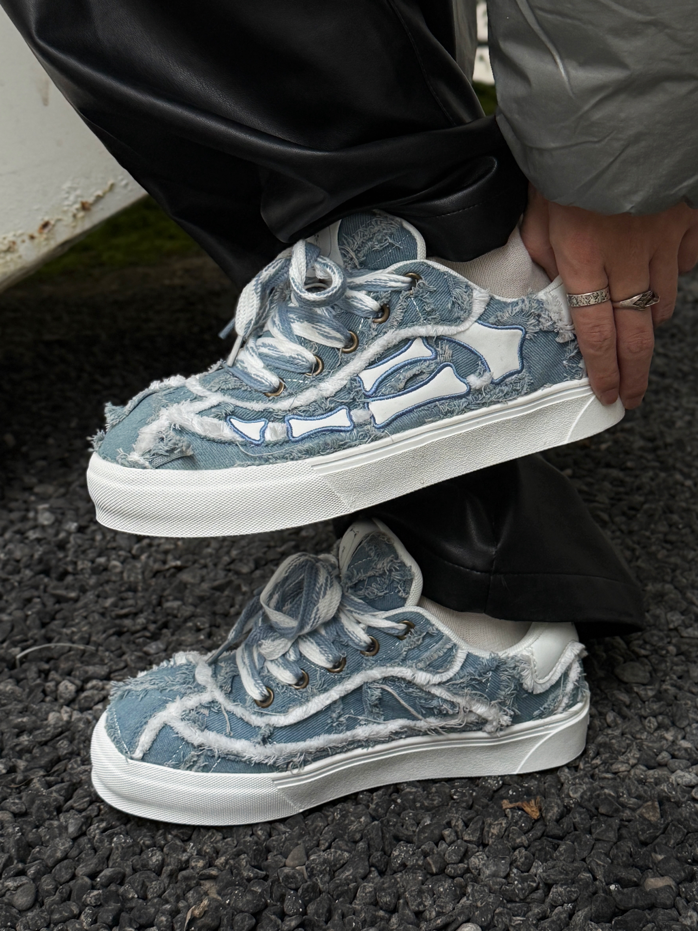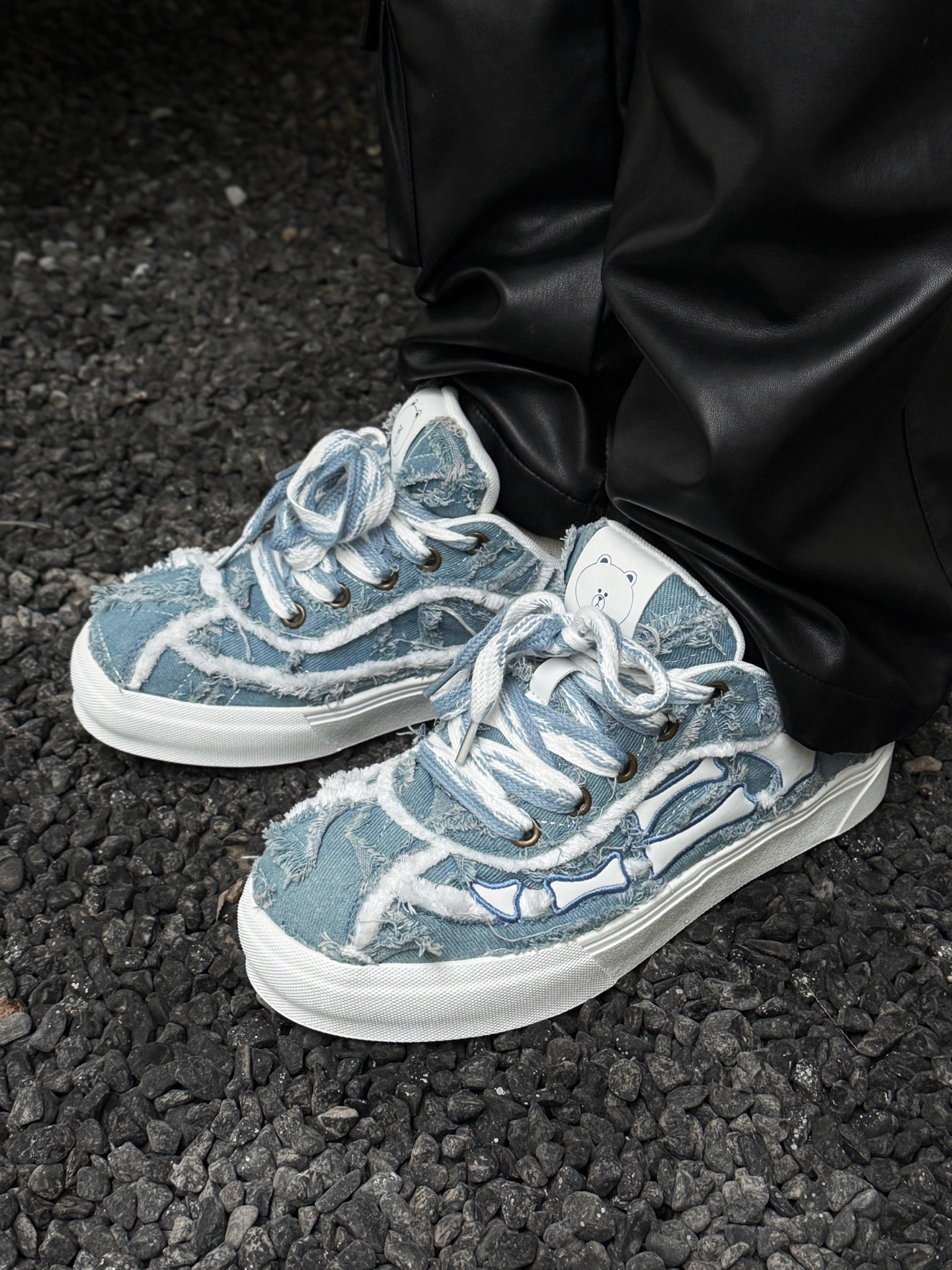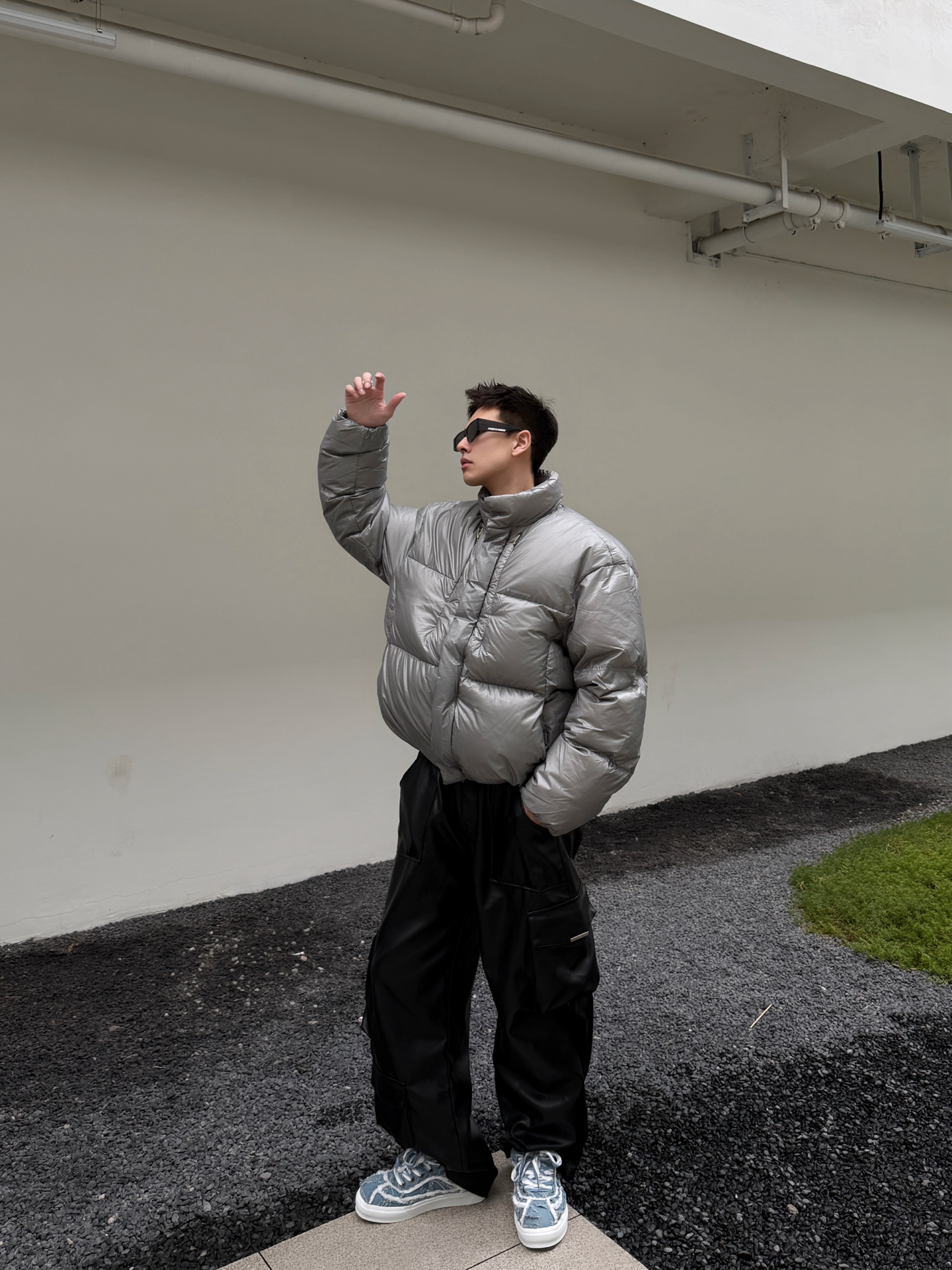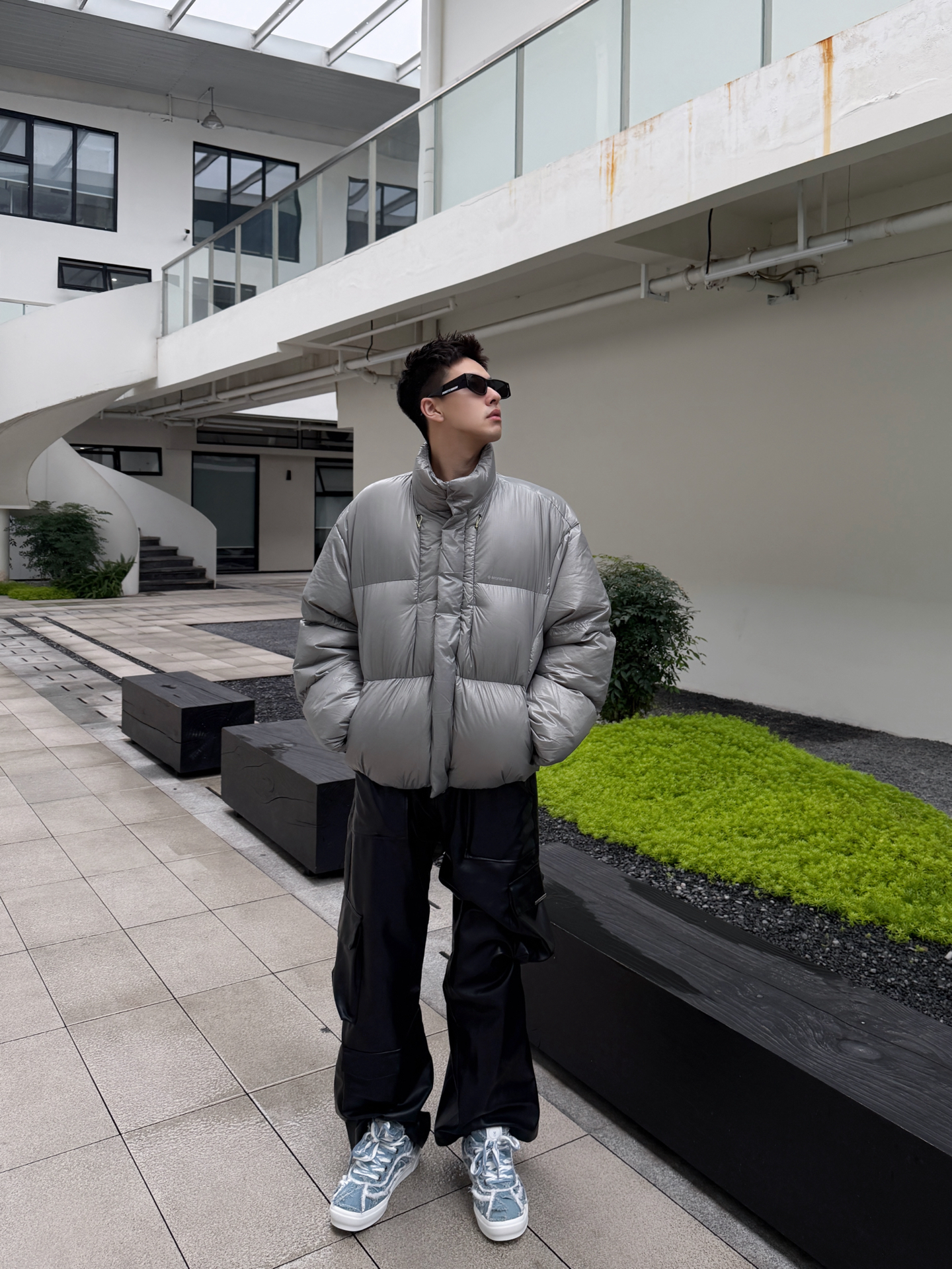 银面羽绒服撞上Line Friends毛边板鞋,冷感与软萌的反差感绝了 银灰色亮面羽绒服自带未来感的冷调气场,利落的立领短款剪裁还能拉高腰线;下搭黑皮裤延续酷感,却被一双Line Friends毛边牛仔板鞋打破沉闷——毛边做旧的牛仔鞋面揉着软萌的卡通细节,蓝白调调在全黑银的搭配里戳出一抹清新,冷硬的工业风穿搭瞬间多了份反差萌。 这种“硬核外壳+软萌内里”的搭配巧思,把街头酷感和童趣细节捏得刚刚...