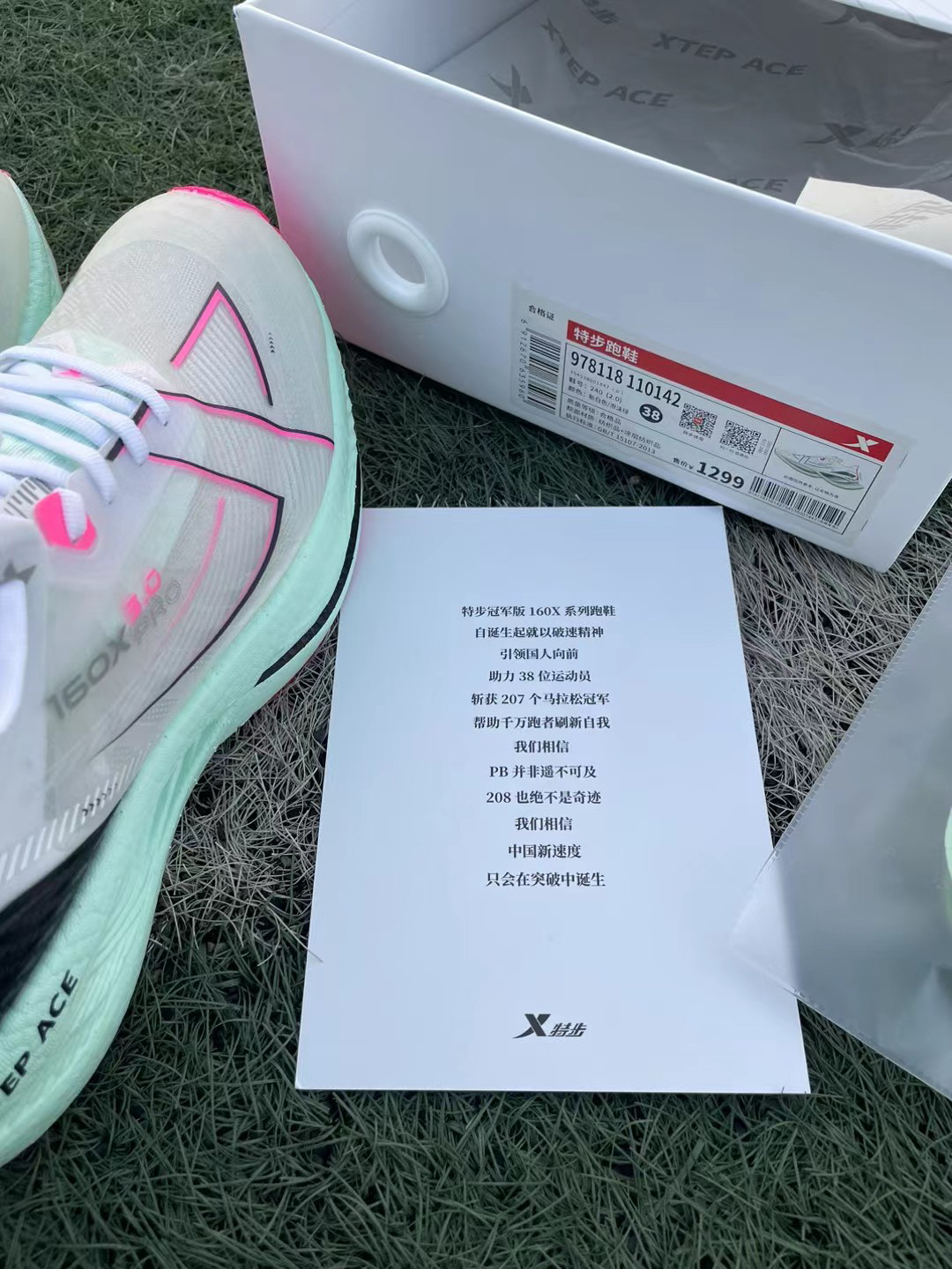终于拿下特步160X 3.0冠军版!这双鞋的颜值和意义直接拉满,浅绿渐变的鞋身搭配荧光粉线条,在阳光下颜值炸裂。鞋盒里的纪念卡片写着207个马拉松冠军的战绩,太有仪式感了。上脚后脚感轻盈,推进力超明显,不管是冲成绩还是日常收藏,这双国牌竞速鞋都值得入手!