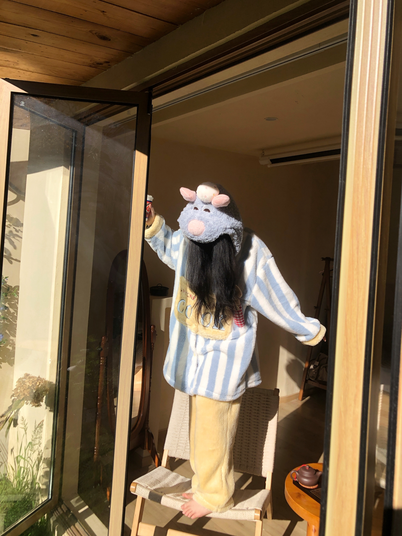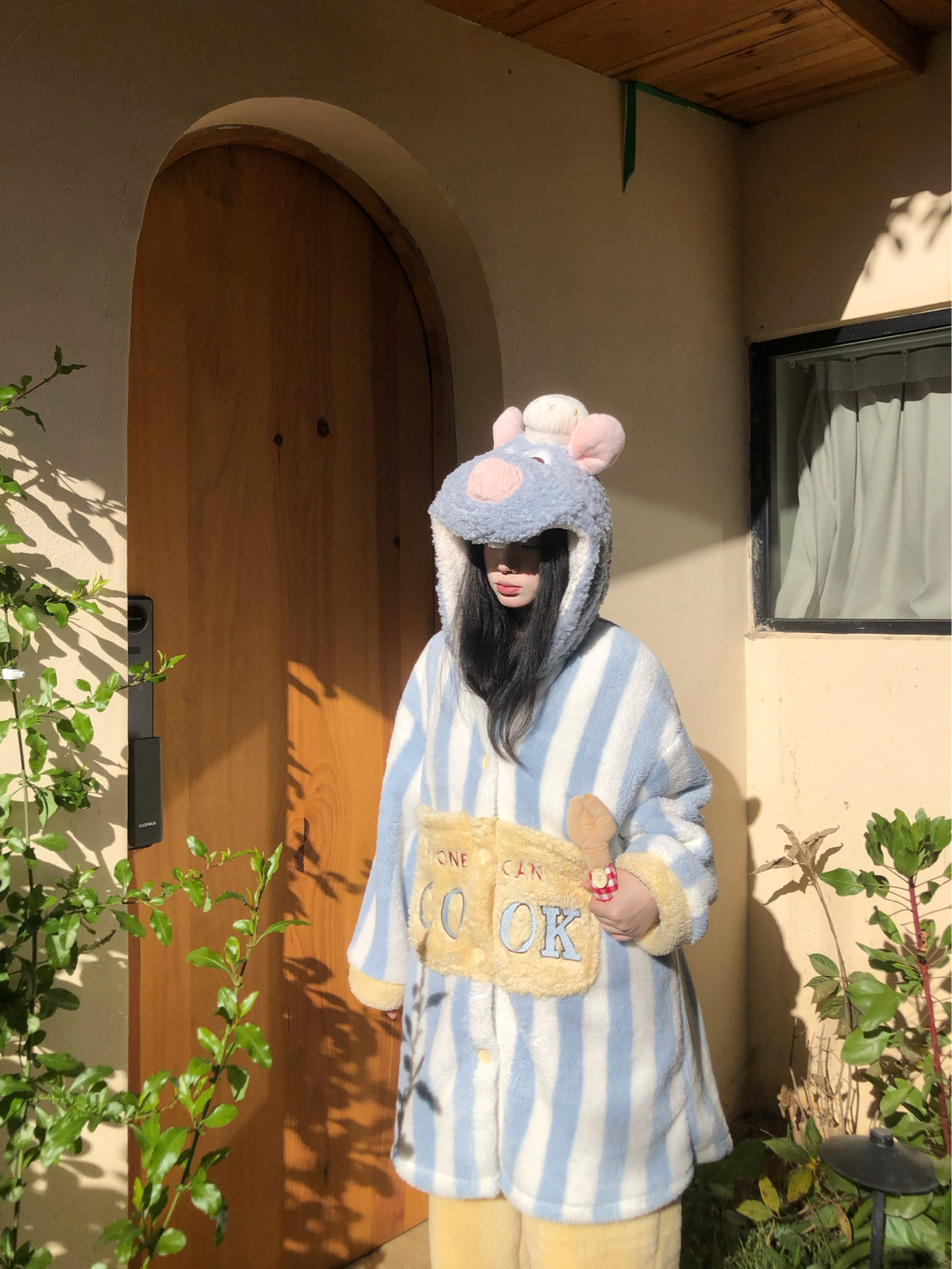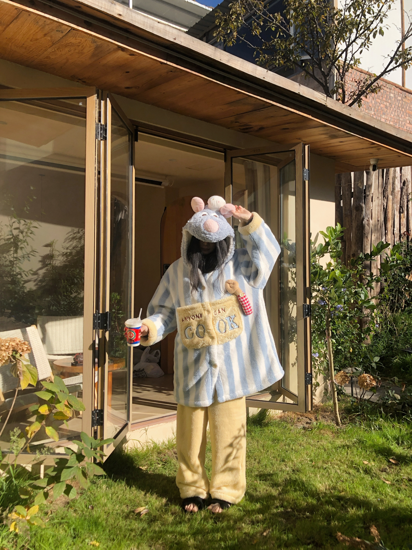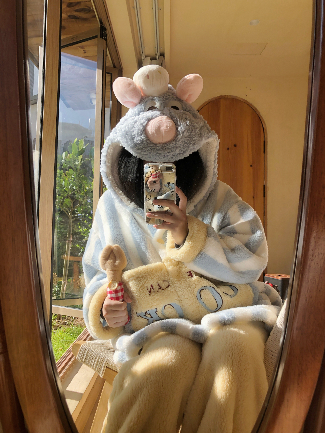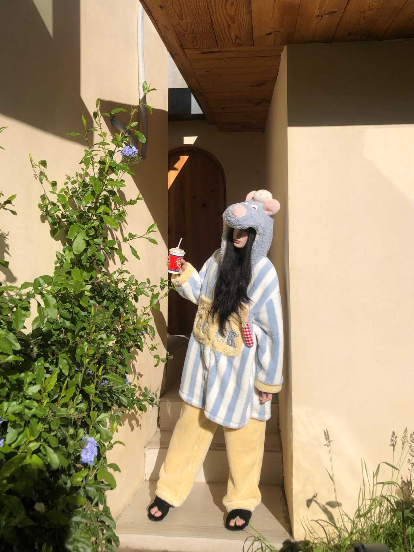 在花园里穿可爱睡衣心情都会变好~ 我穿的果壳联名迪士尼料理鼠王睡衣套装🐭 蓝黄配色的料理鼠王居家服童趣感满满~ 上衣搭配裤子舒适又实穿 上身很宽松🤓 在南方这么穿不吃建模可以直接过冬🥳 圣诞送礼选它谁能不心动💓