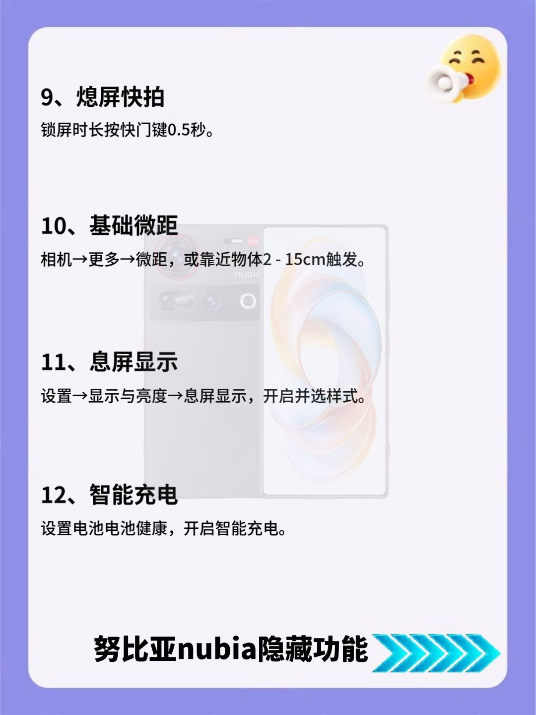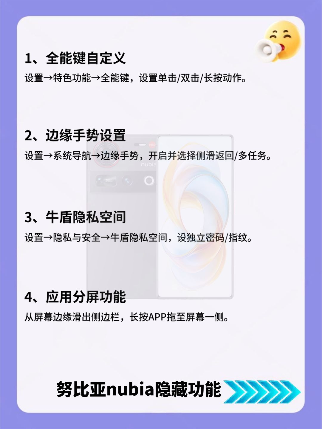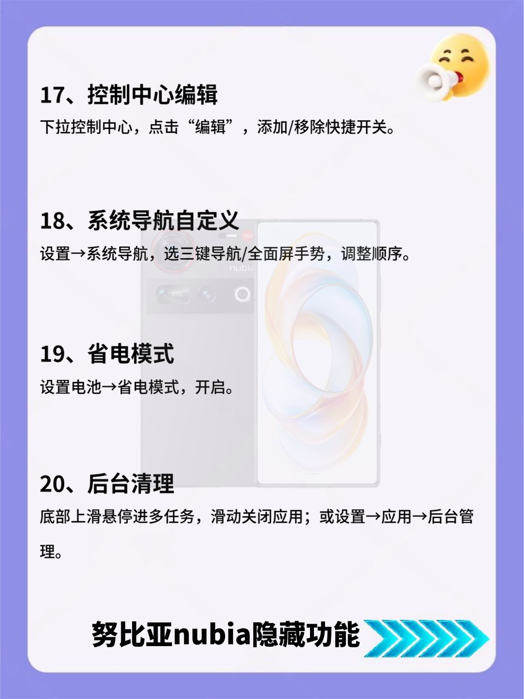 努比亚nubia看过来!24个隐藏功能必学的! 努比亚nubia党看过来!这份24个隐藏功能清单,详细到离谱! 好多实用小功能都被大家忽略了,赶紧存好慢慢试,总有一款能解决你的用机痛点! 有没有私藏的努比亚设置技巧?快来和我交换呀~