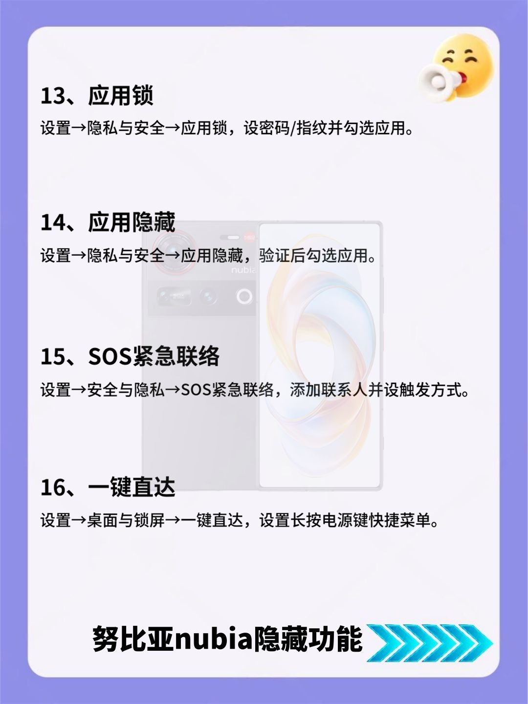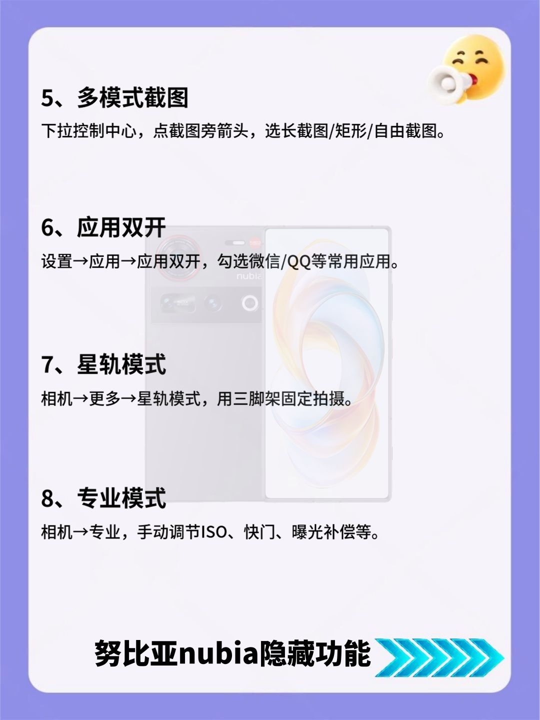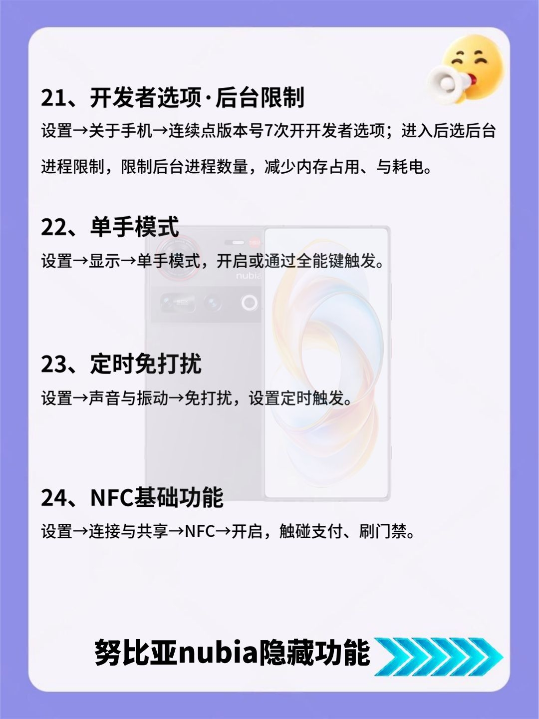 努比亚nubia看过来!24个隐藏功能必学的! 努比亚nubia党看过来!这份24个隐藏功能清单,详细到离谱! 好多实用小功能都被大家忽略了,赶紧存好慢慢试,总有一款能解决你的用机痛点! 有没有私藏的努比亚设置技巧?快来和我交换呀~