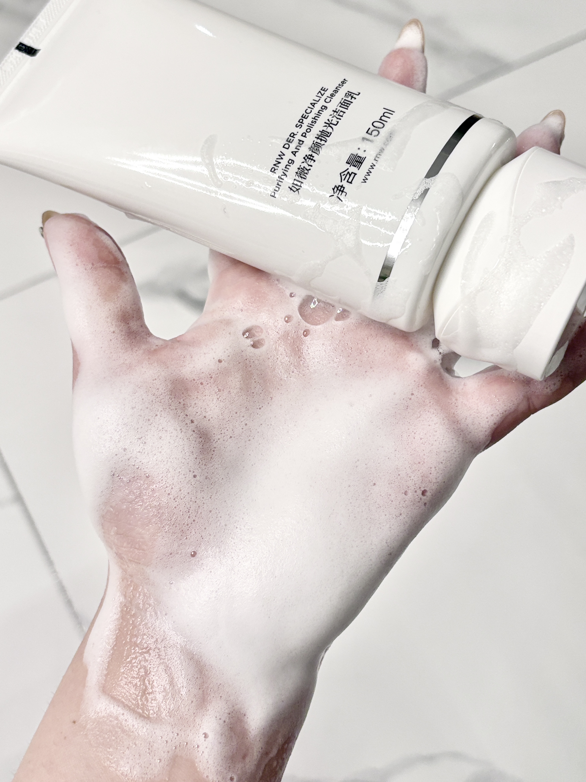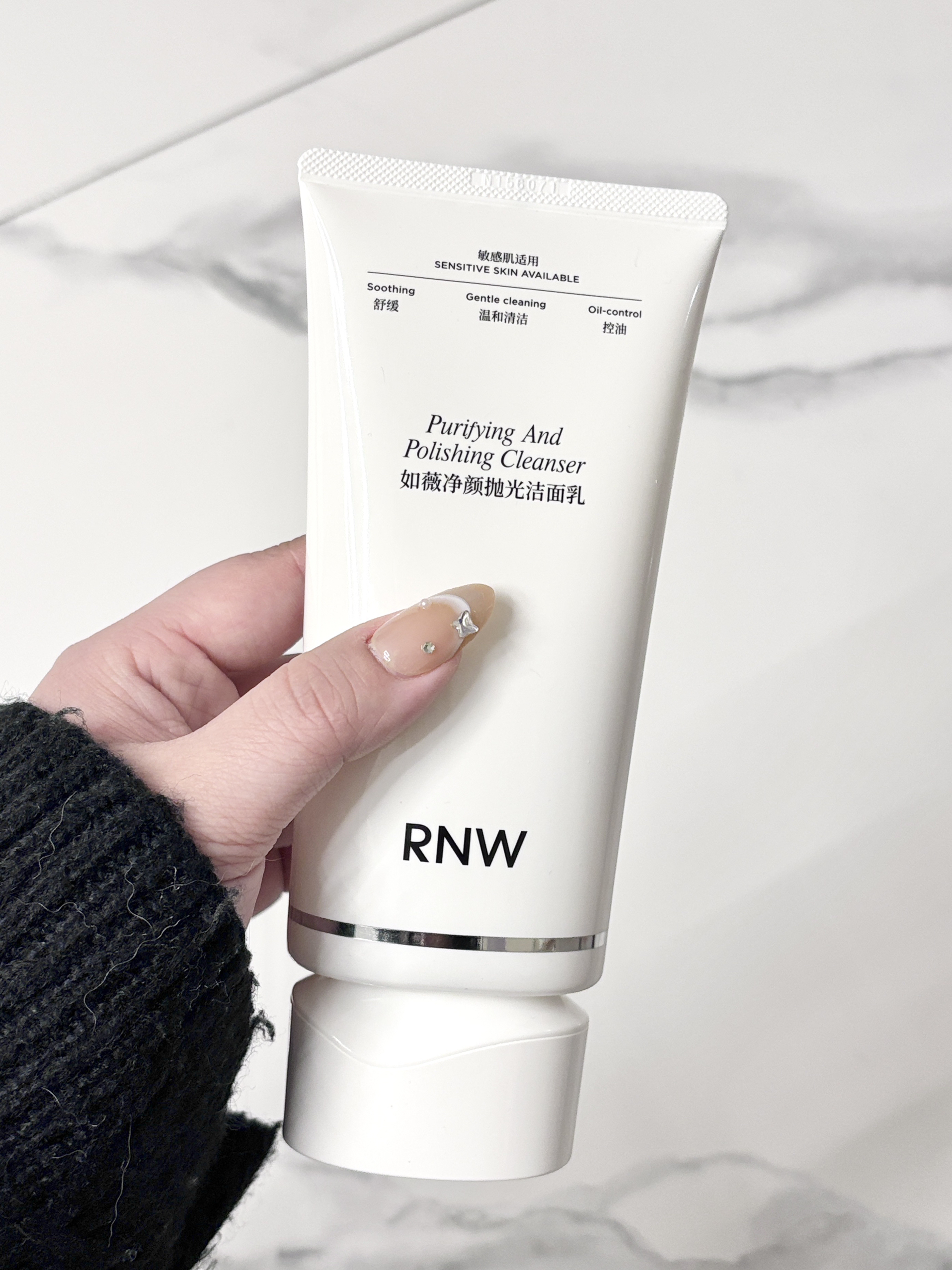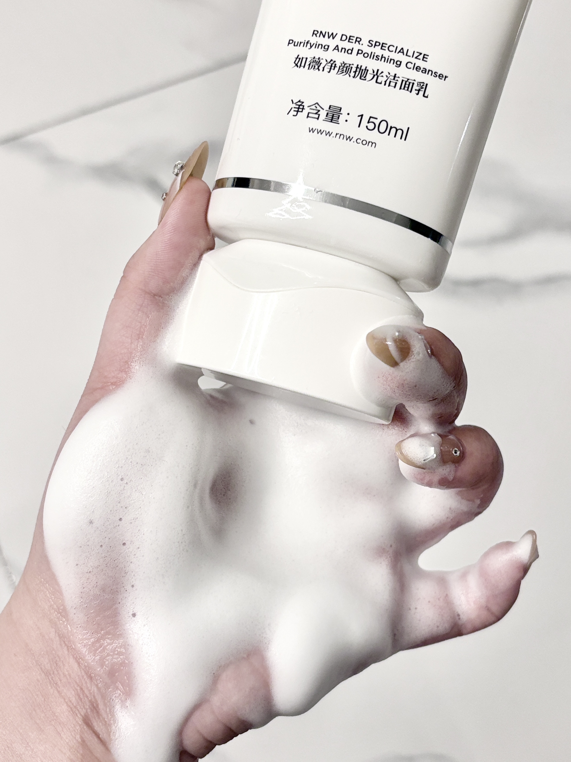 前段时间熬夜熬的脸又黄又垮 用了RNW这支抛光洗面奶还挺不错 质地像酸奶一样细腻 蛮好推开的 里面还有木瓜蛋白酶和白睡莲花 温和洗去氧化的角质同时 还能预防皮肤糖化 改善出油暗沉 我这个干敏肌用着也hin舒服 打出来的泡沫敲击绵密丰富 上脸柔和不刺激 洗完也不拔干 连平时涂的防晒或者素颜霜也能洗掉 清洁力在线 感觉脸蛋干净了不少 素颜也亮了些 而且大容量用着不心疼