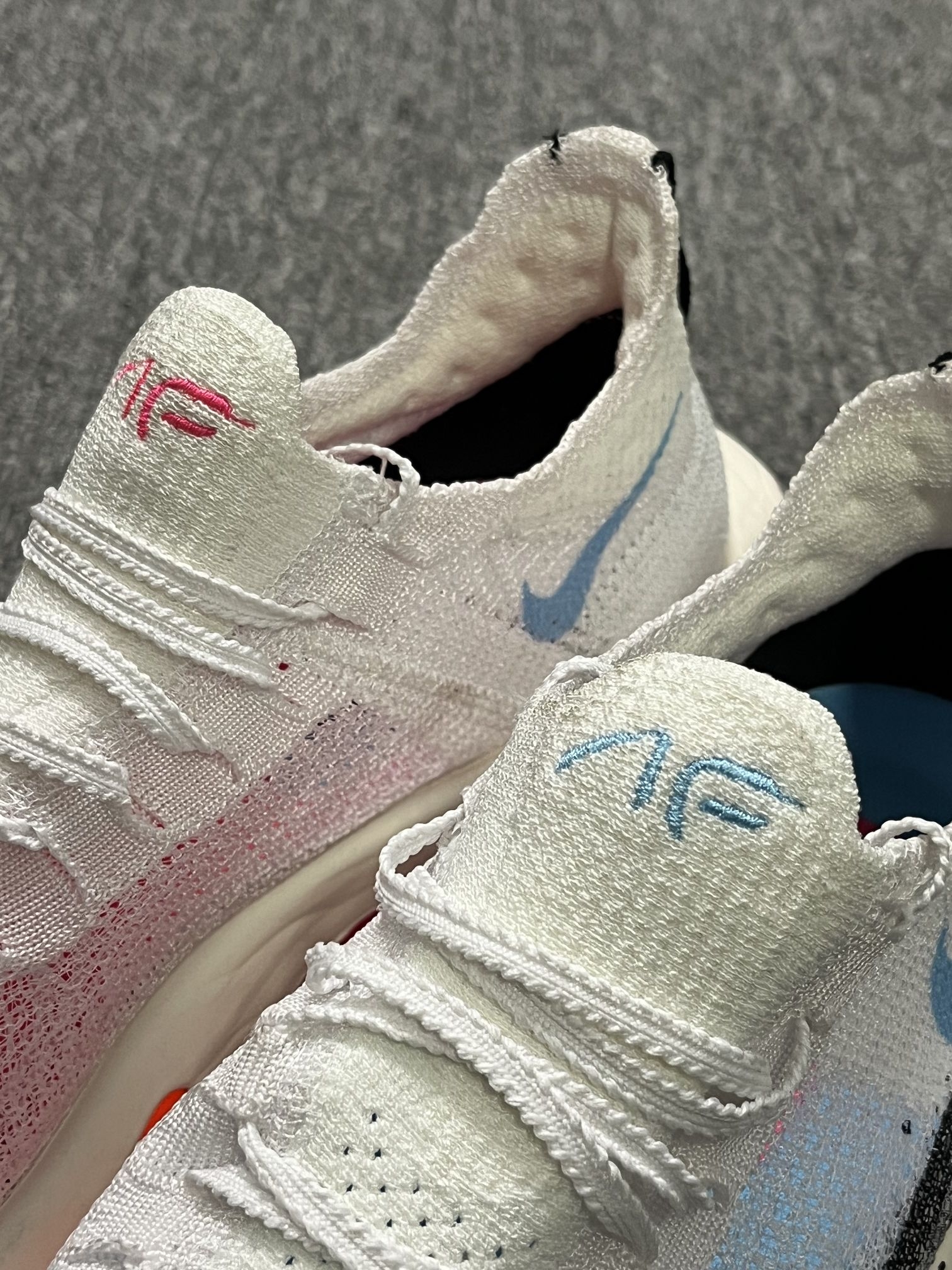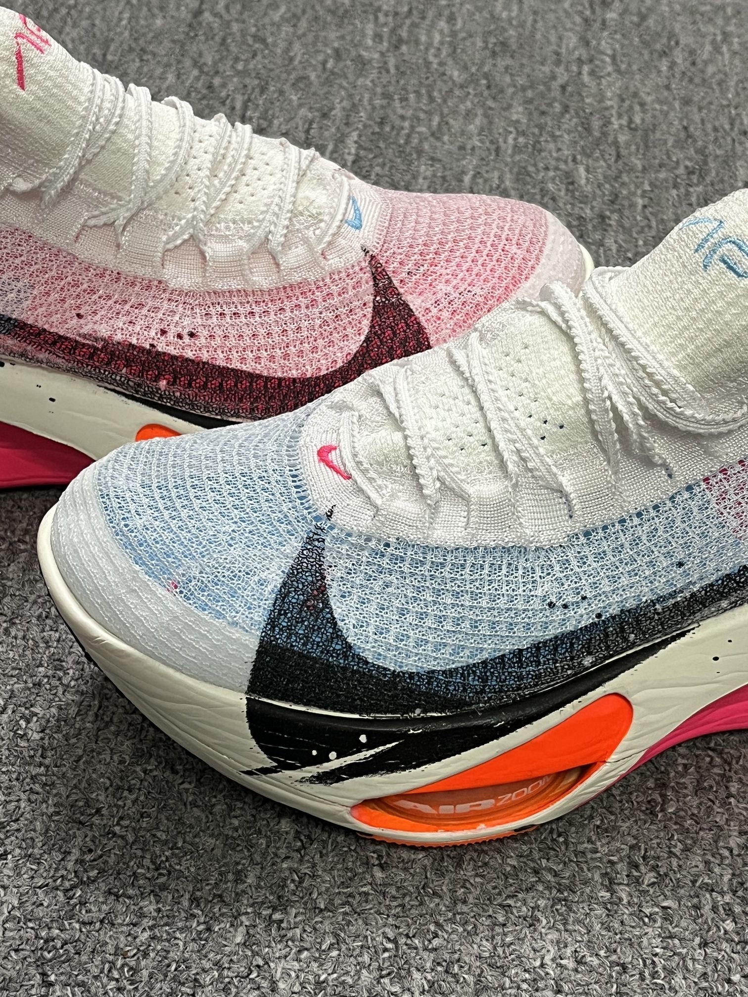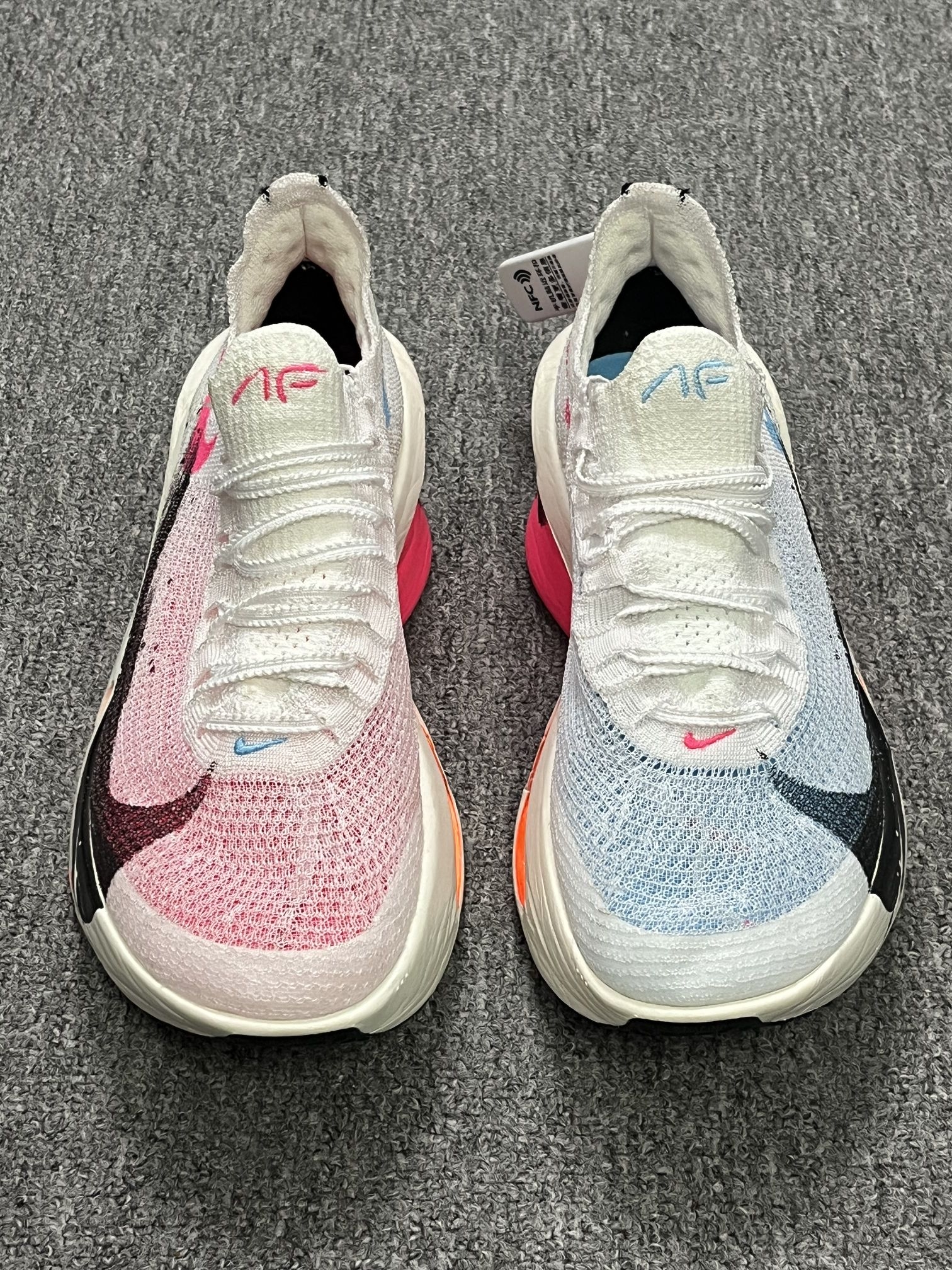 今天给大家分享一双Nike阿尔法三跑鞋。 鞋子整体采用白黑粉的配色,看起来颜值特别高,鞋面上的大Logo看起来非常有辨识度,中底采用后掌Zoom X科技和前掌的两个Zoom Air气垫。整体的脚感很不错。 这双鞋比较适合在跑马拉松的时候穿。这双鞋子我是按照我平时穿的尺码选择的。