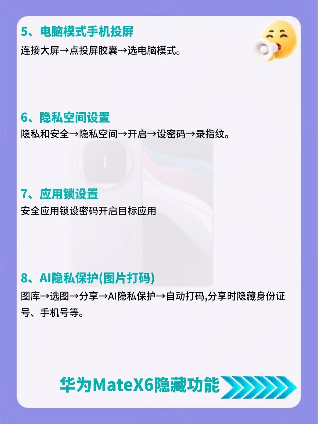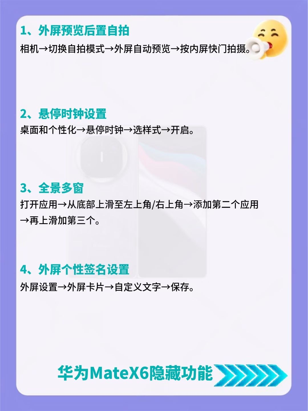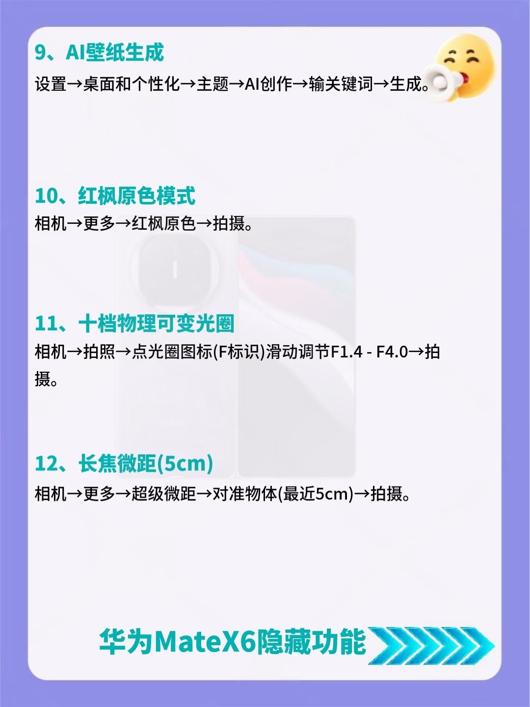 建议收藏!华为MateX6超详细内容来了🔥 后悔没早发现!华为MateX6竟藏了39个超香隐藏功能😎 好多人都不知道这些宝藏功能,赶紧码住挨个试试,说不定有你超需要的! 要是还知道其他好用的设置,也可以分享出来~