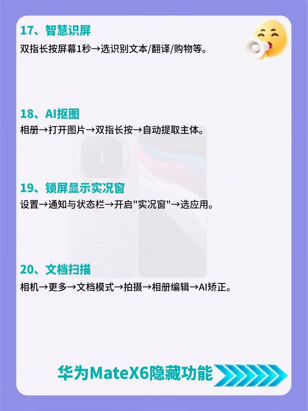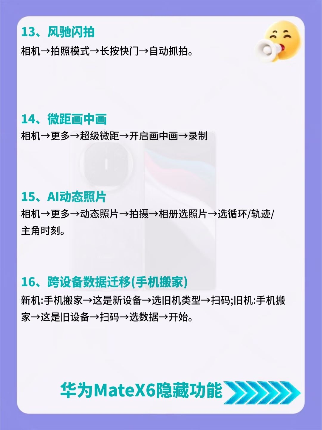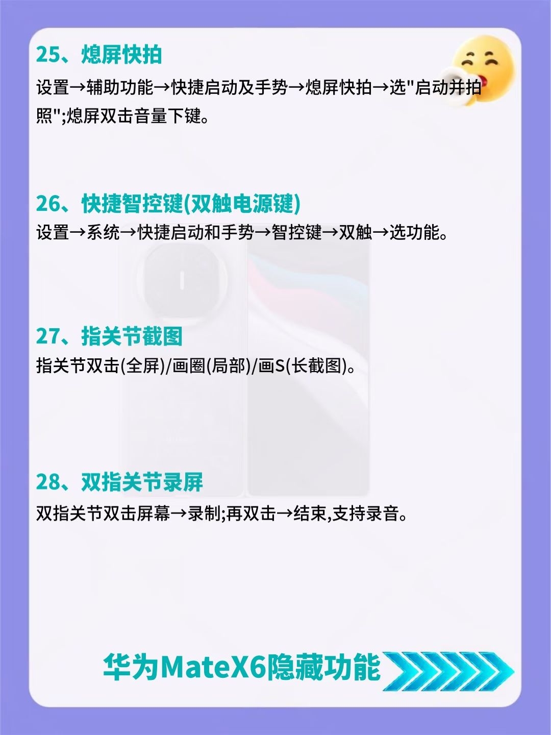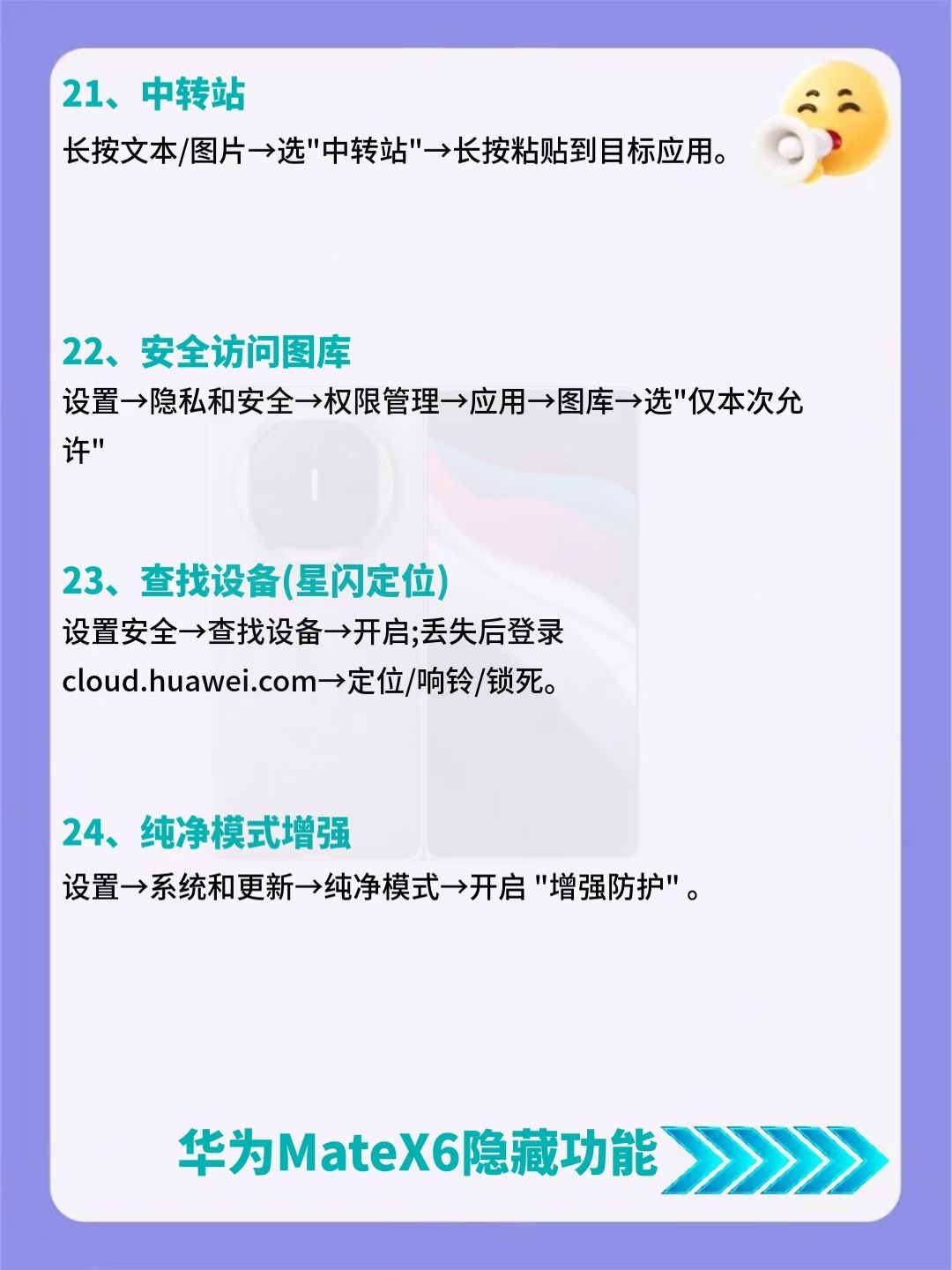 建议收藏!华为MateX6超详细内容来了🔥 后悔没早发现!华为MateX6竟藏了39个超香隐藏功能😎 好多人都不知道这些宝藏功能,赶紧码住挨个试试,说不定有你超需要的! 要是还知道其他好用的设置,也可以分享出来~