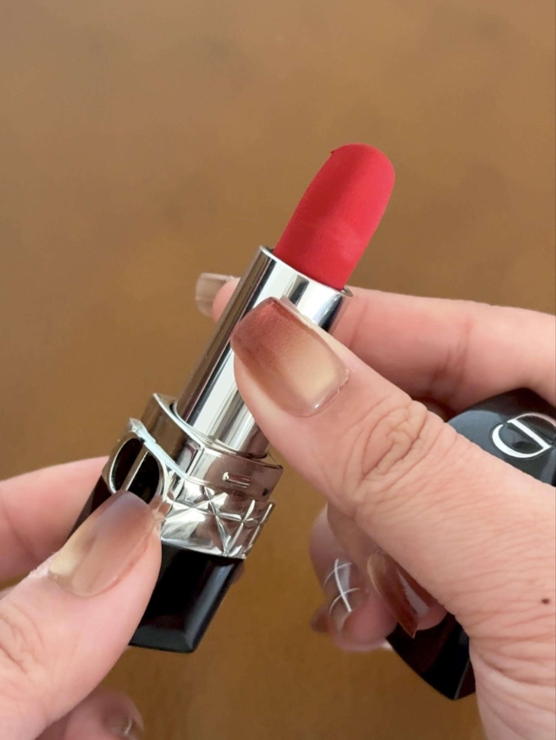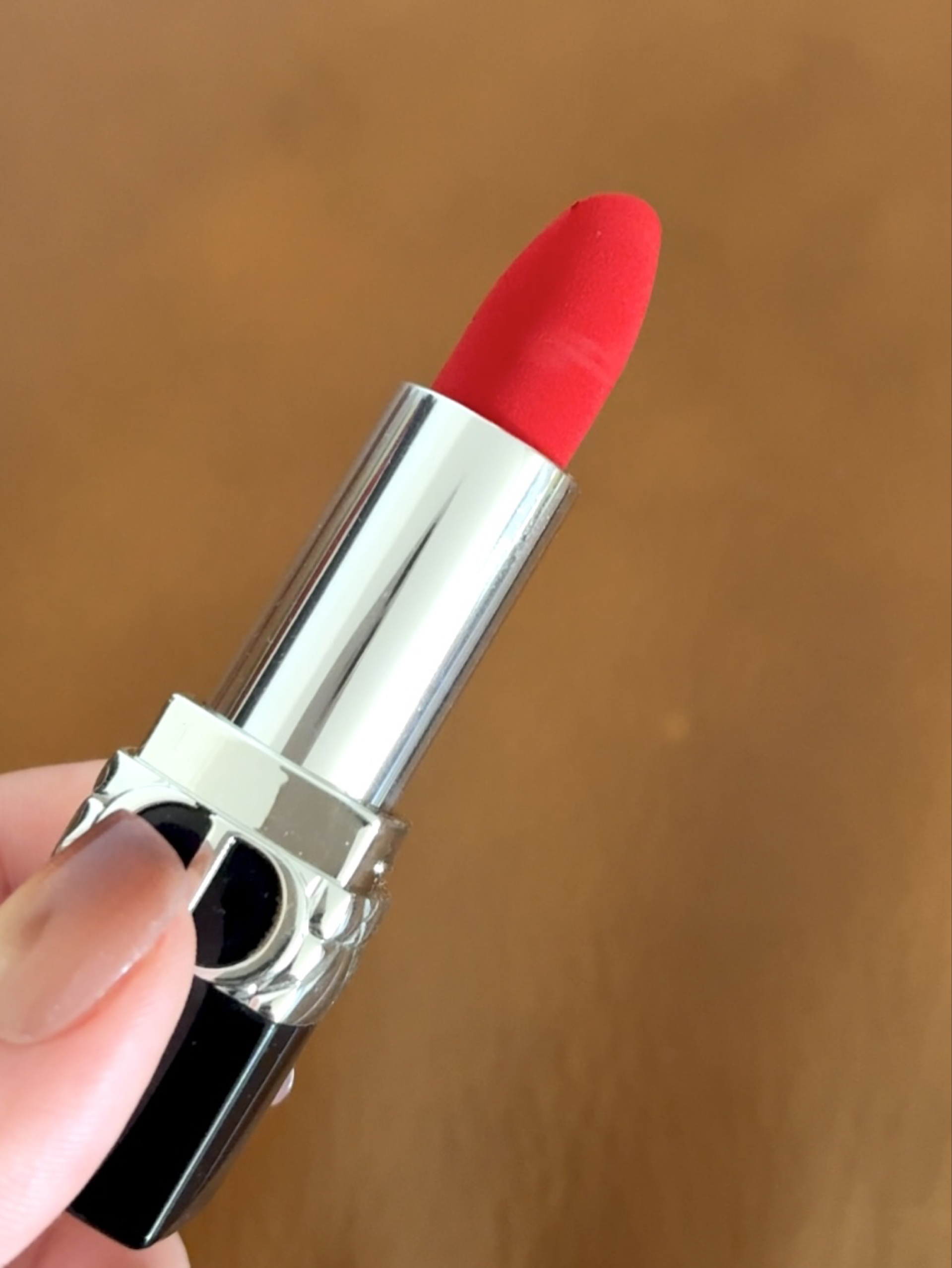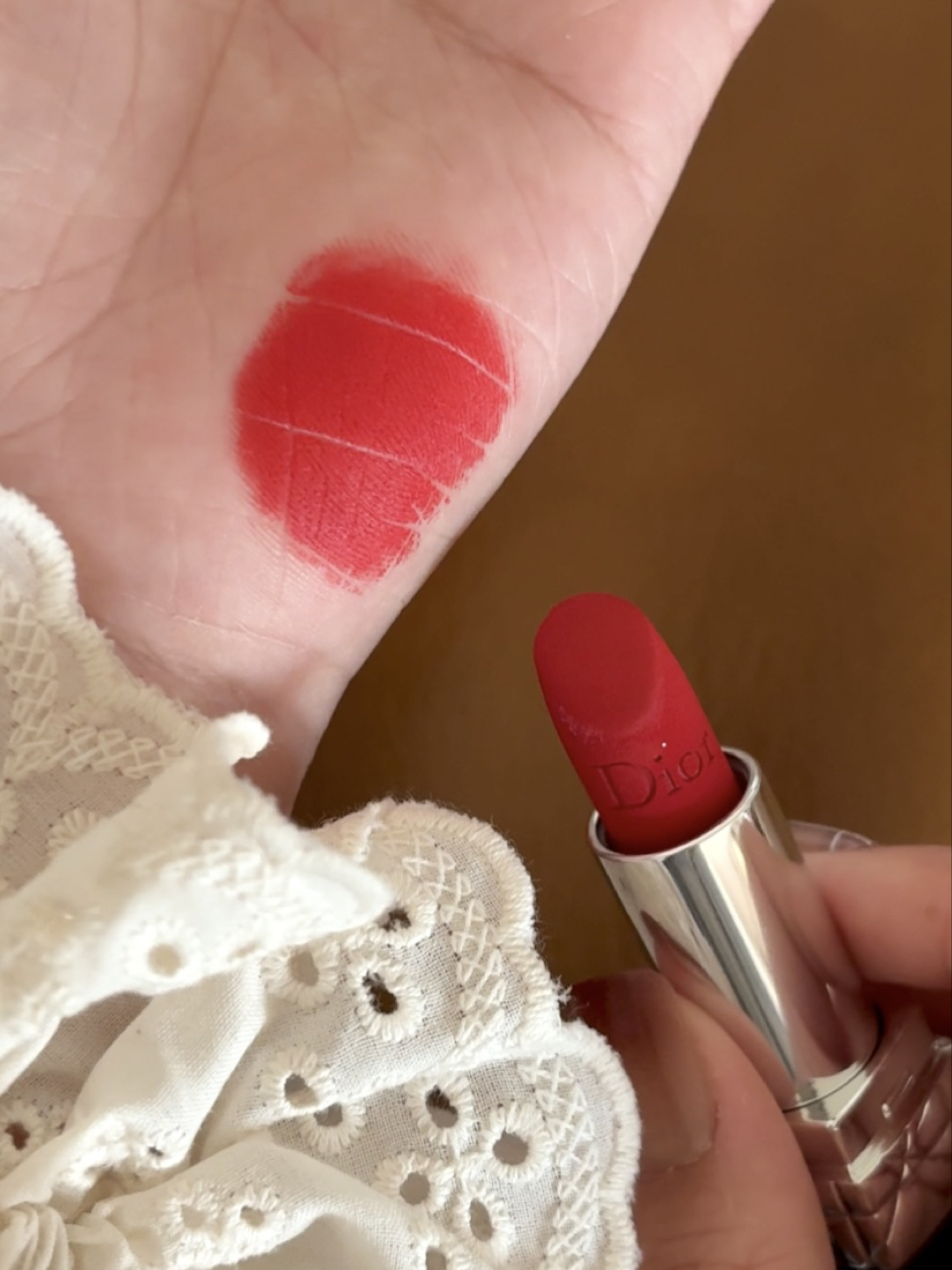 谁的化妆台还没支Dior999啊!经典正红真的永远不会出错,我入的是丝绒款,上嘴哑光雾面但一点不拔干,显色度直接拉满 黄皮涂也巨显白,薄涂是元气草莓红,日常素颜涂都提气色;厚涂就是气场全开的正宫红,约会、通勤、聚会怼脸涂都超合适~ 膏体上的Dior浮雕细节感拉满,外壳的黑金设计也超有质感,不愧是口红界的扛把子,这支真的能传家了