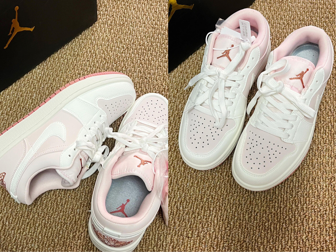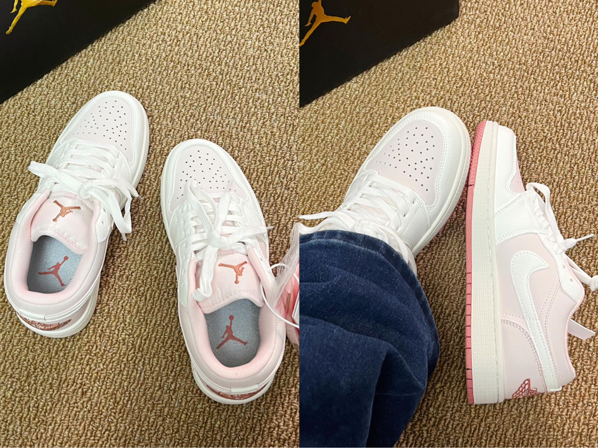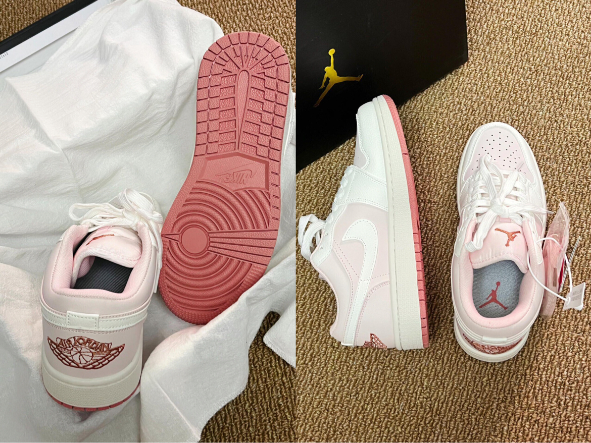 这双樱花粉AJ1 Low的皮质摸起来偏软,鞋身的浅粉调很温柔,搭配白鞋身不会显黑。鞋底的豆沙红纹路抓地还可以,鞋舌的飞人标做工也比较细致,日常搭配牛仔裤、运动装都很合适,就是鞋面包裹性一般,透气性中规中矩。
