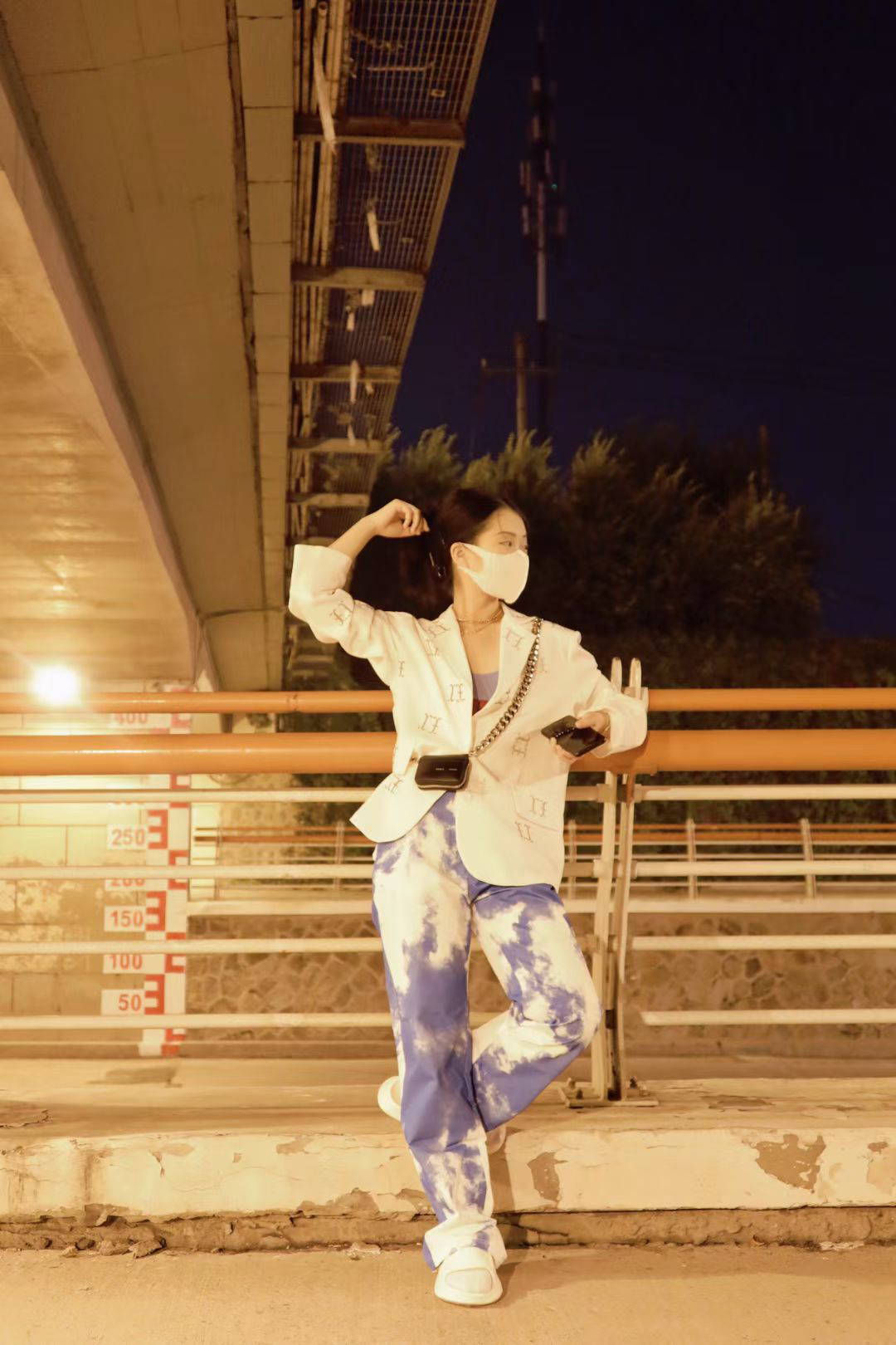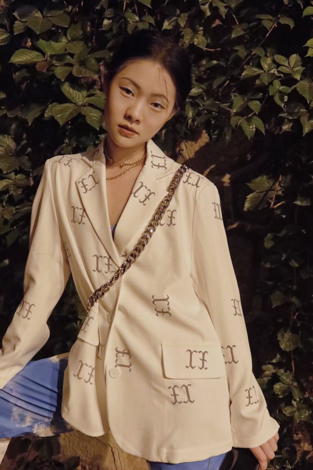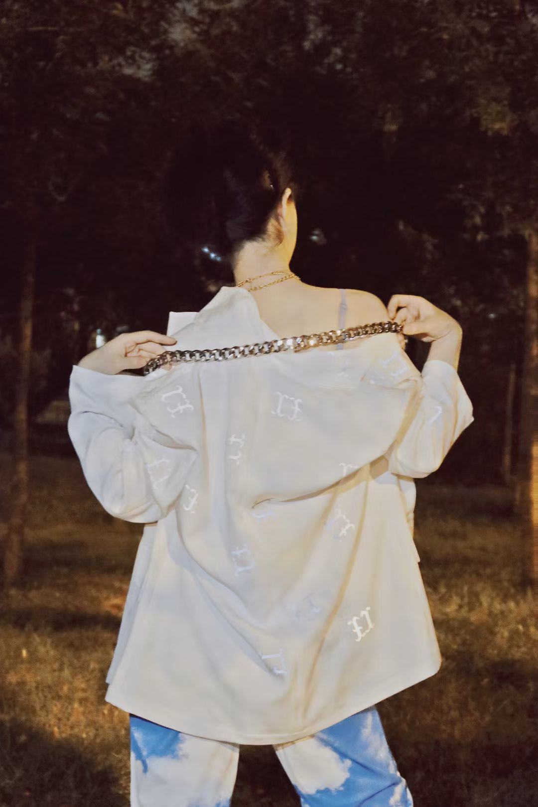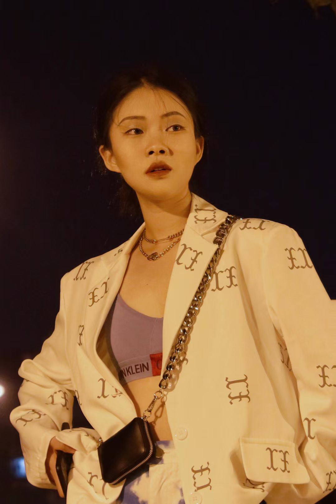 白字母西装搭CK内搭+扎染裤,金属链饰点睛✨,慵懒里裹着街头拽酷气场🆒