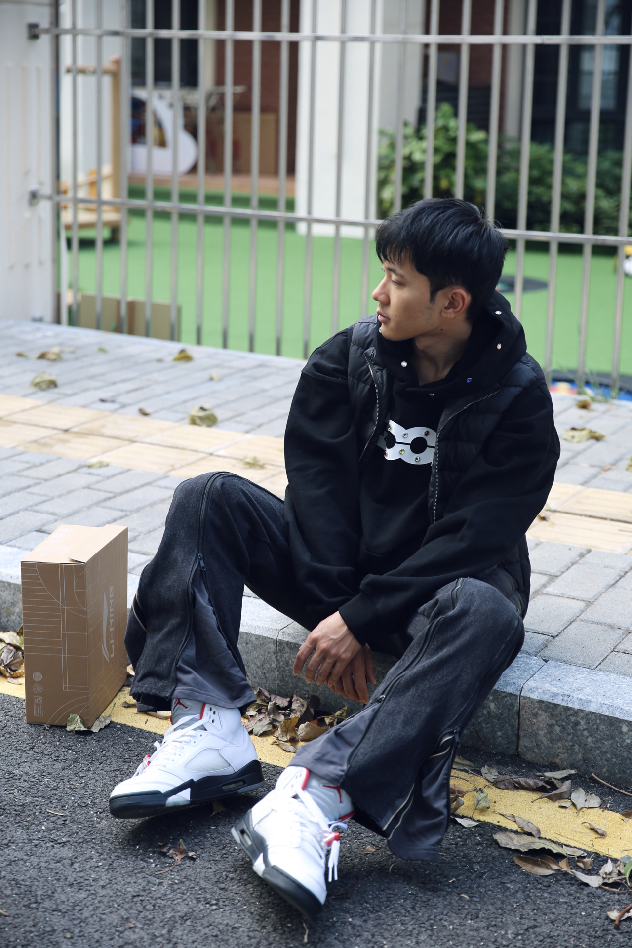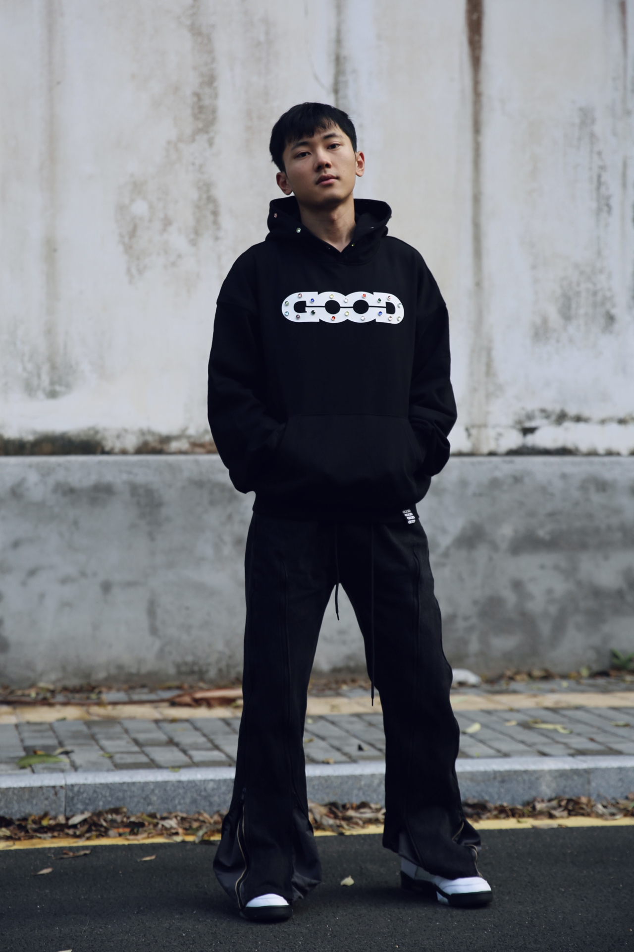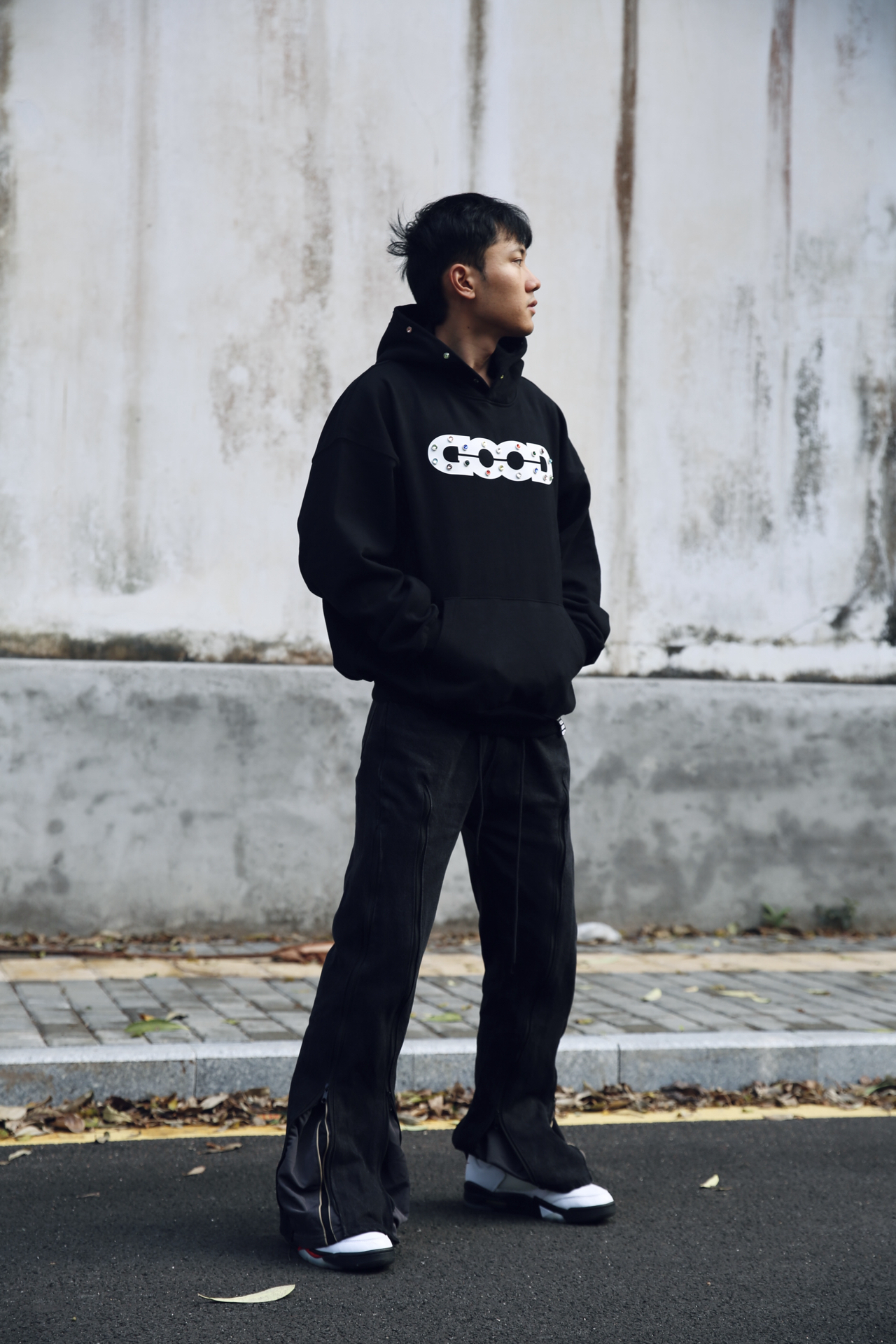 卫衣穿搭真的很多,但柔软毛圈面料这种,上身的舒适度还是很直观的。 今天这套上衣选的是 GOODBRAND 的黑色连帽套头卫衣,面料偏软,穿着很放松,日常出门不会有拘束感。 细节上我比较喜欢的是 logo 位置的彩色小钻,还有帽子边缘一圈的设计,点缀得刚好,不会太抢,但看得出有用心。 下身搭了一条带拉链细节的机能感喇叭裤,整体轮廓比较顺。鞋子选了 AJ5 流川枫,给整套增加一点少年感和运动氛围...