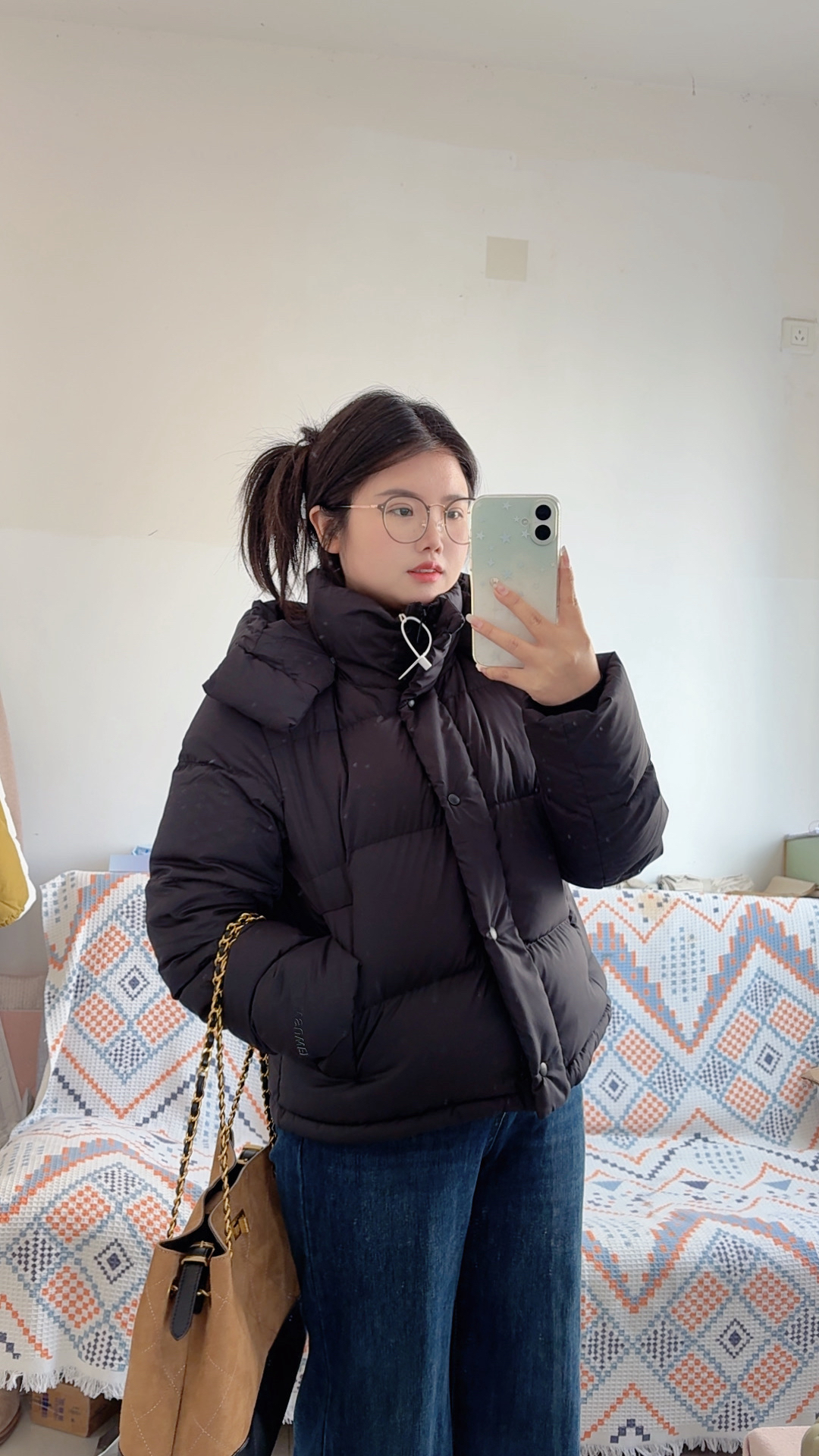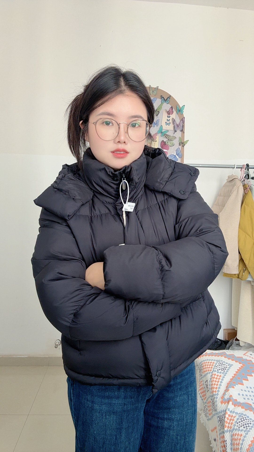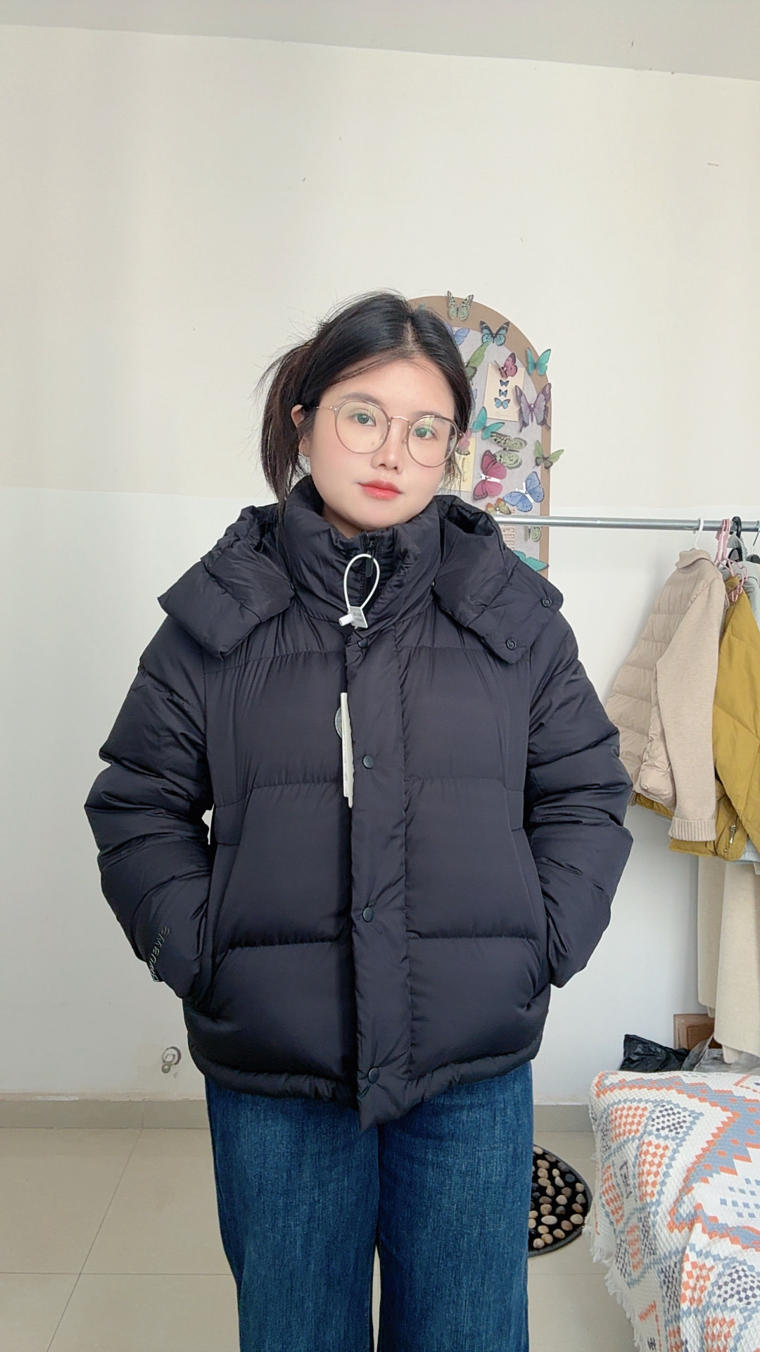 这件黑色短款羽绒服真的挖到宝了!立领连帽设计兼顾保暖与利落,蓬松度刚好不会显臃肿,小个子也能轻松驾驭。面料摸起来软乎乎的,防风又轻便,搭配牛仔裤、卫裤都很适配。细节处的按扣和抽绳设计很贴心,日常通勤、出门逛街穿都合适,是冬日衣柜里少不了的实用款~