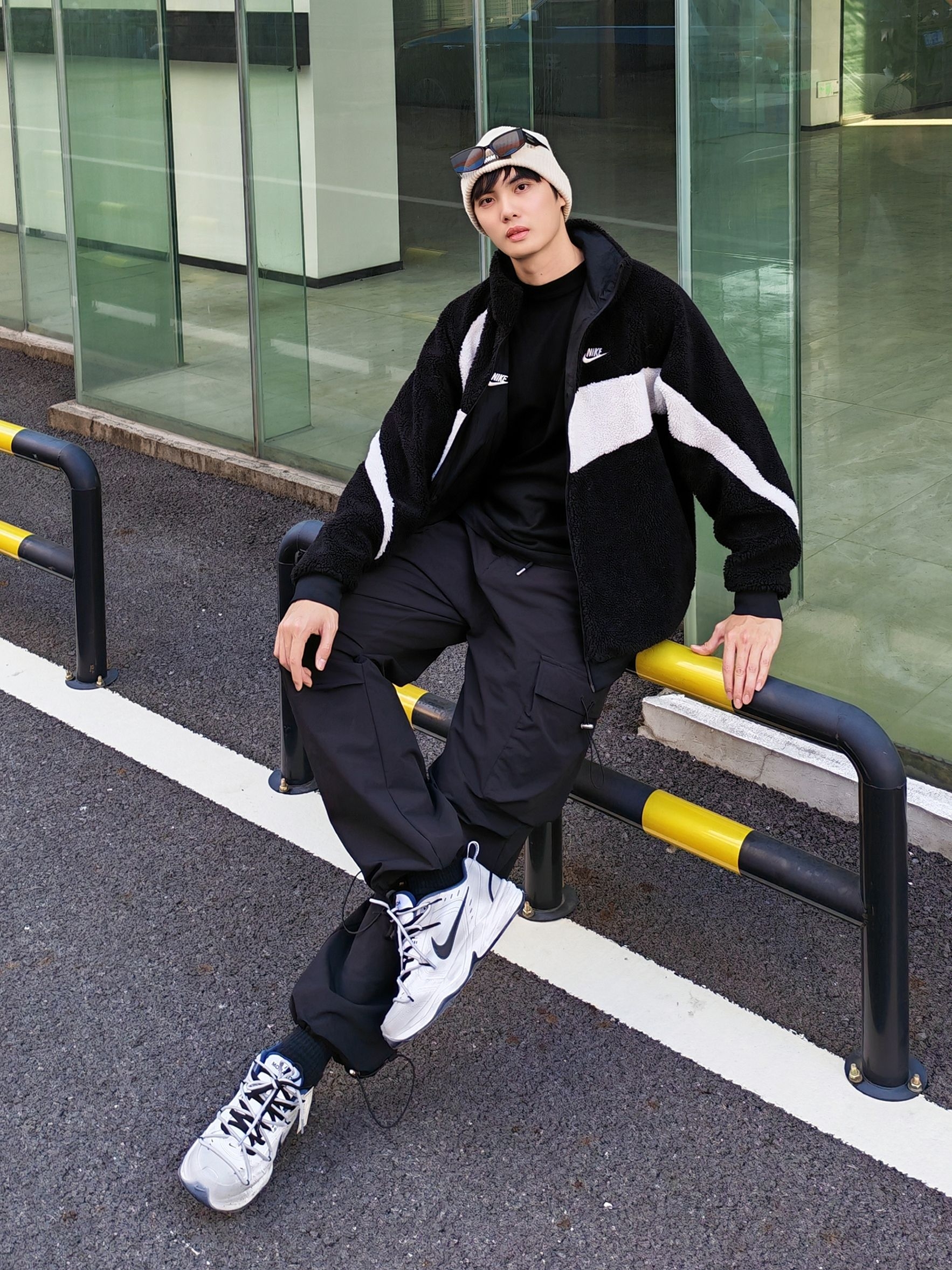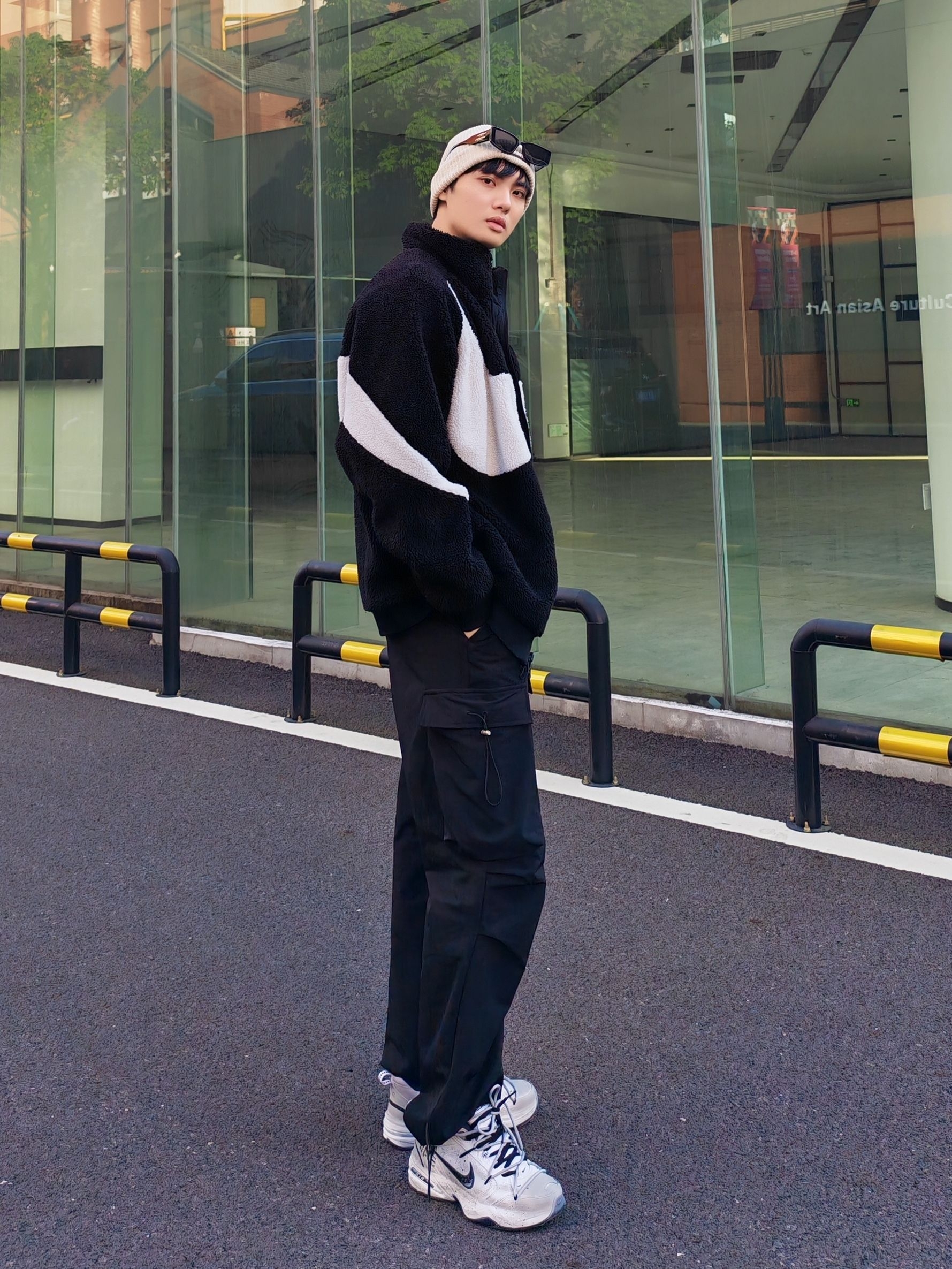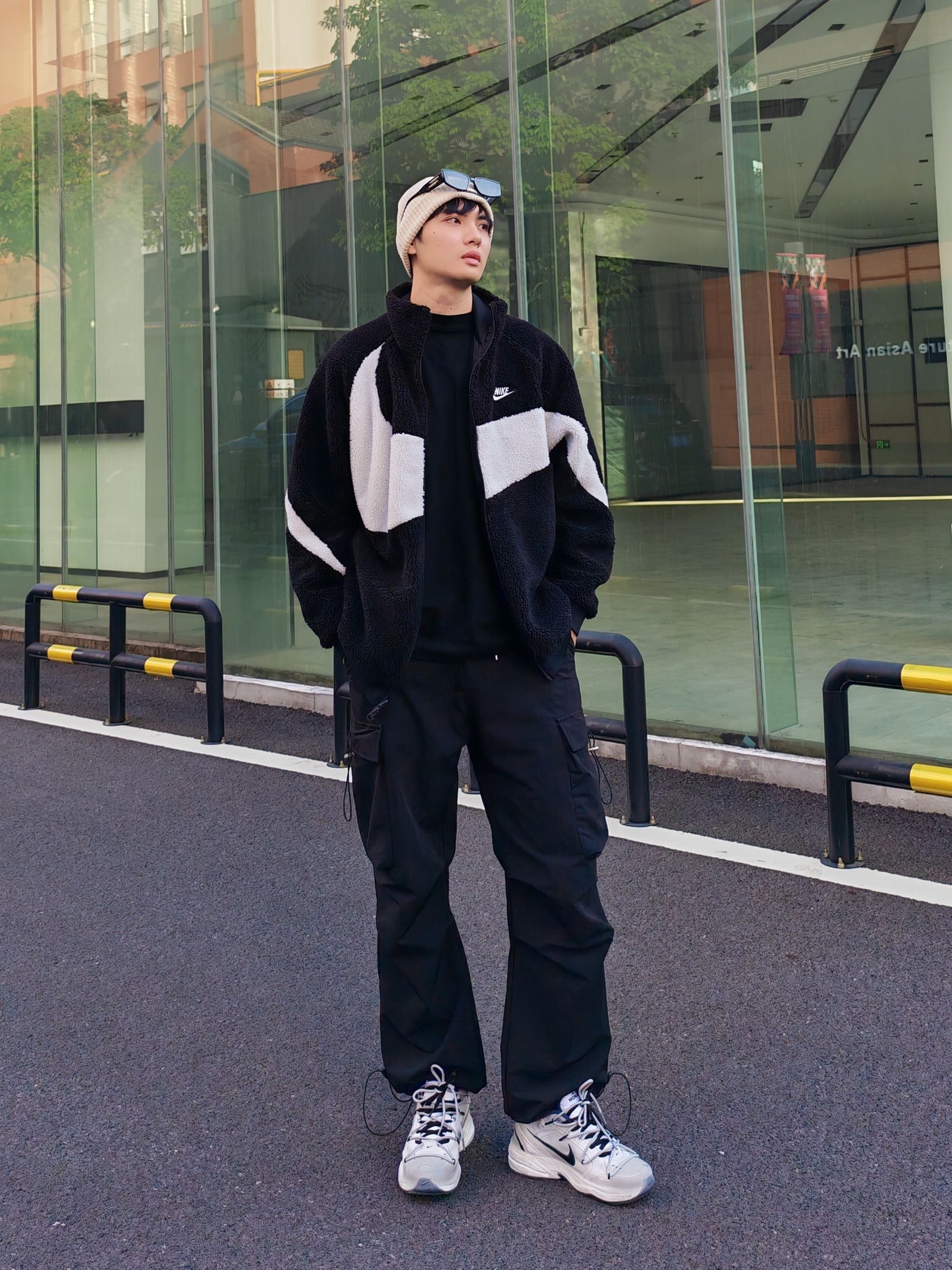hi 这里是镭子的秋冬氛围感穿搭分享 我的年度穿搭关键词是黑白系街头运动风yyds Nike黑白摇粒绒夹克双面穿超实用,搭配的黑色工装裤是灵魂! 宽松阔腿版型藏肉又显腿长,抽绳+多口袋设计细节感拉满,裤脚收口还能完美露出熊猫dunk~ 冷帽+耳机点缀,街头少年范儿直接焊在身上💯