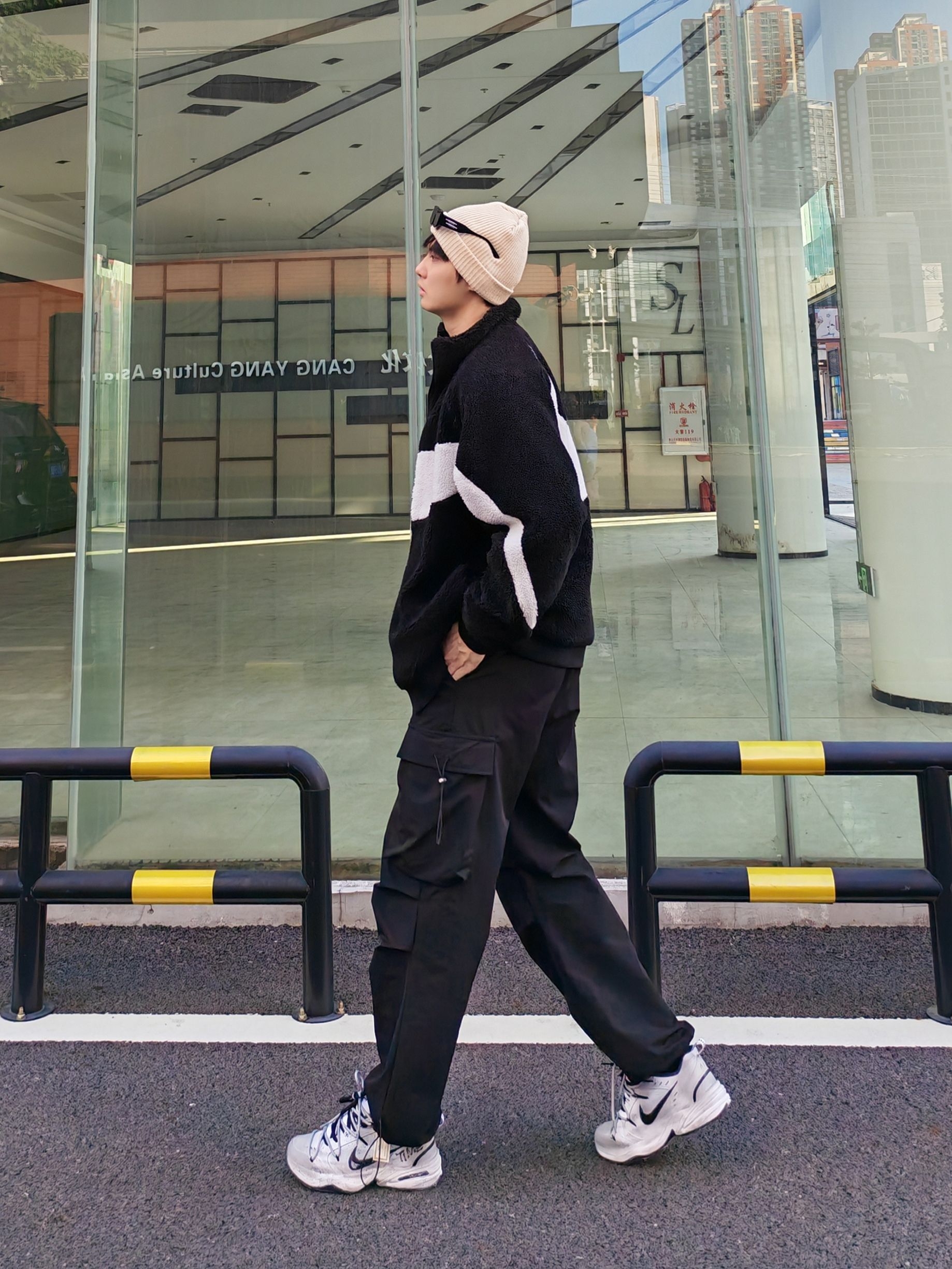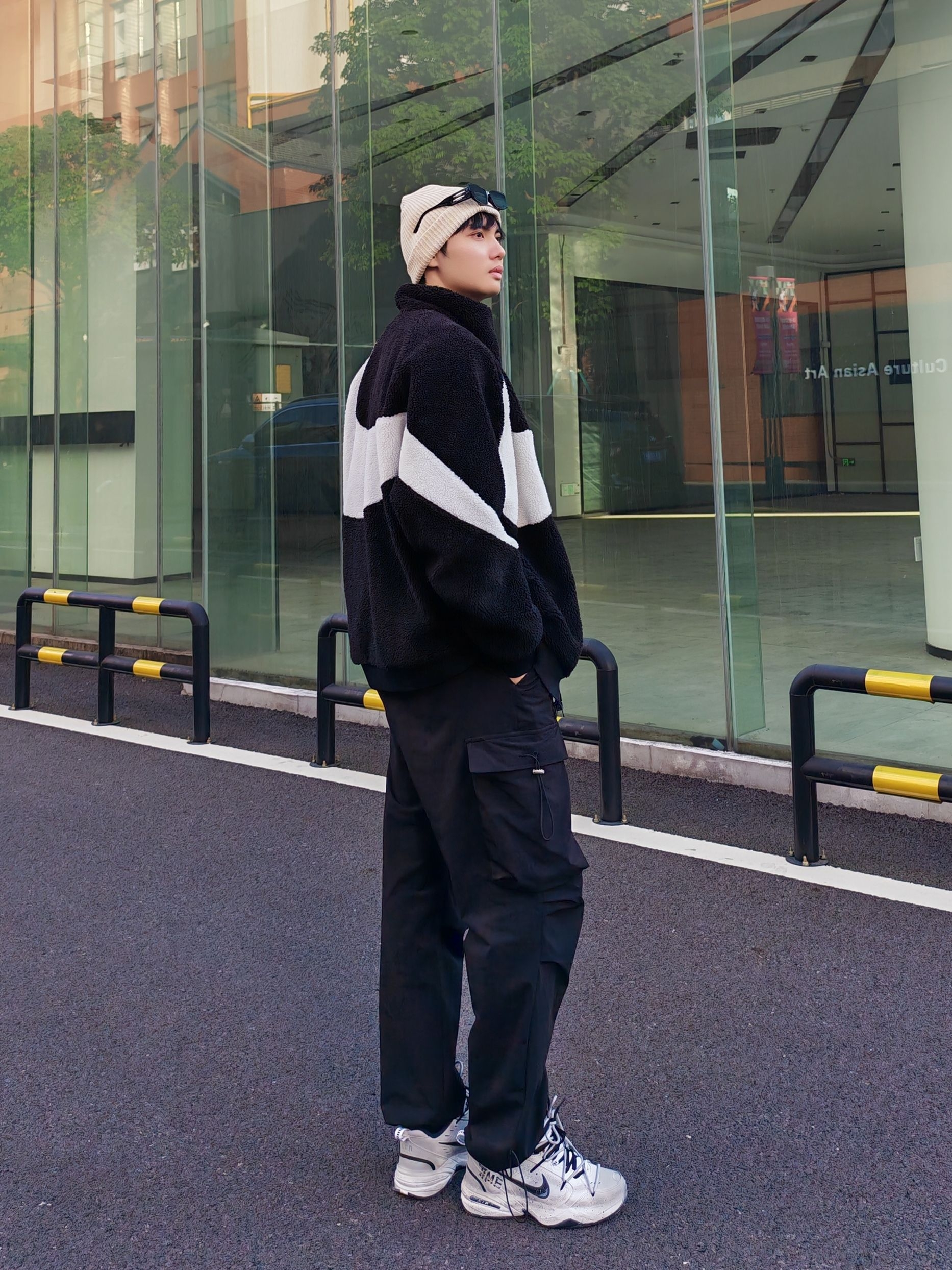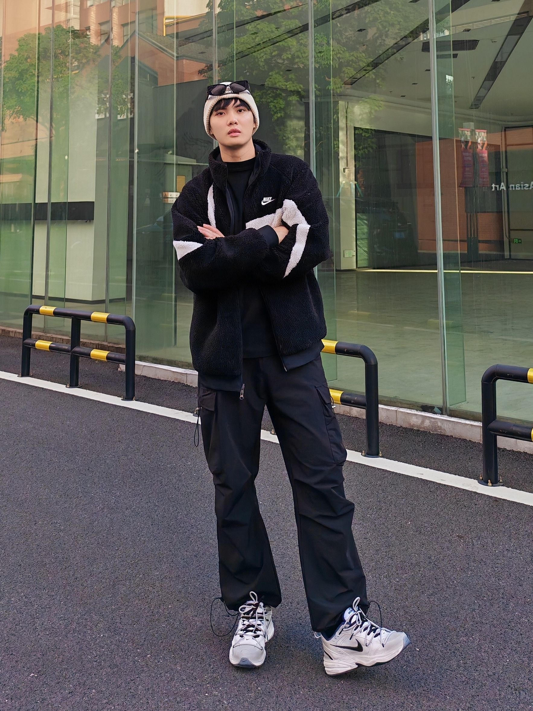 hi 这里是镭子的秋冬氛围感穿搭分享 我的年度穿搭关键词是黑白系街头运动风yyds Nike黑白摇粒绒夹克双面穿超实用,搭配的黑色工装裤是灵魂! 宽松阔腿版型藏肉又显腿长,抽绳+多口袋设计细节感拉满,裤脚收口还能完美露出熊猫dunk~ 冷帽+耳机点缀,街头少年范儿直接焊在身上💯