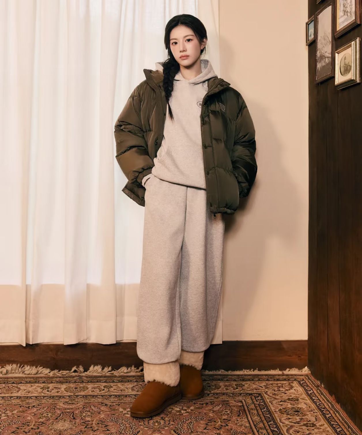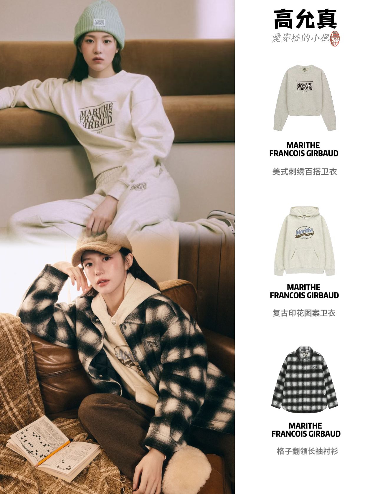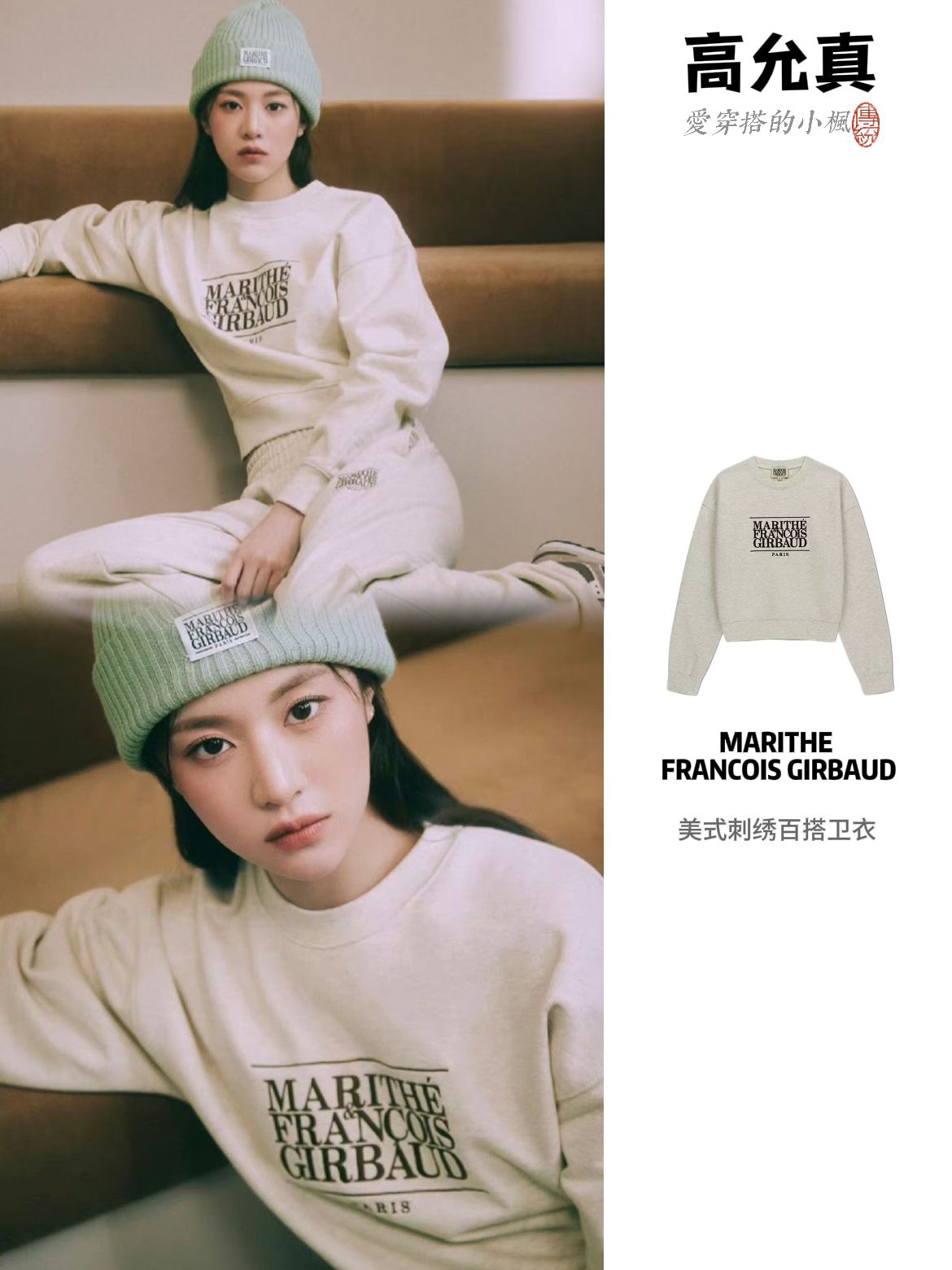 浅卡其卫衣配棕裤子,美拉德色系暖乎乎的,复古印花看着就舒服!有种懒懒的松弛感,还有这套MARITHE经典美式刺绣卫衣和休闲裤,搭配薄荷绿针织帽,青春少女感~