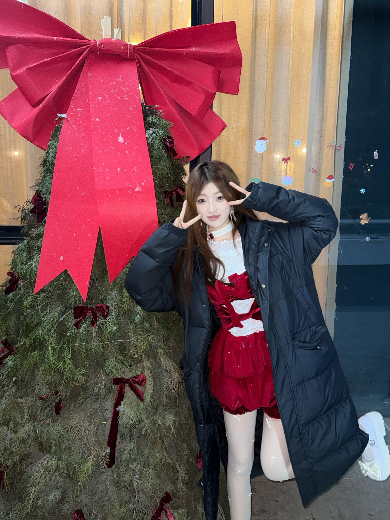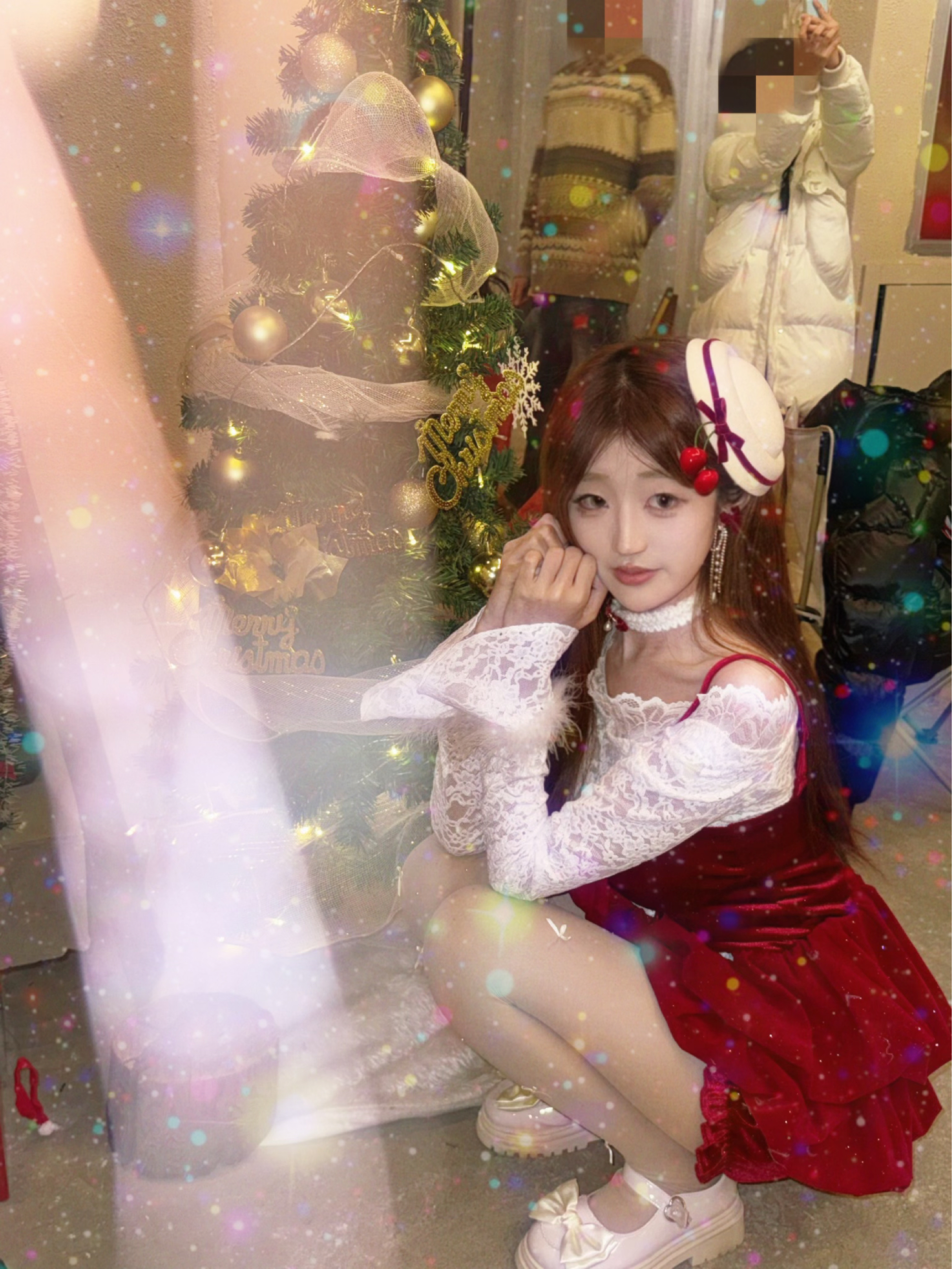 圣诞甜妹穿搭被我找到啦!酒红丝绒蓬蓬裙配白色蕾丝内搭,毛绒袖口软乎乎的,再搭双带闪十字白丝,简直是点睛之笔,圣诞局穿这个直接美成焦点~