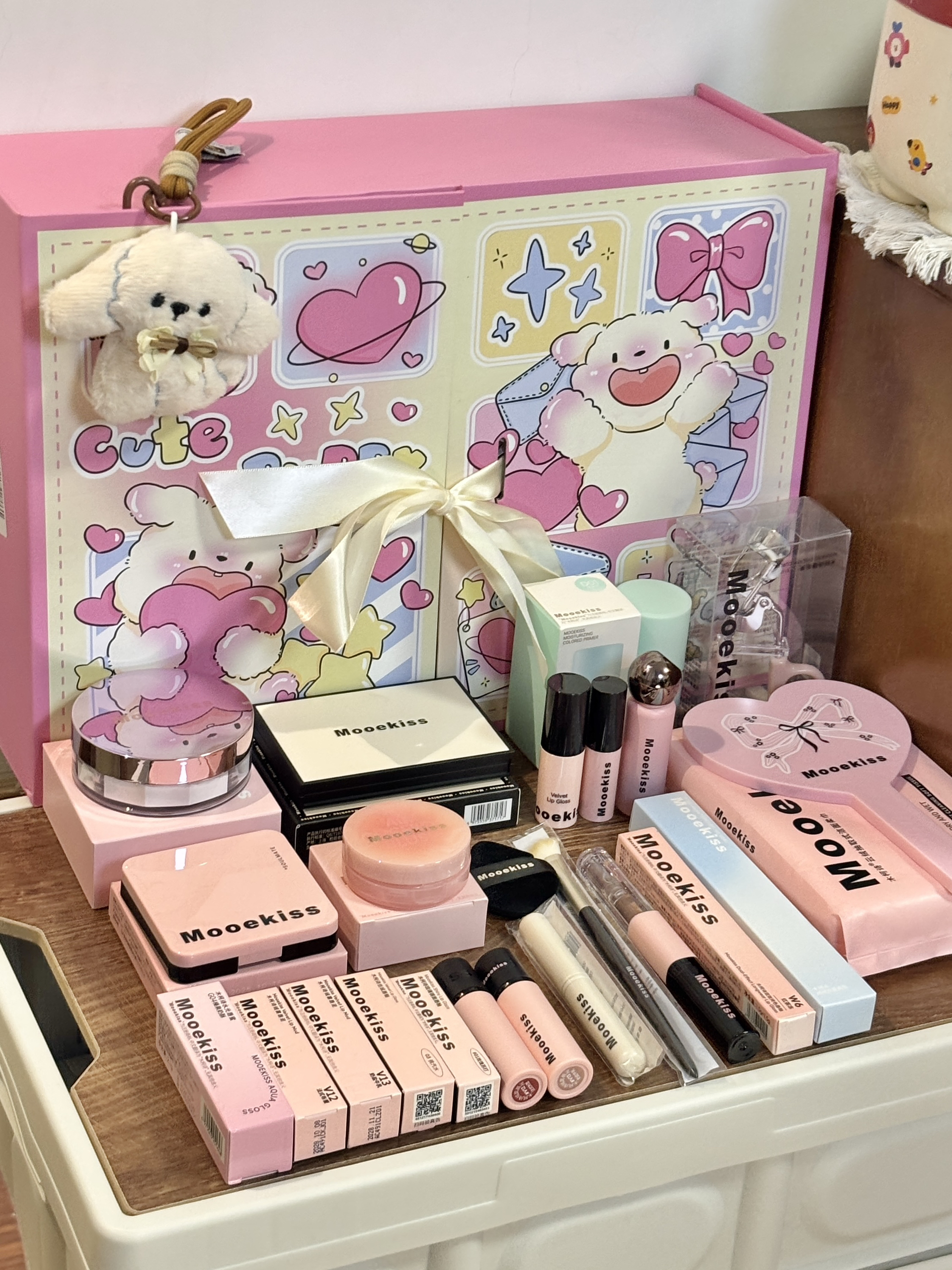 哪有女孩子会拒绝这么一大盒呀 素介个木柯诗心意满满彩妆礼盒 还是粉粉的礼盒 好让人心动诶 里面有唇釉 双头唇釉 修容盘 眼影盘 腮红 一套蛮齐全的 日常化妆都能用上 眼影粉质挺细腻的 不会飞粉 我觉得唇釉的显色度也ok 单拎出来都是他家热卖色 新手也不出错 拿来送圣诞礼物或者自用都敲合适