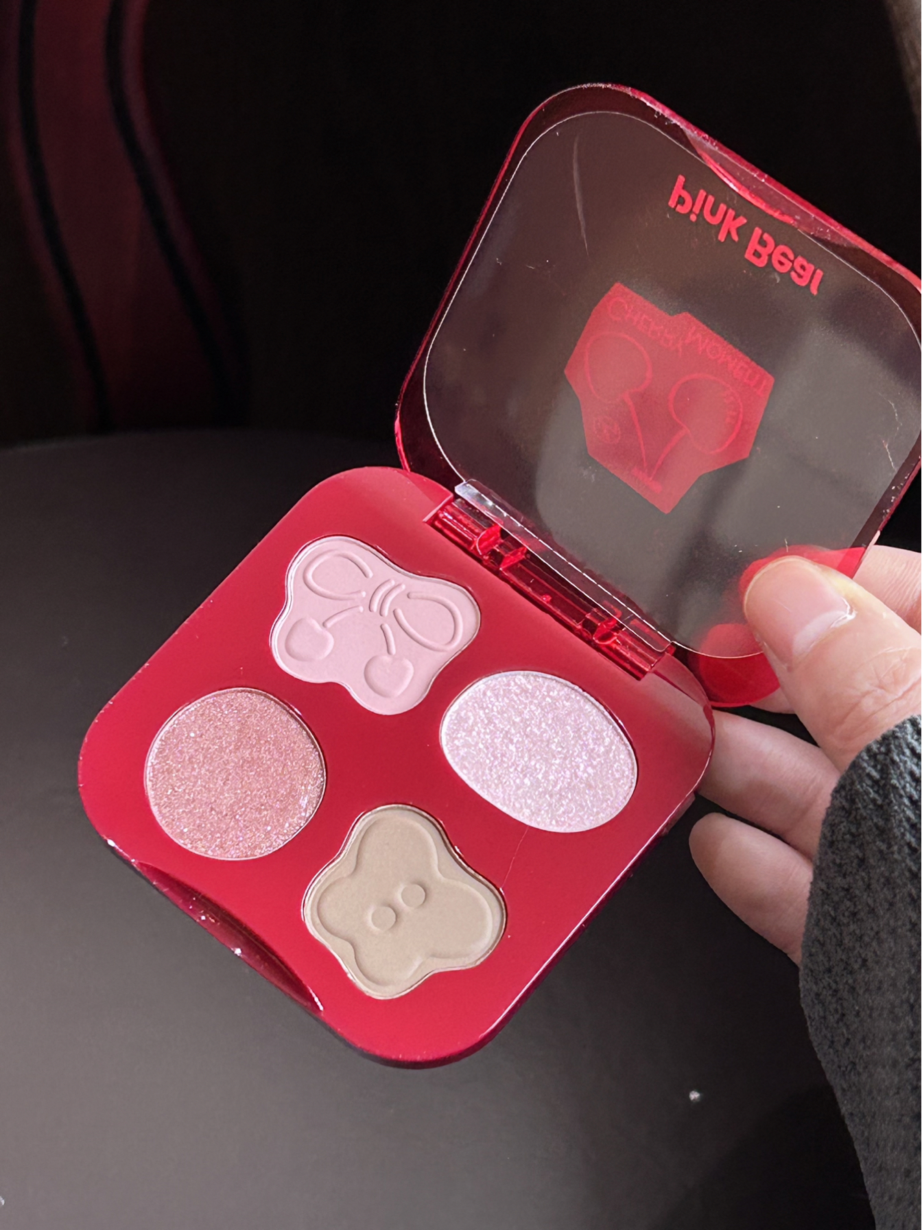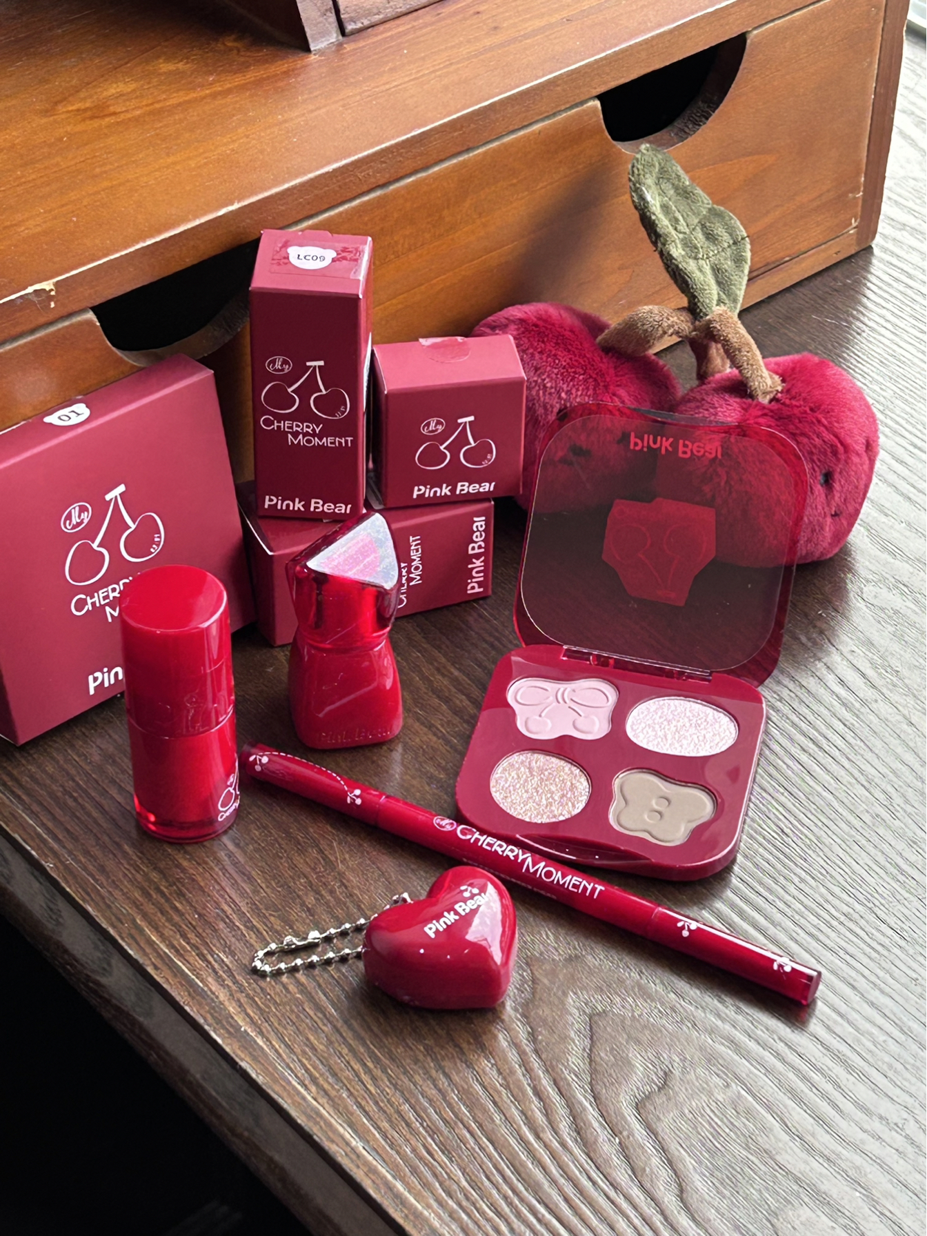 是介个皮可熊的新年限定彩妆诶 红色看着喜庆又大气 一套里面眼影 丰唇蜜 多用霜 眼线笔都给我们准备好啦 还有个可爱的小樱桃挂件 拆开我就忍不住试了下 丰唇蜜涂上嘴巴嘟嘟的 颜色也显嫩 眼影盘粉质很细腻不会飞粉 眼线胶笔用起来丝滑 持妆效果也很好 樱桃挂件挂在包包上也敲可爱的 感觉作为新年礼物送npy好合适
