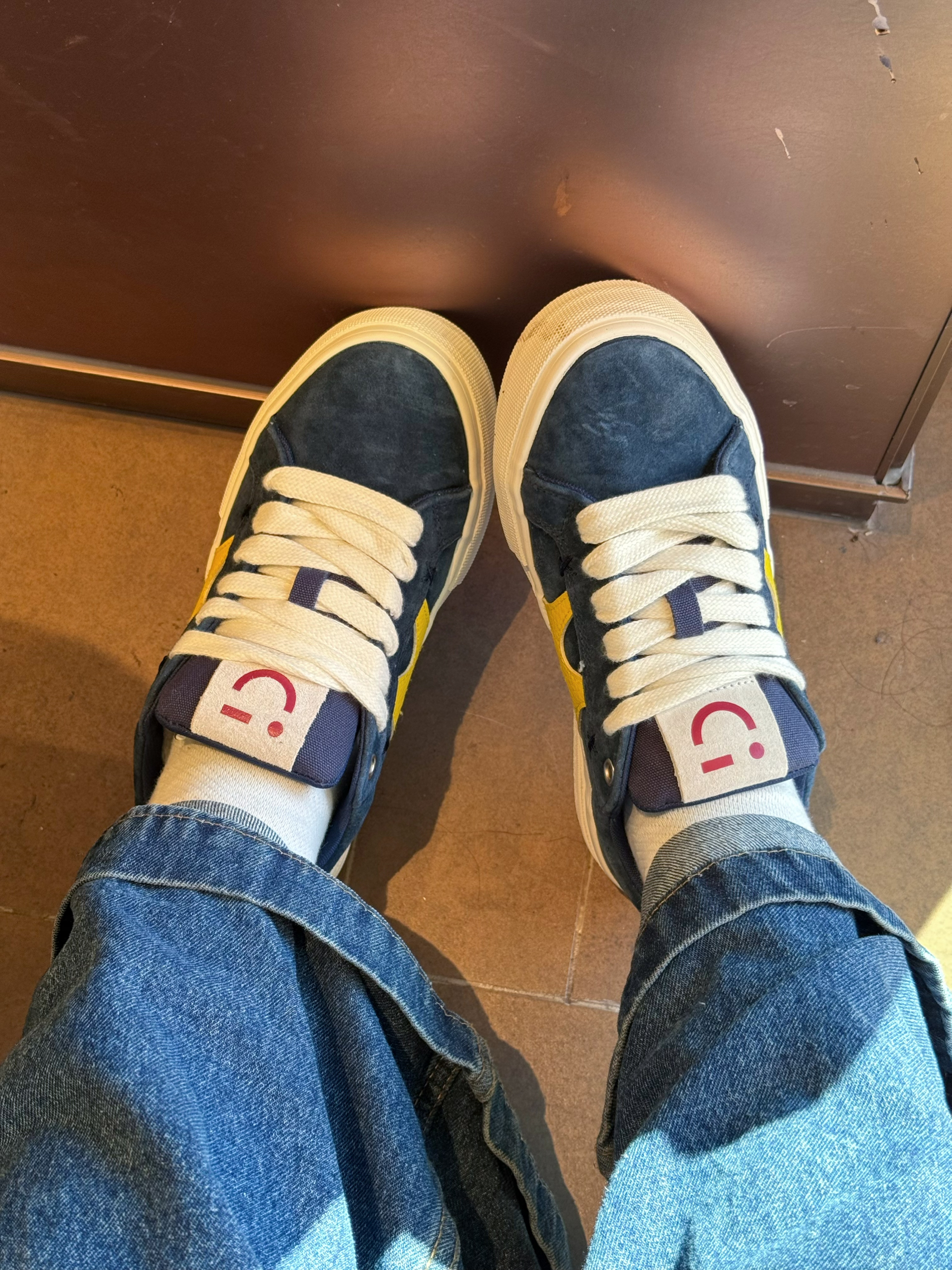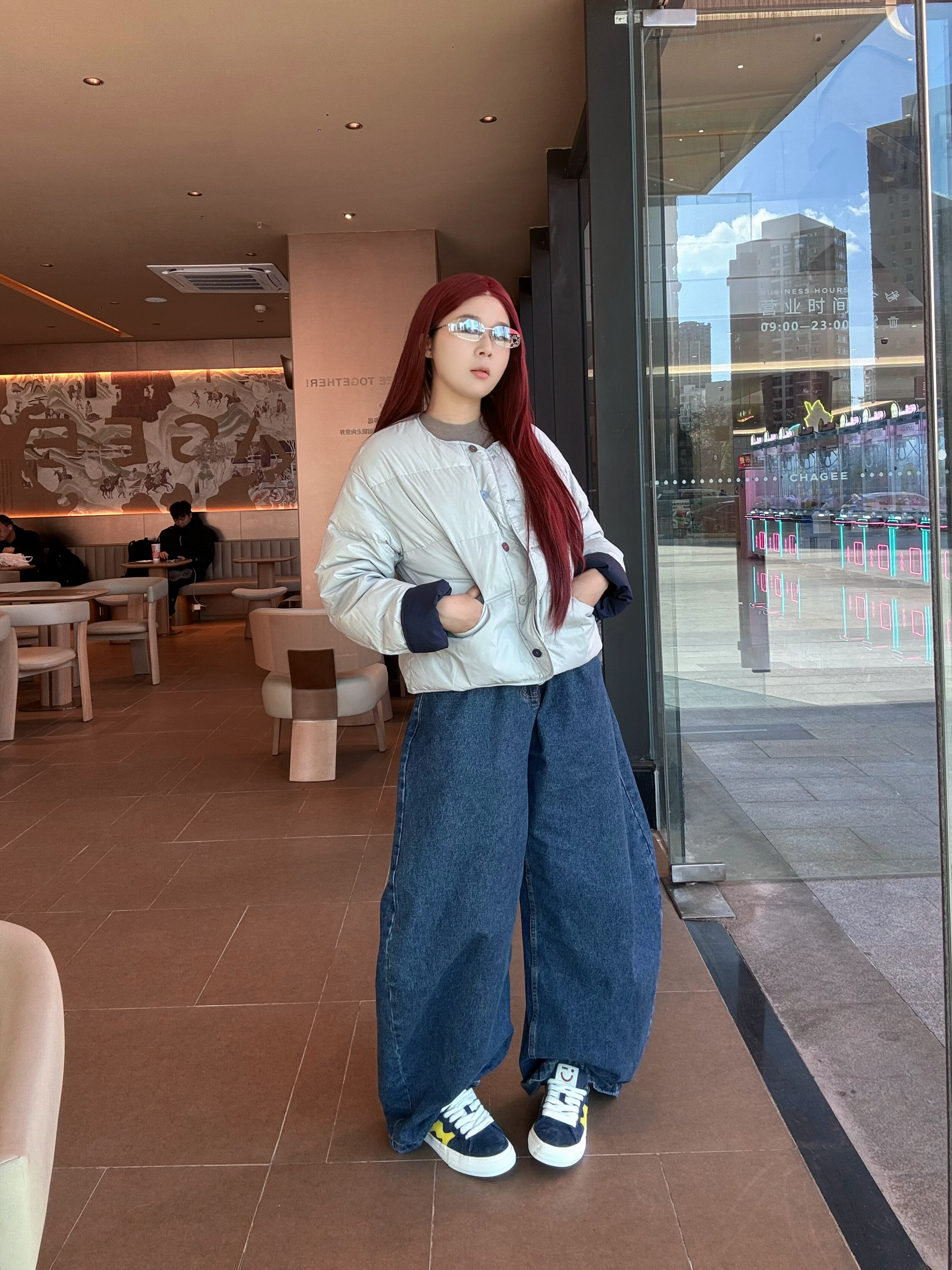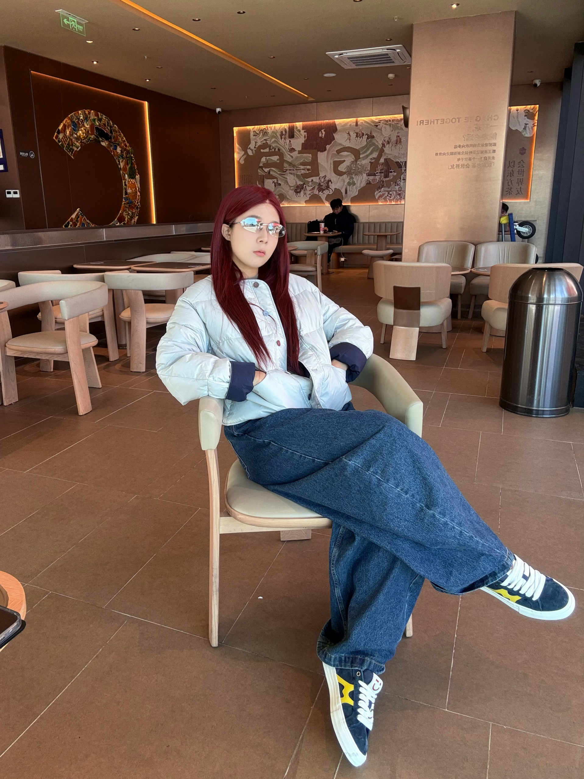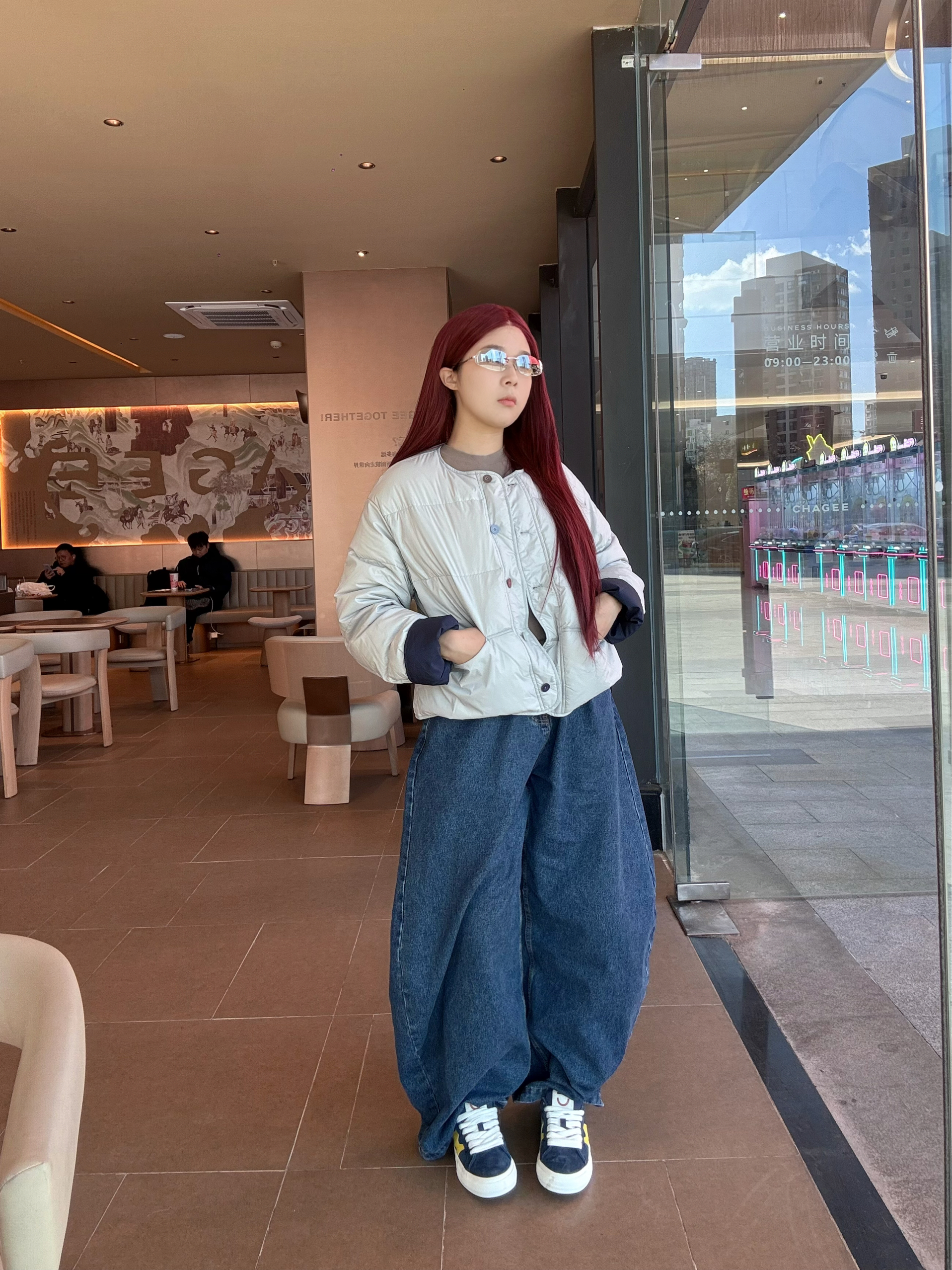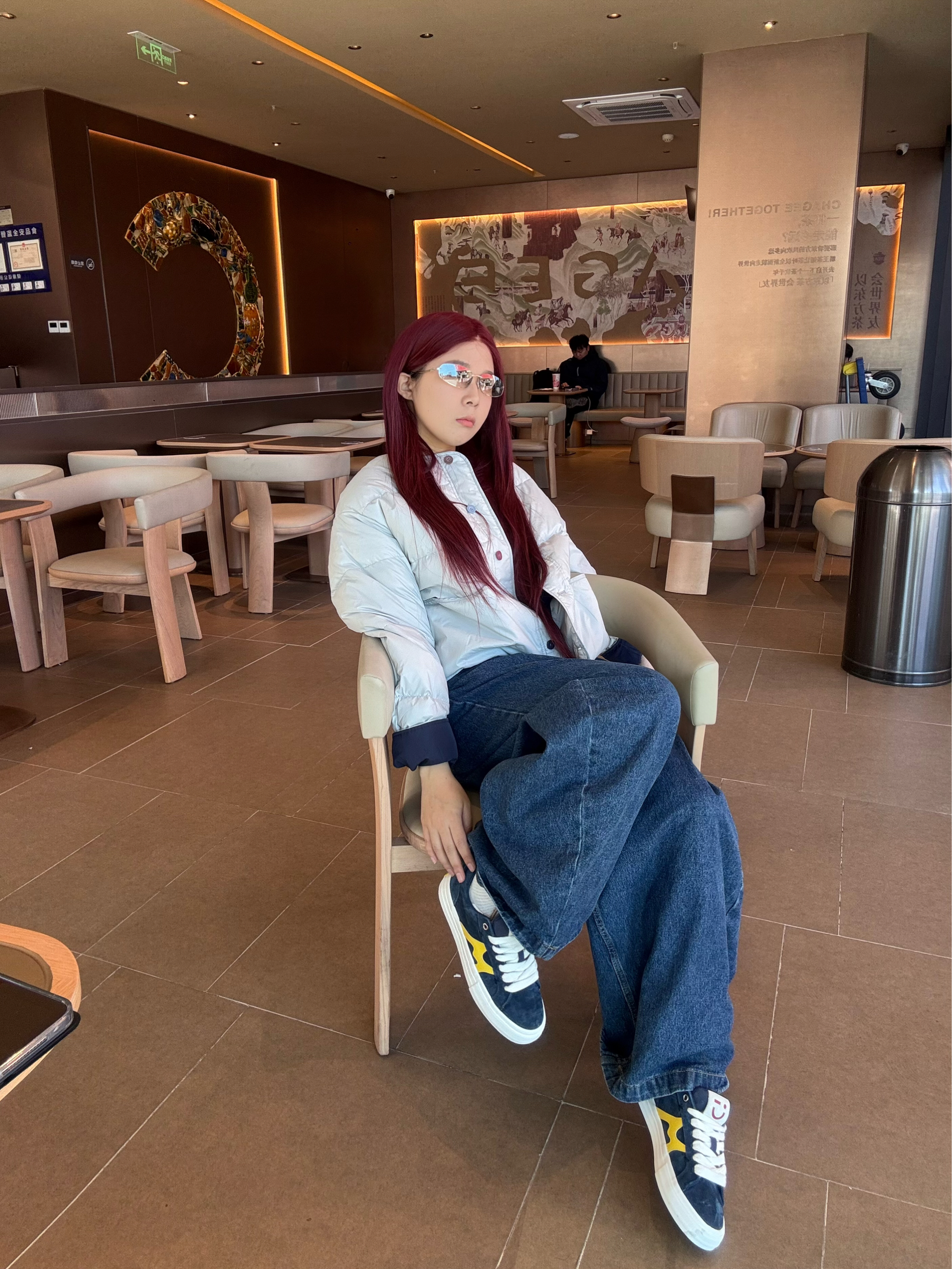通勤穿搭就要简约舒适 浅蓝色短款羽绒服搭配深蓝色阔腿牛仔裤 清爽干净 上脚 MINISO名创优品 蓝色板鞋 舒适简单 鞋子脚感不错 鞋舌上的笑脸超治愈 喜欢