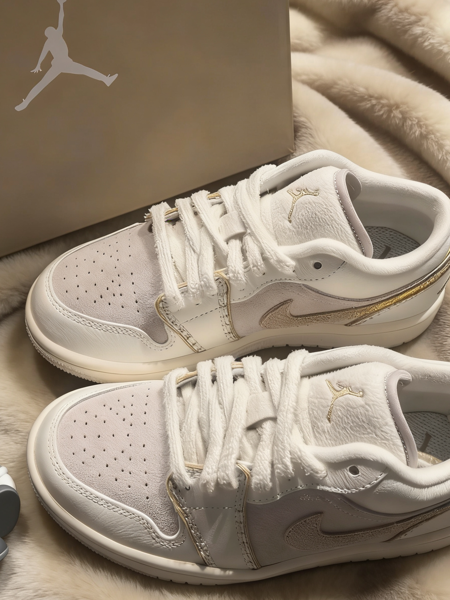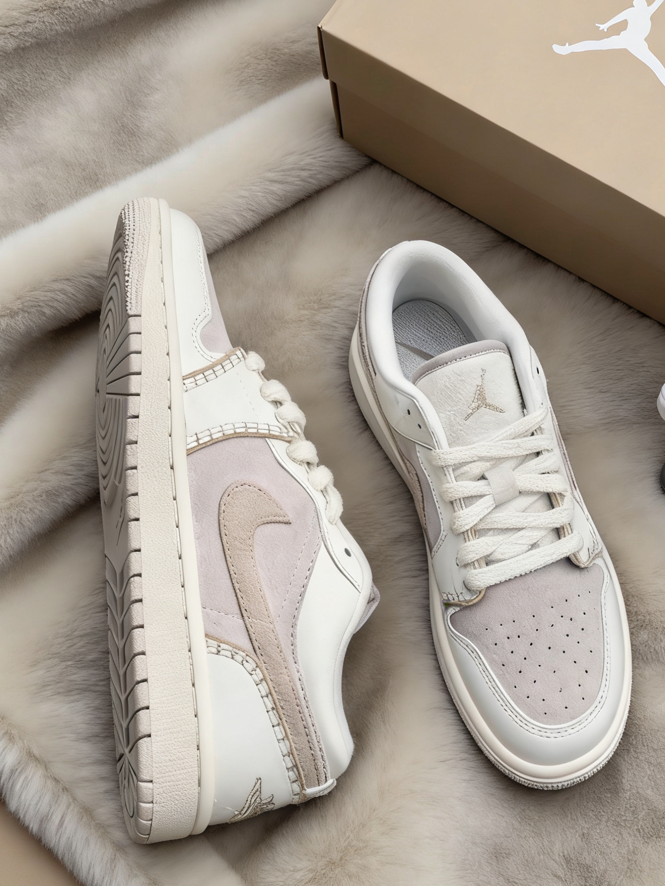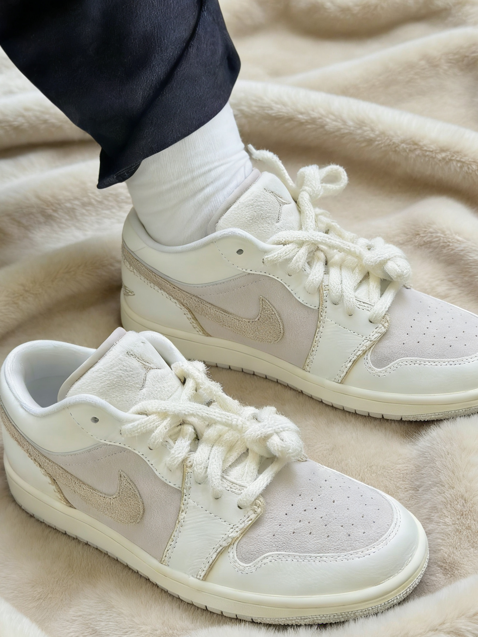 被这双奶茶色AJ1的颜值戳中了!米白拼浅杏的麂皮质感,明线设计自带慵懒温柔感,低帮版型上脚直接把腿拉得又细又直,黄皮穿也超显白,搭百褶裙、阔腿裤都巨搭。 上脚的脚感比想象中好太多,原本担心麂皮款会磨脚,结果鞋帮的填充很饱满,第一次穿出门走了两公里,脚后跟一点都没磨。日常通勤逛超市完全不累脚。 尺码建议正码选,我穿37码刚合适,宽脚的朋友选大半码会更舒服。唯一小缺点是麂皮部分容易沾灰,用粘毛器滚两下...