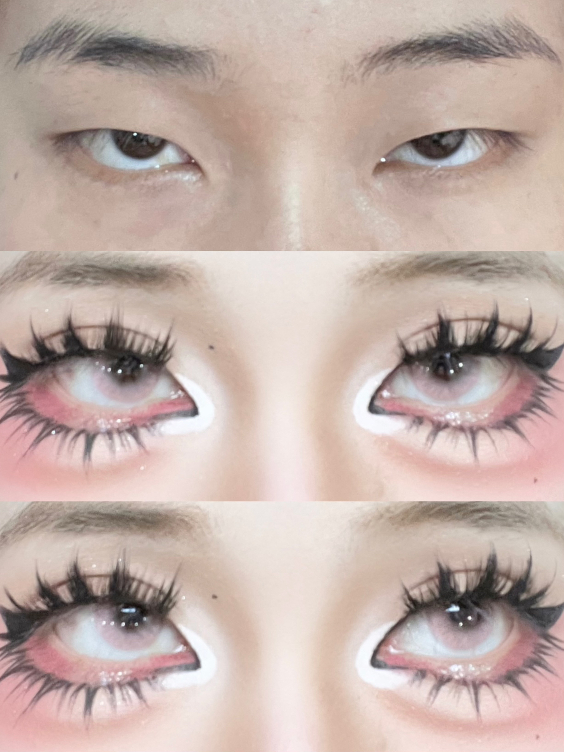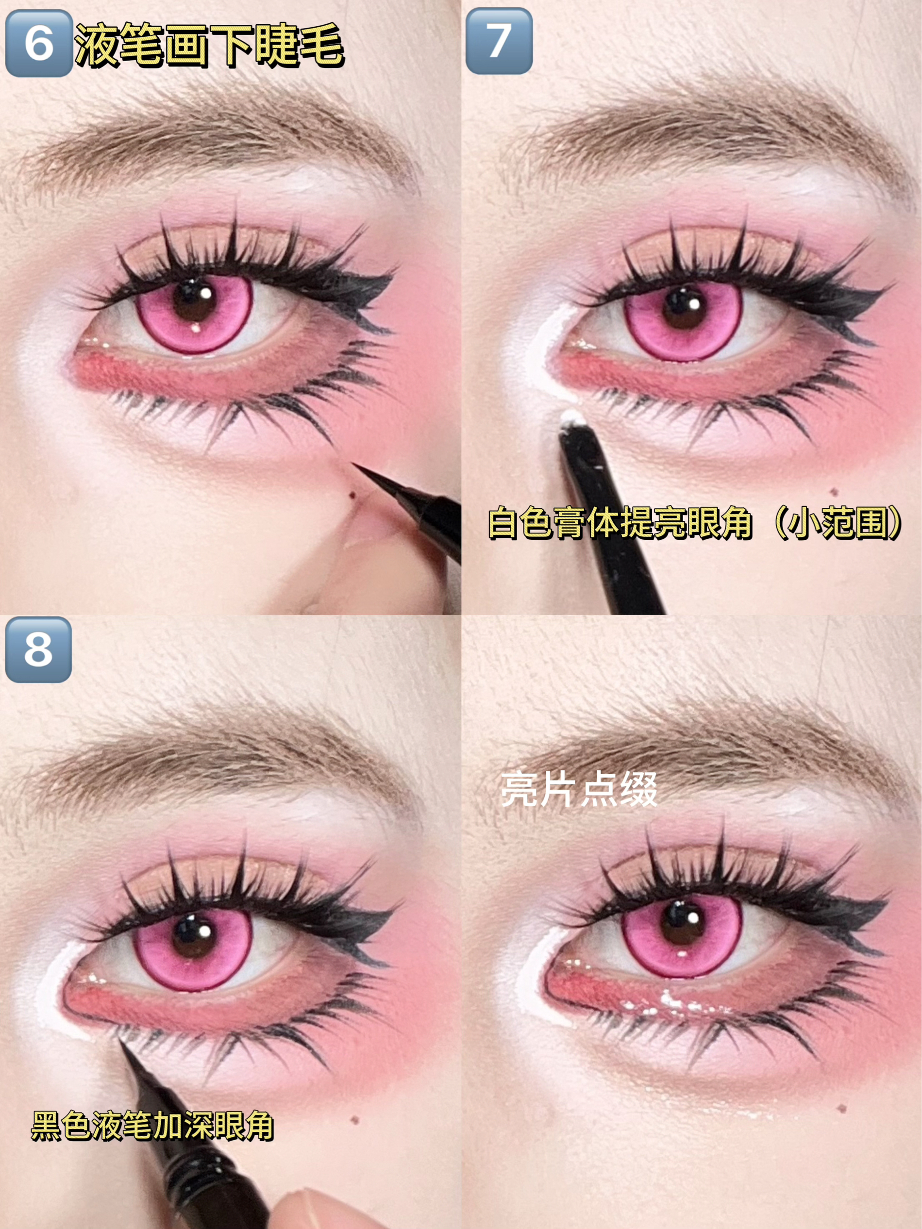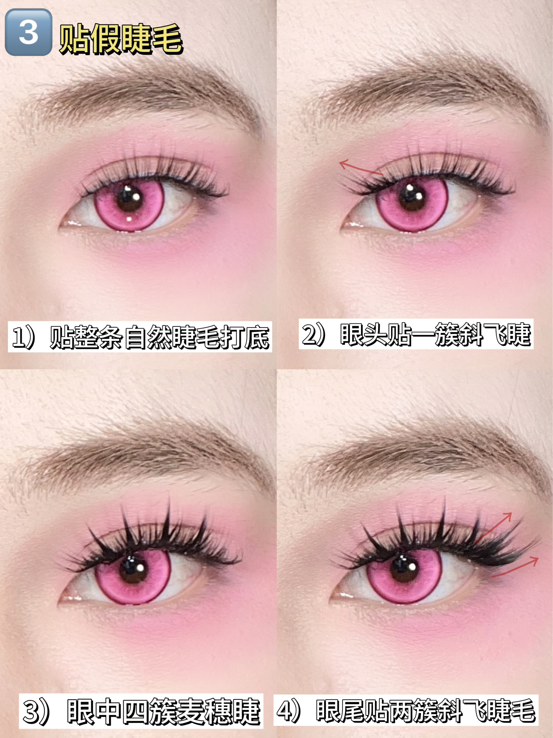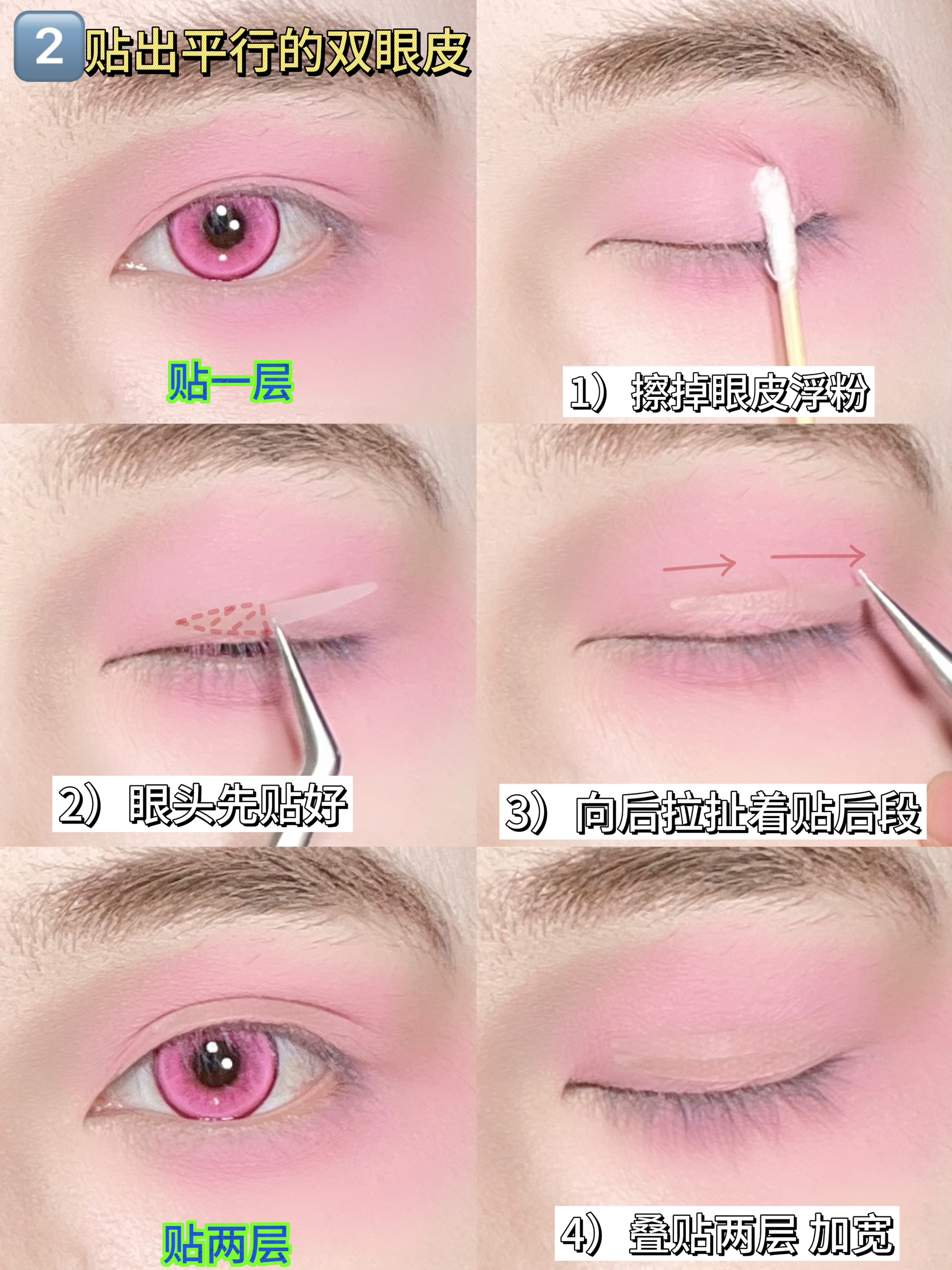 今天学这个粉粉的bjd眼妆 大眼原来这么简单~ 先戴上一个 Obalen欧巴兰 的玫粉色眼珠珠 然后用同色系的玫粉色眼影给上下眼皮铺色晕染 范围可以大一点 拿出半月形的双眼皮贴 反着贴 支撑力更好 贴出平行双眼皮 然后贴假睫毛 bjd感get
