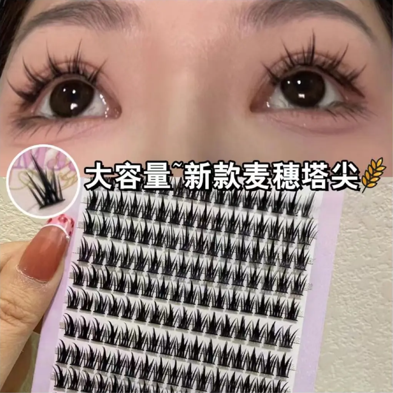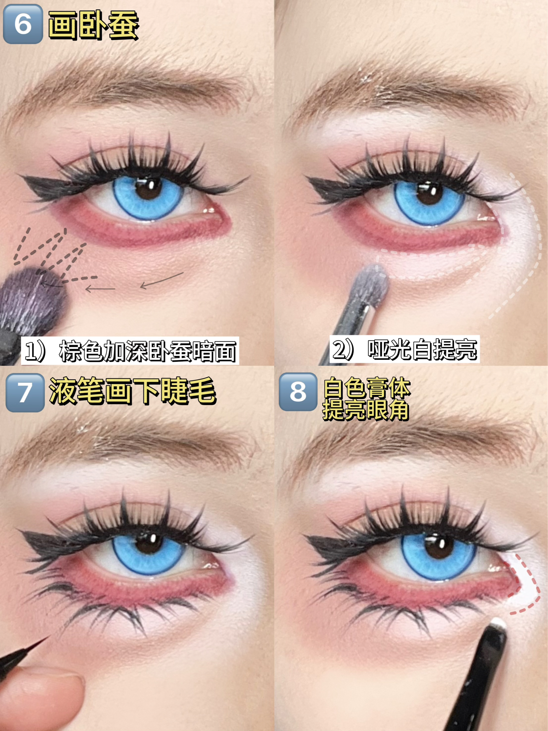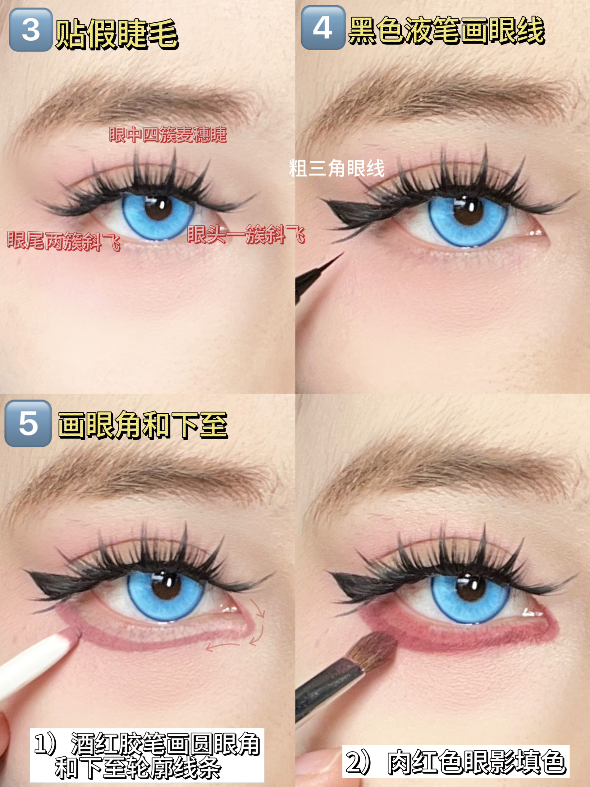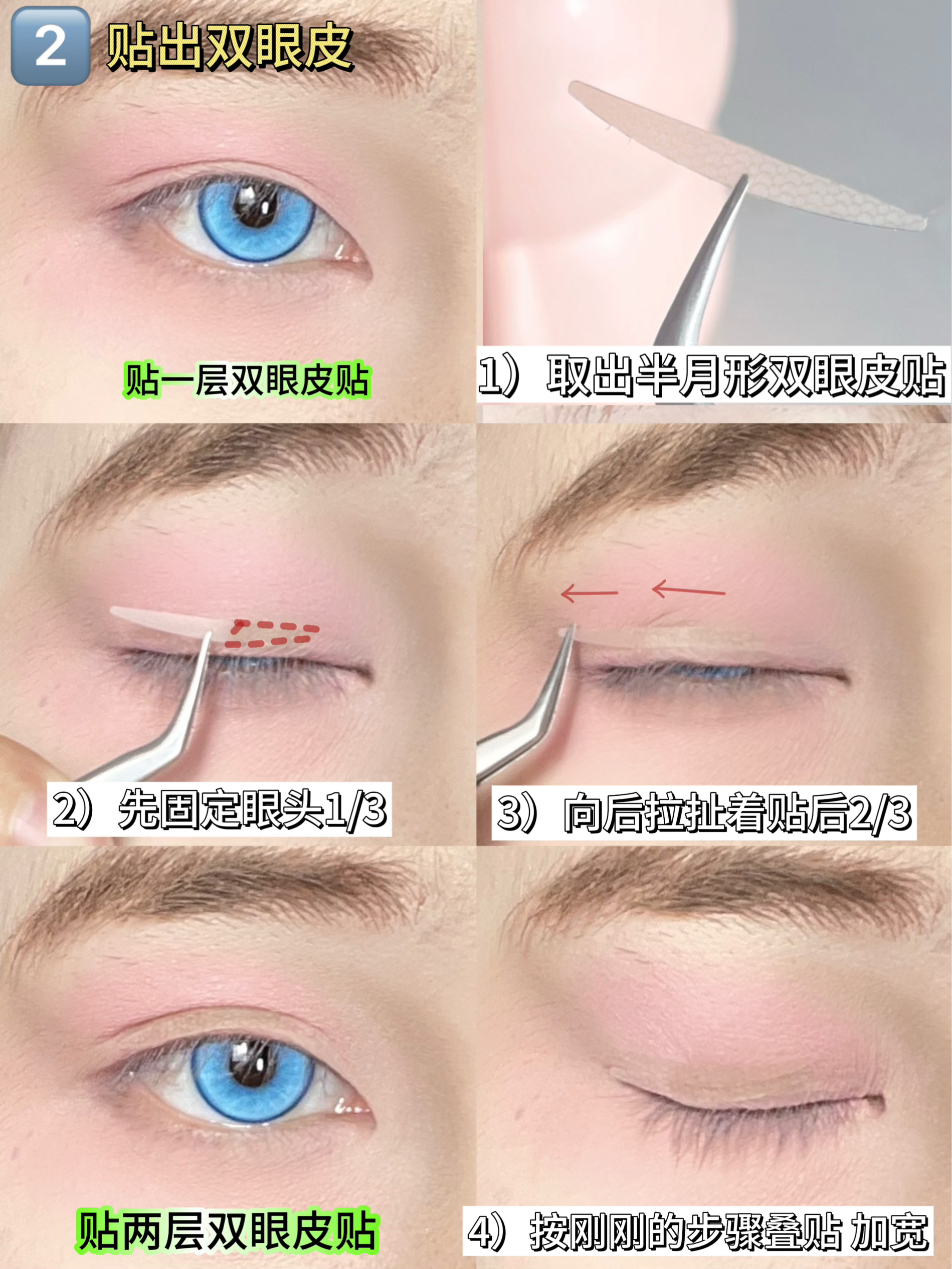 今天来学这个bjd感的大眼眼妆 先用修容色把眼部轮廓感加深出来 然后拿出淡粉色眼影给上下眼皮大范围铺色 拿出半月形双眼皮贴,叠贴两层 贴出平行的双眼皮 接着贴假睫毛 get漫画感
