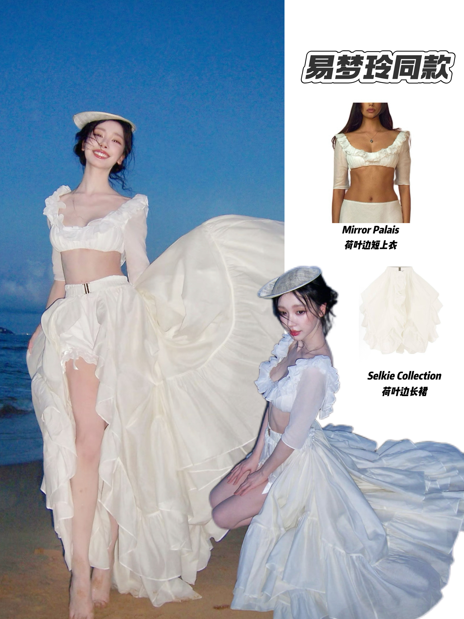 易梦玲这套海边穿搭是“氛围王者”! Mirror Palais短上衣+Selkie长裙的组合,轻盈白纱配层层荷叶边,既保留了露腰的松弛感,又靠大裙摆衬出海边的浪漫飘逸。海风一吹,松弛又柔美,是海边出片的绝佳选择~