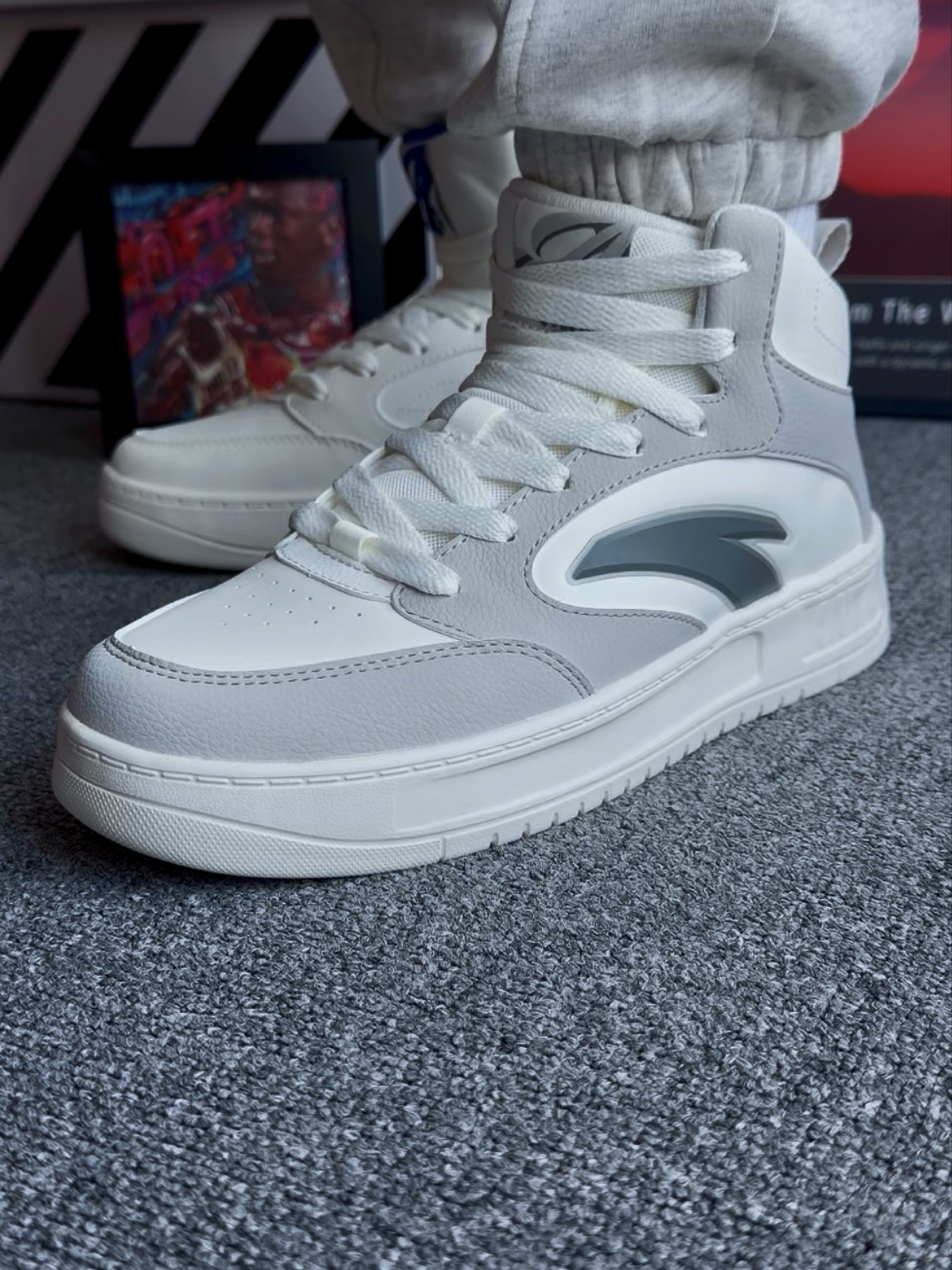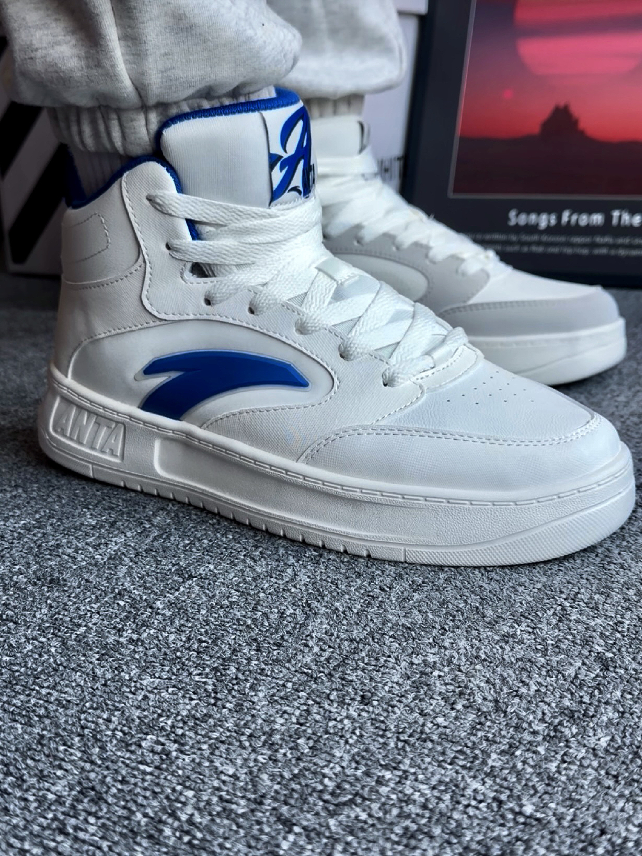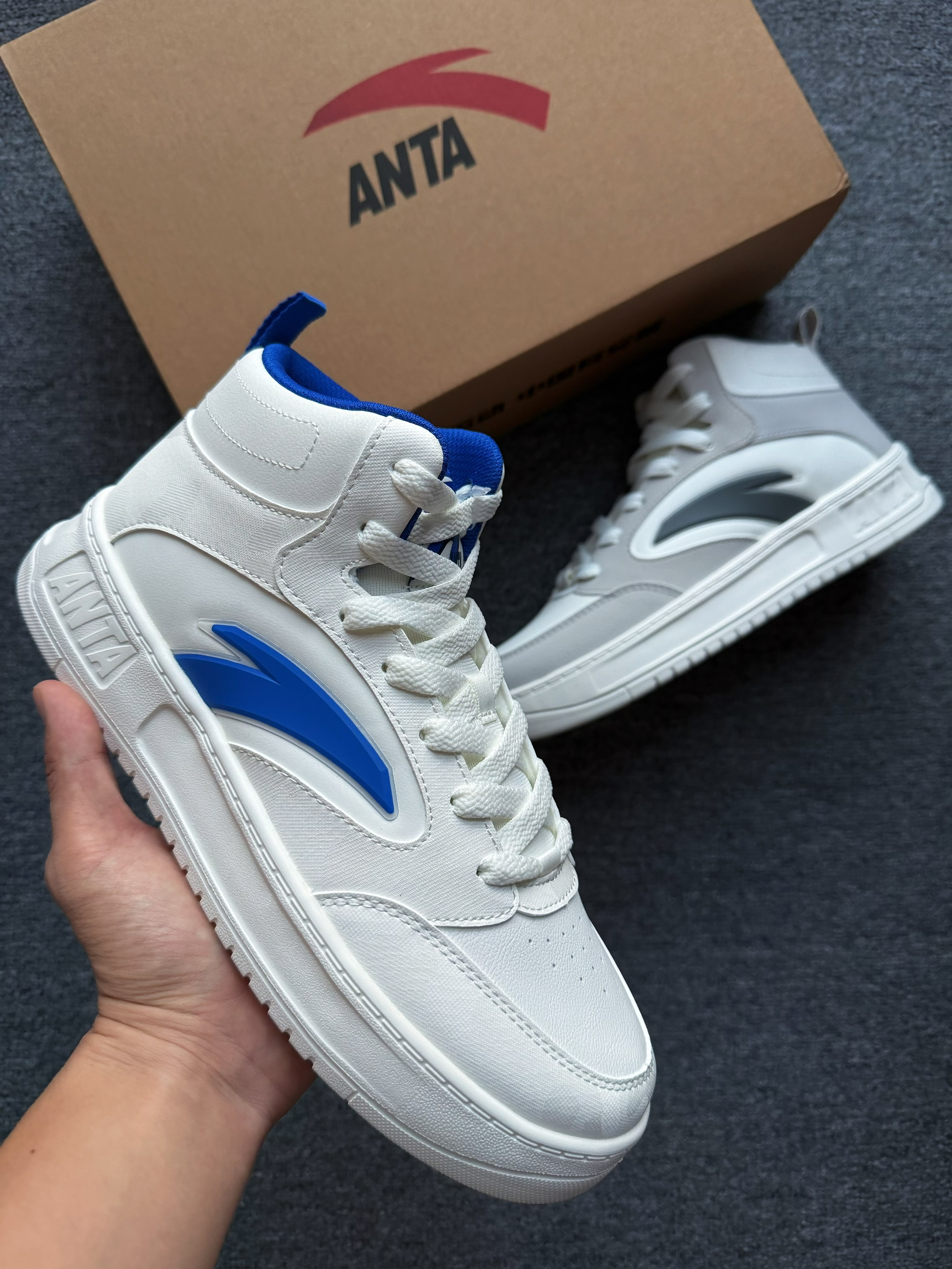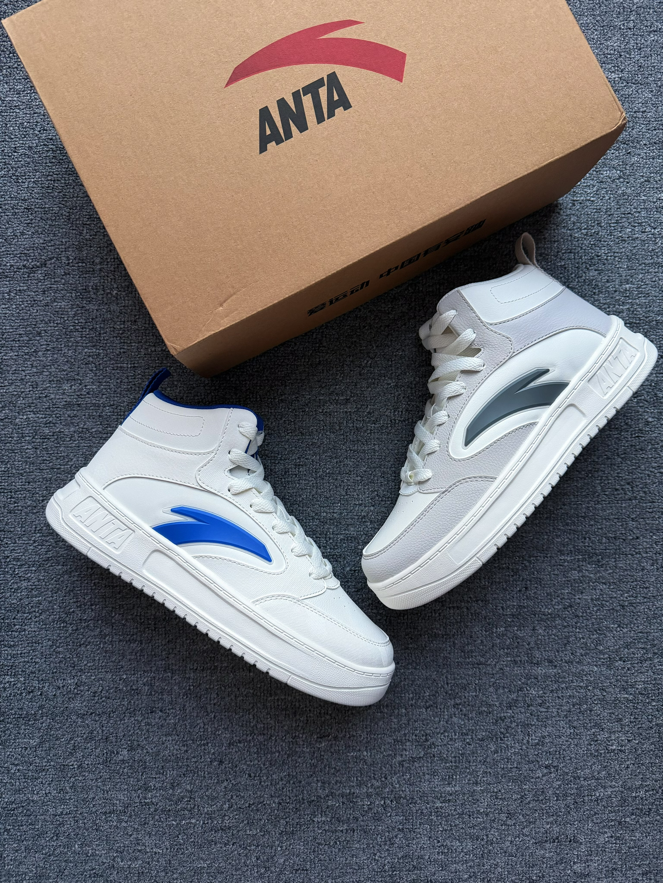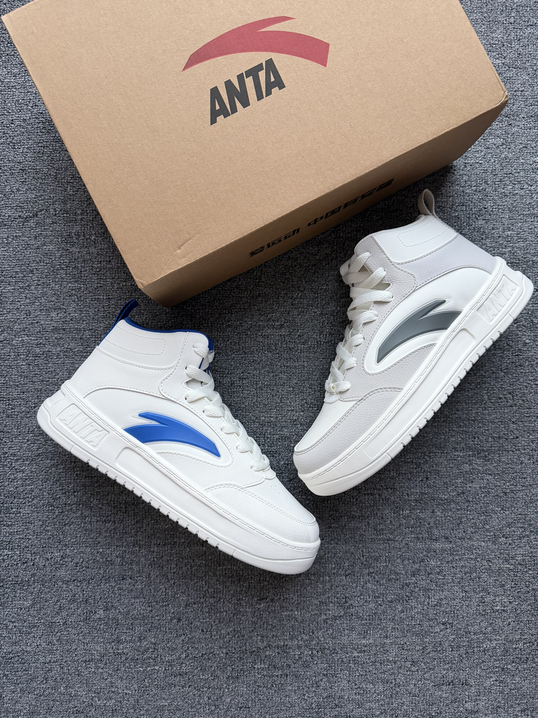 - 潮流运动 选择 安踏 高帮「板鞋」 外观:高帮设计 北卡蓝的感觉 很清爽 材质:鞋面为皮革 秋冬保暖又防雨水💦 耐磨:橡胶耐磨鞋底 防滑还不错 脚感:脚感舒适 不夹脚 不闷脚 尺码:正常运动鞋尺码选择 适配:上班族 & 学生党 蓝色和灰色可以搭配鸳鸯鞋😎 上街很好搭配 怎么穿都合适 关键是目前的性价比真的很高❗️