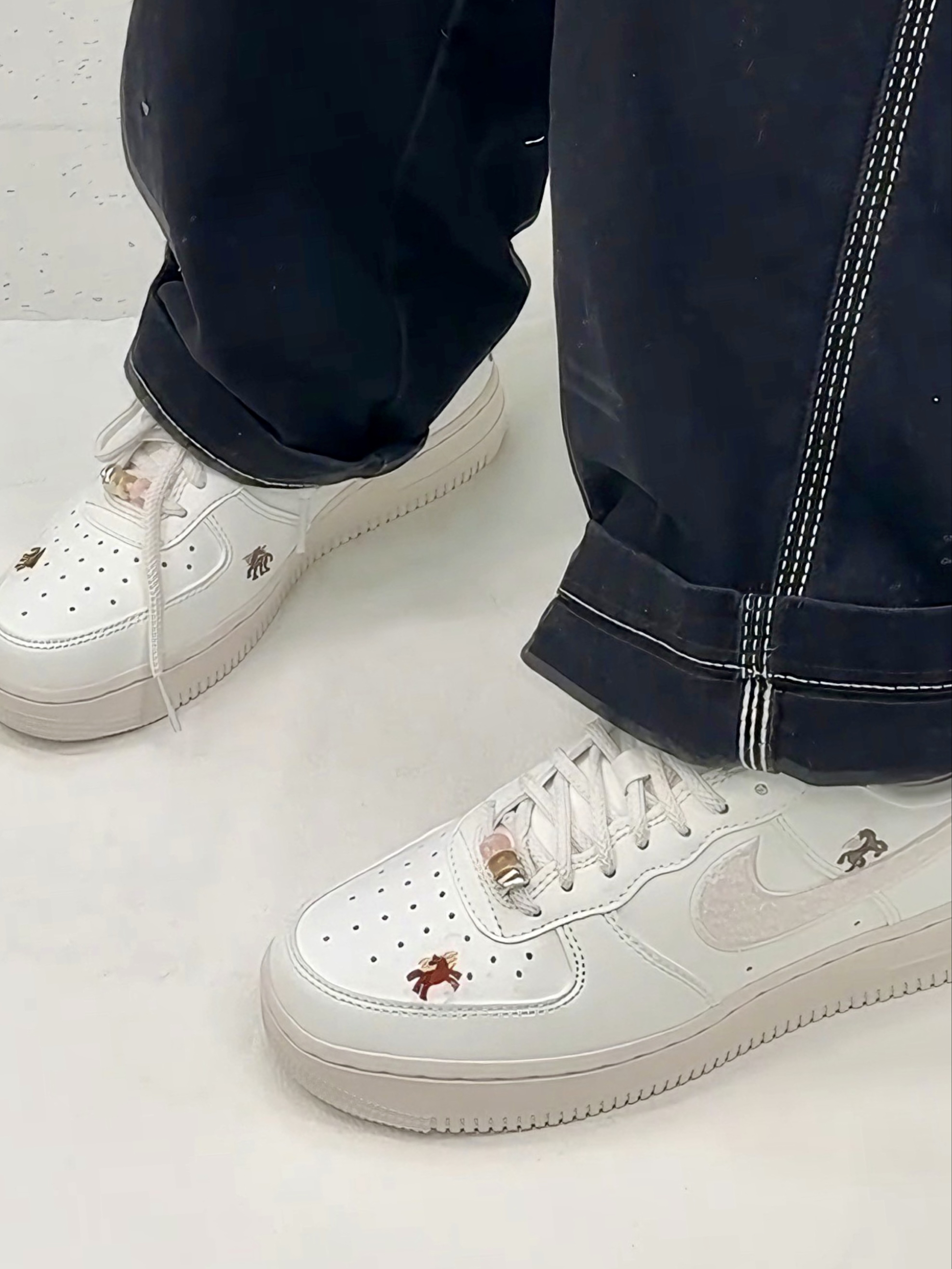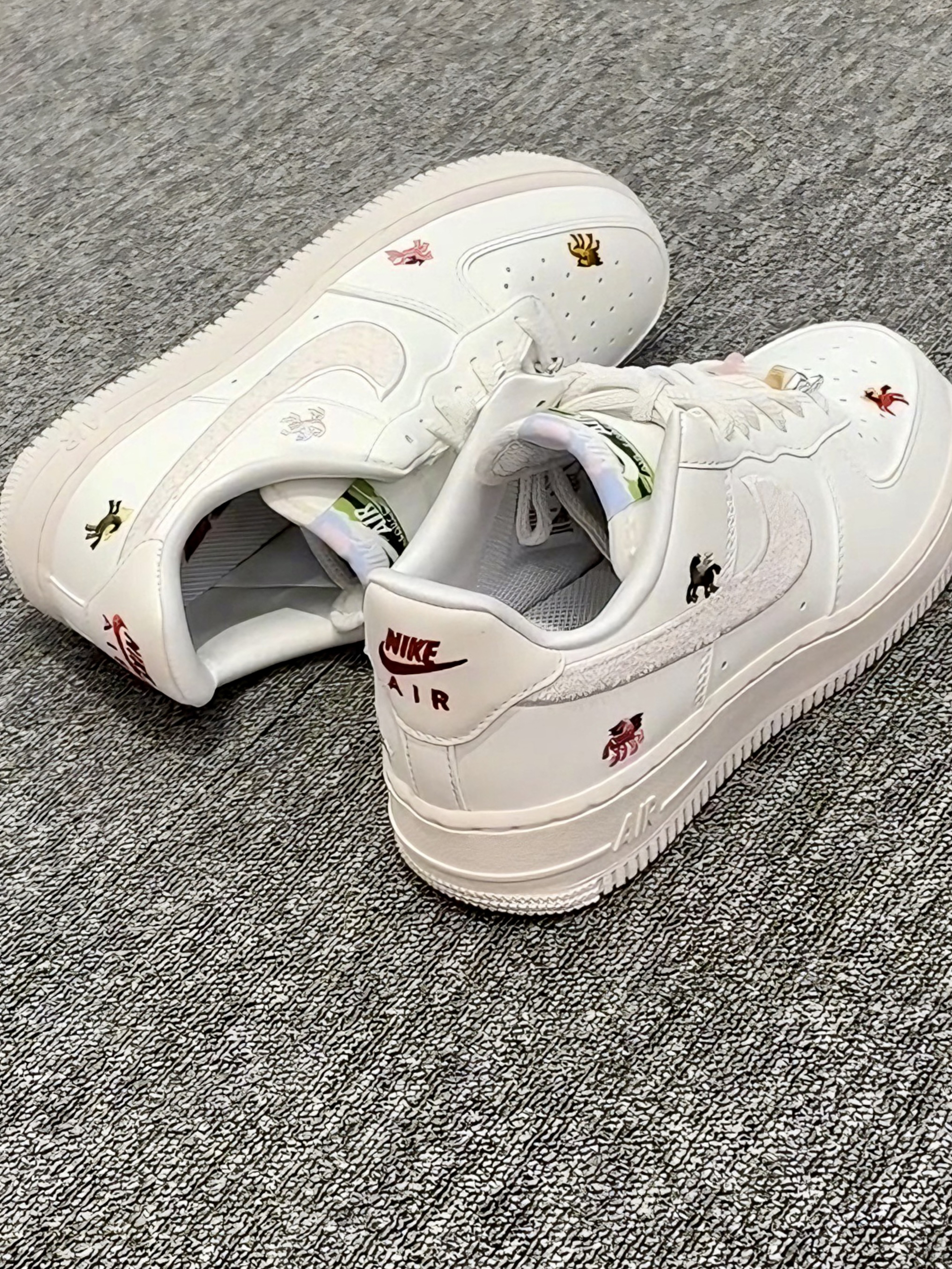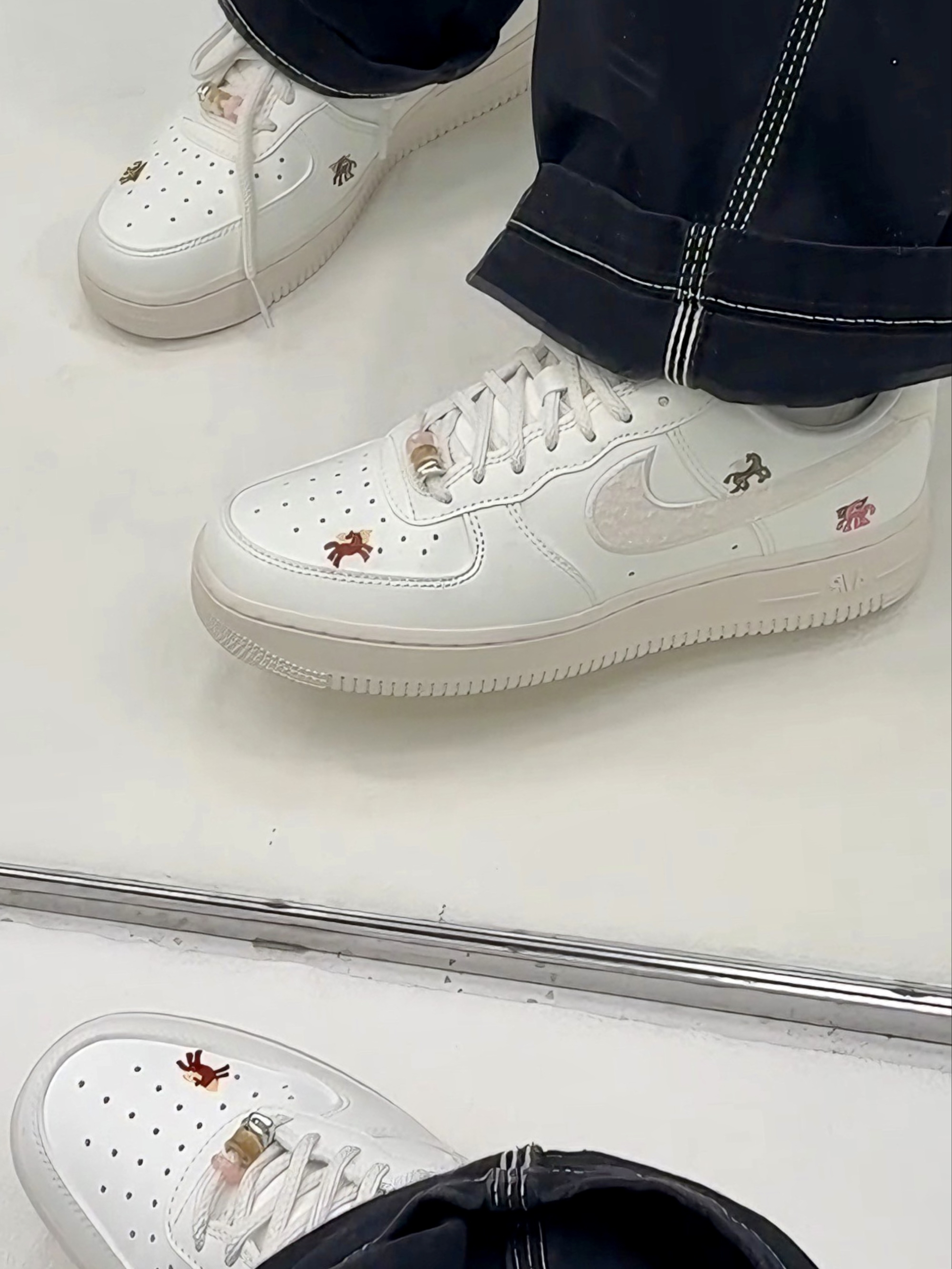 谁能拒绝这双Nike马年AF1啊😭奶白鞋身搭彩色飞马刺绣,细节直接拉满,鞋舌的渐变标签和金属鞋带扣超有质感!上脚是经典空军的软弹脚感,3cm厚底悄悄增高,显腿细又不累脚,通勤暴走一天都没压力。 穿搭超万能,配牛仔裤是休闲潮人,搭百褶裙秒变甜妹,新年穿还讨个“马到成功”的好彩头。 ⚠️建议:鞋型偏窄,脚宽的姐妹拍大半码;皮质鞋面容易有折痕,日常穿完及时用鞋撑定型哦~