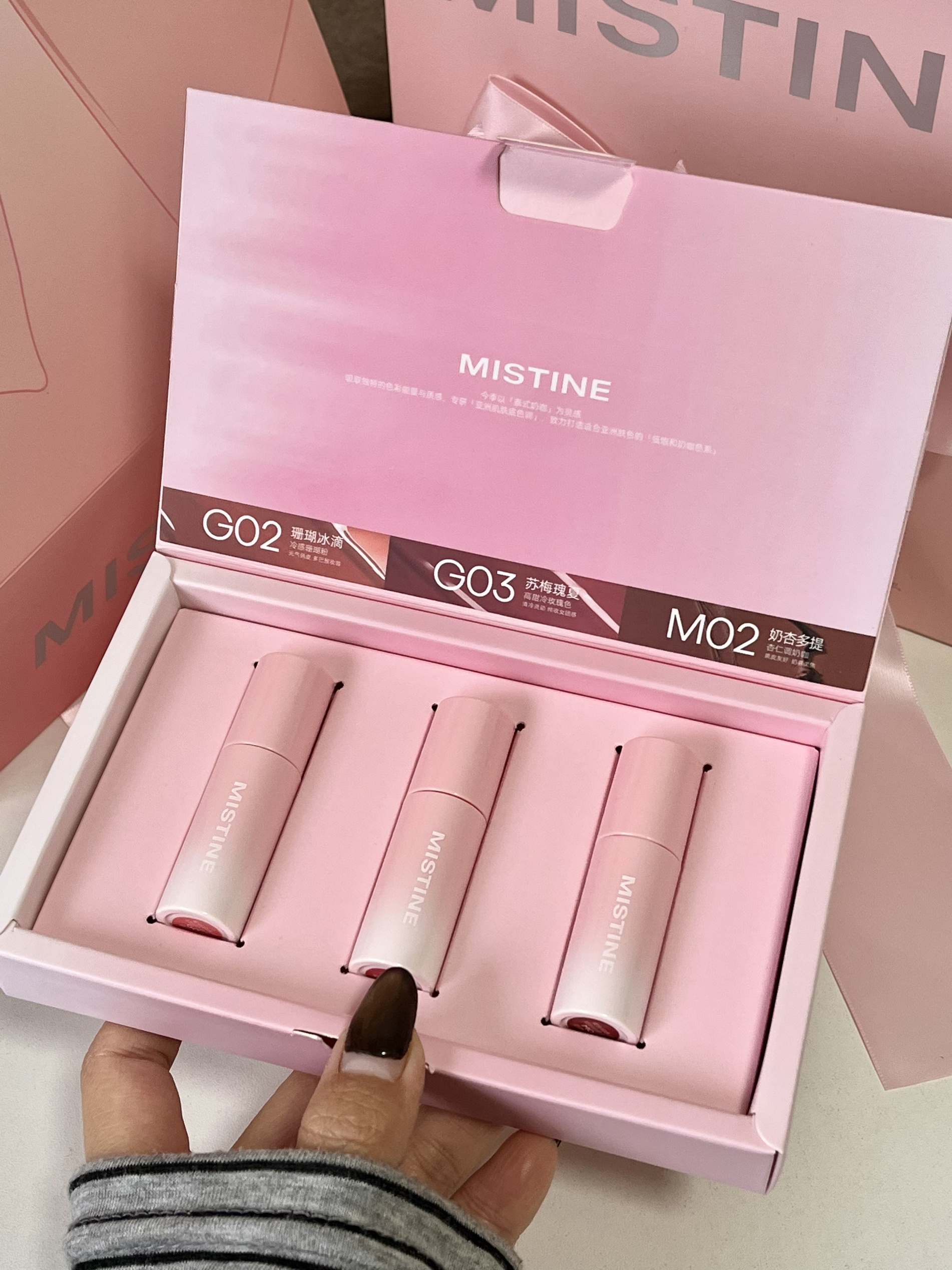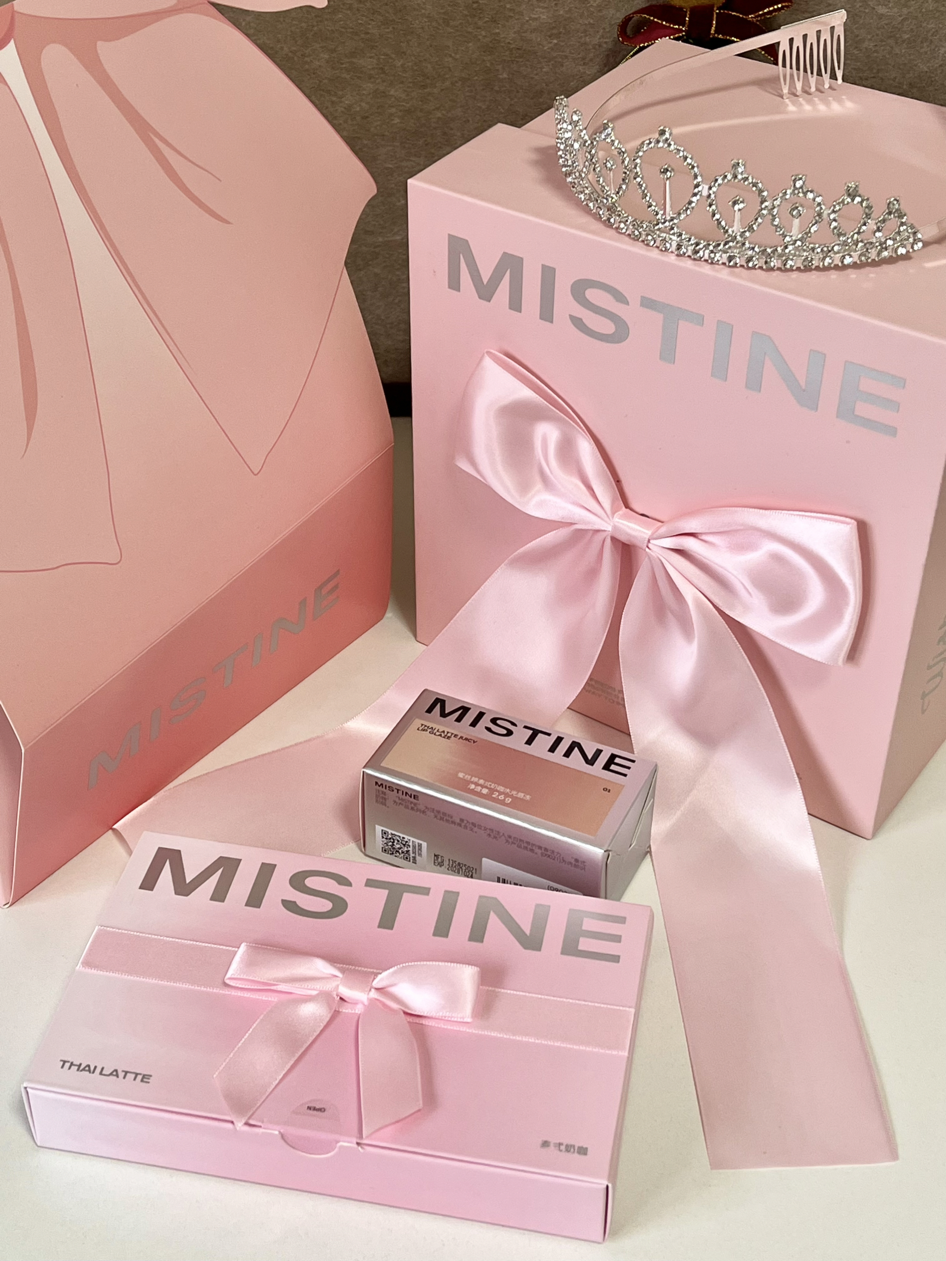 mistine你小汁是懂我们女孩子的 好喜欢这个粉黛结愿礼盒,蝴蝶结的造型好美丽哦 里面有一支正装,一盒迷你唇釉还有一个皇冠发箍 唇釉颜色都蛮日常的 我是黄皮感觉素颜涂也ok 这一盒蛮有仪式感的,感觉自用or送人都很不错呢