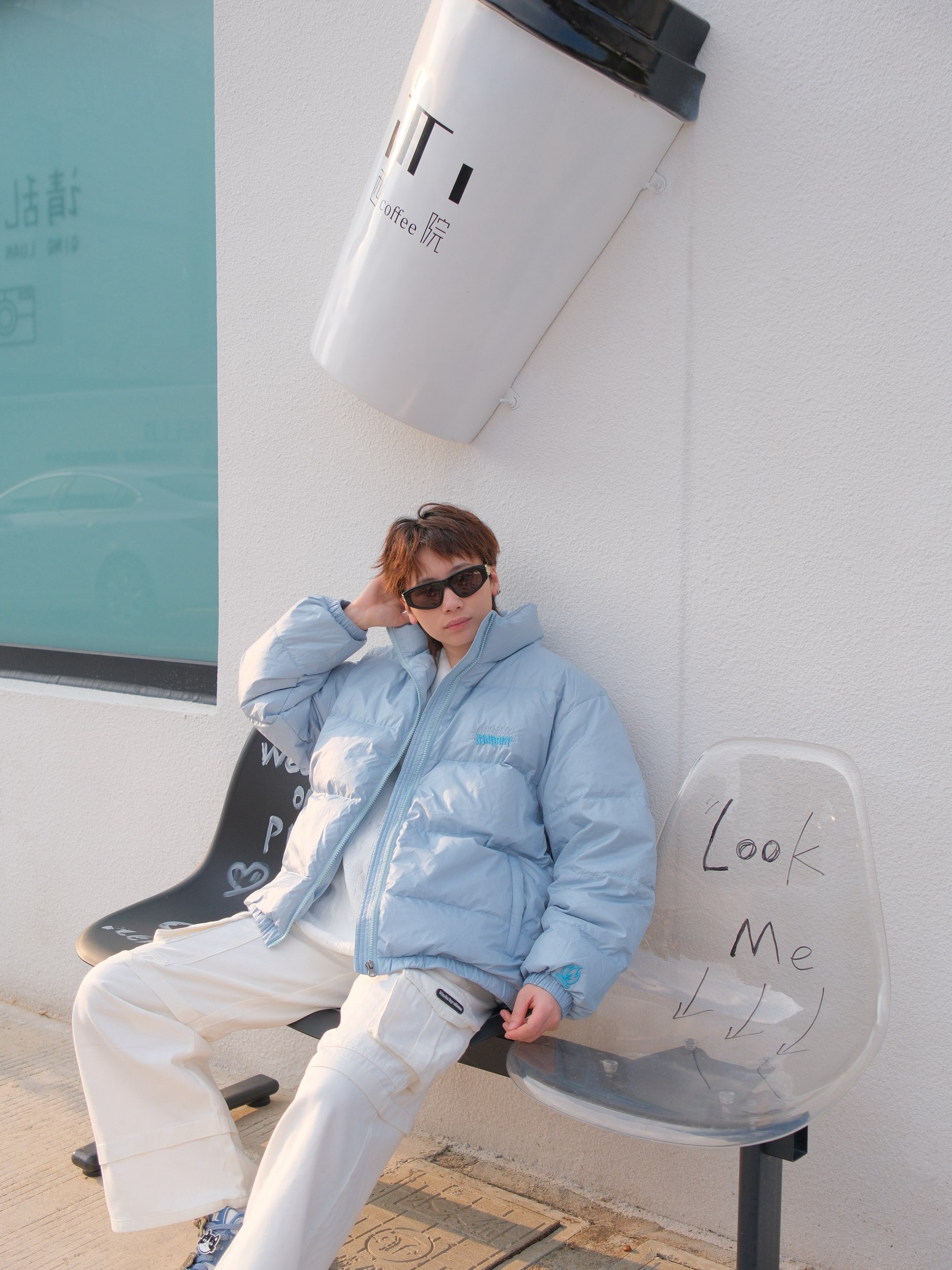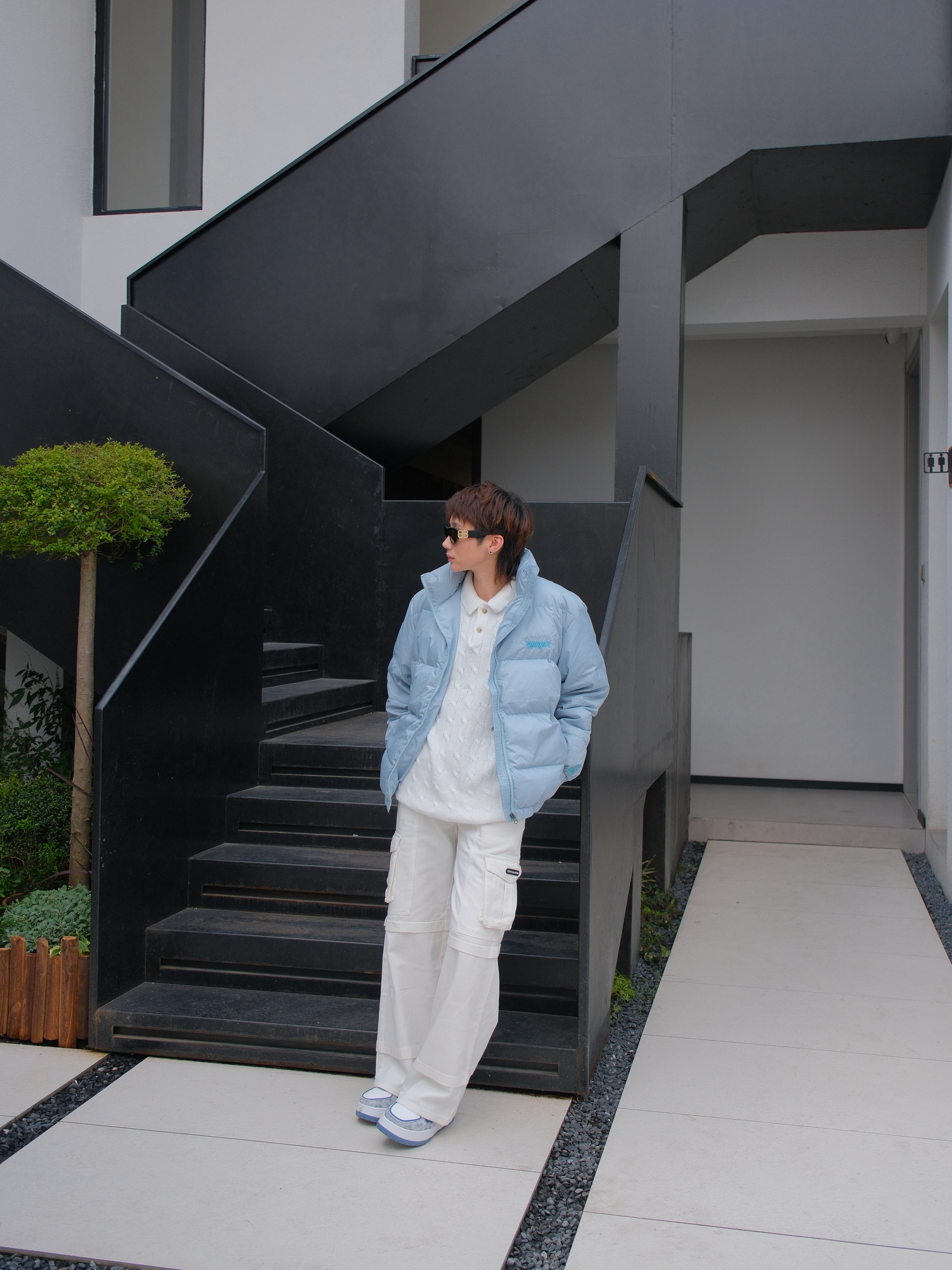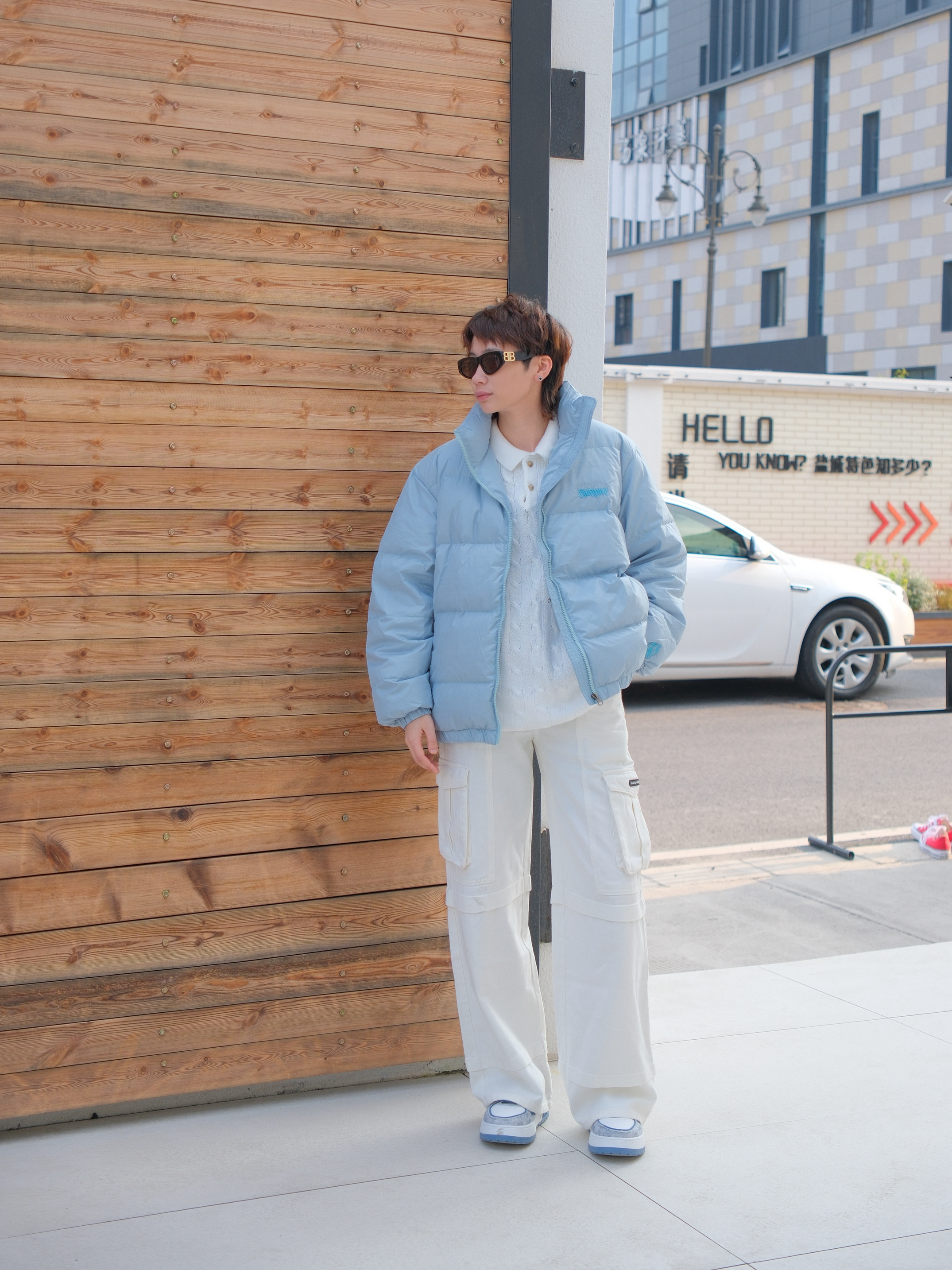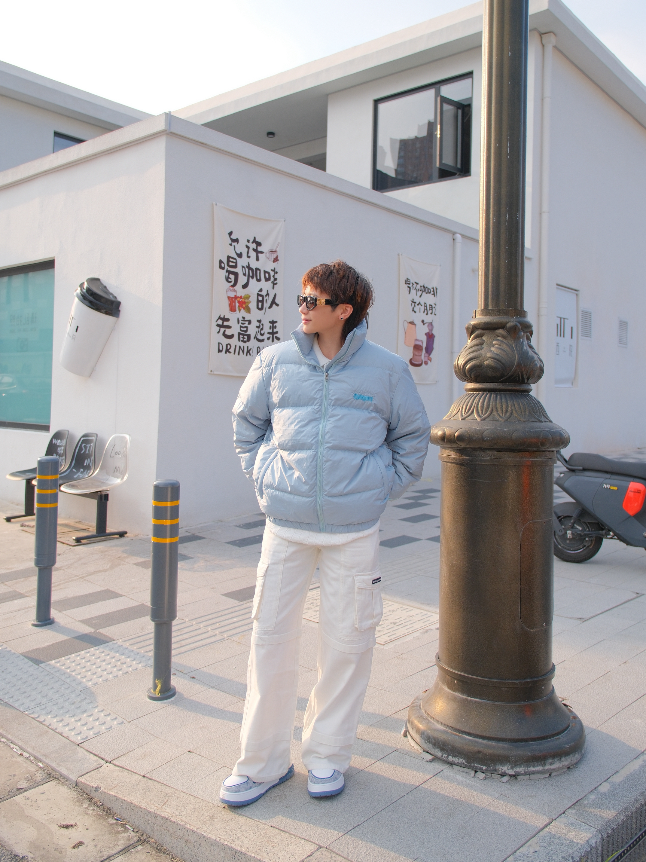 整点亮色系,拉满冬天的活力值✧٩(ˊωˋ*)و✧ 上身选了件雾霾蓝色的羽绒服 下面搭配白色工装裤 简简单单又很清爽 面包服的版型软糯蓬松 品牌的字母logo和火苗图案 都做了立体刺绣,非常有质感 最后来一双白蓝拼色板鞋 整体穿搭就比较多巴胺了 尺码参考:163cm/46kg 上身S码