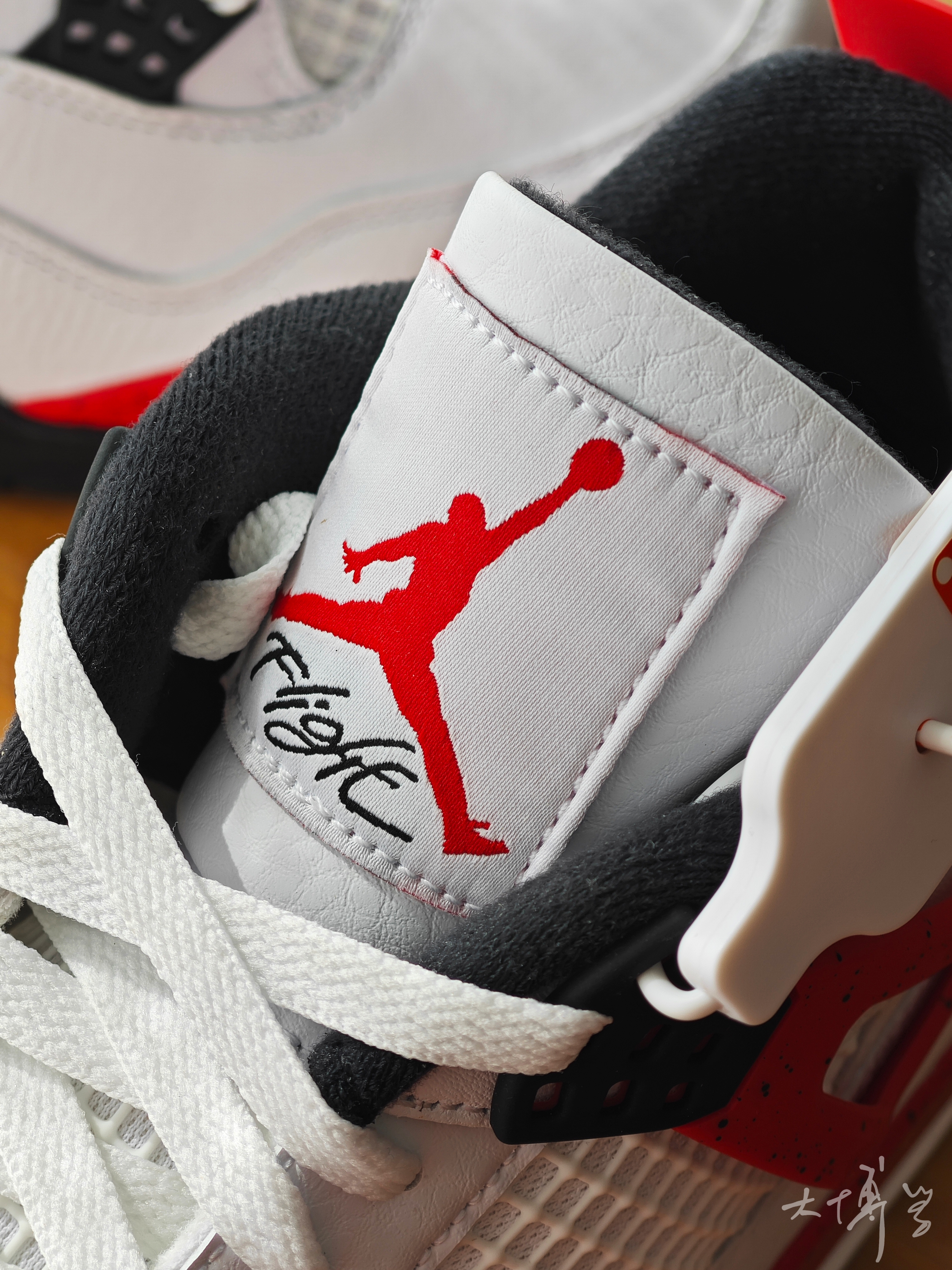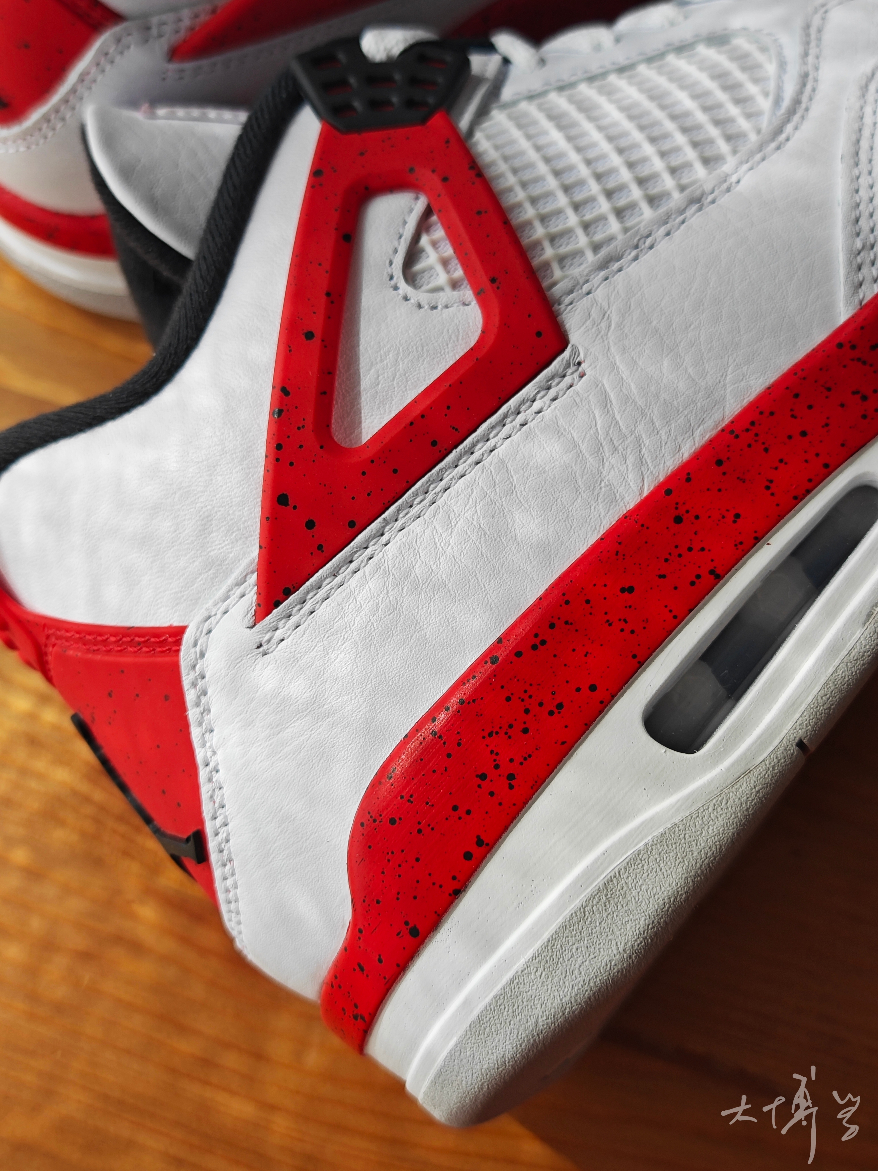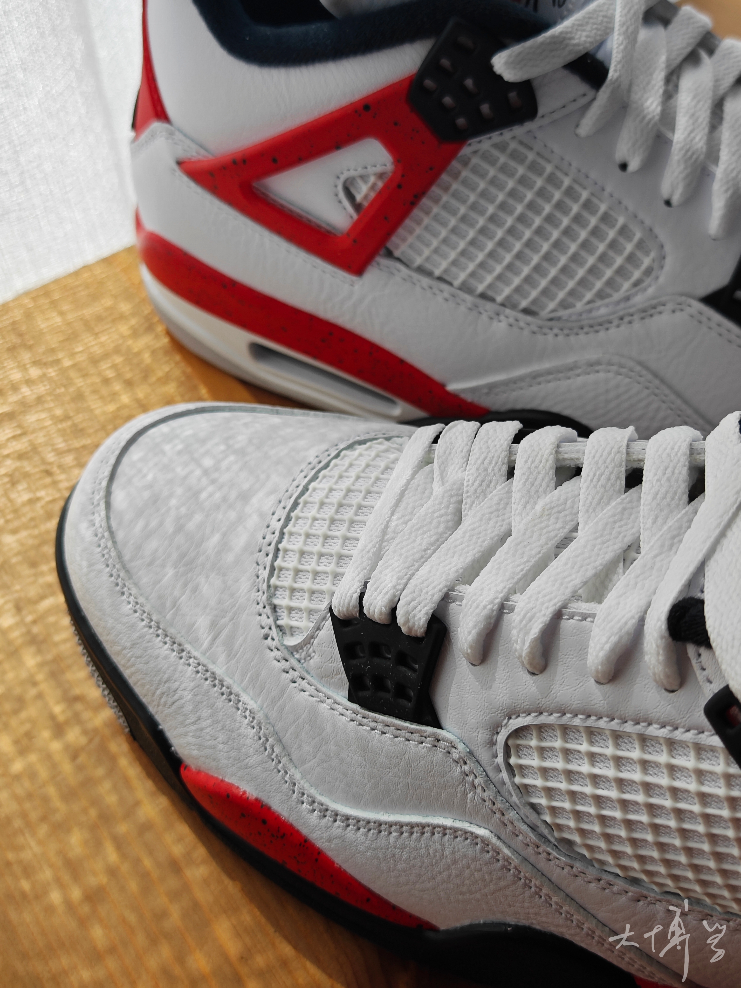 一款我觉得颜值还不错的白红AJ 4 白色皮革鞋面,纹理还是比较明显的 一些红色作为点缀 显得很青春活力 塑料件上做了泼墨处理 整体做工很不错
