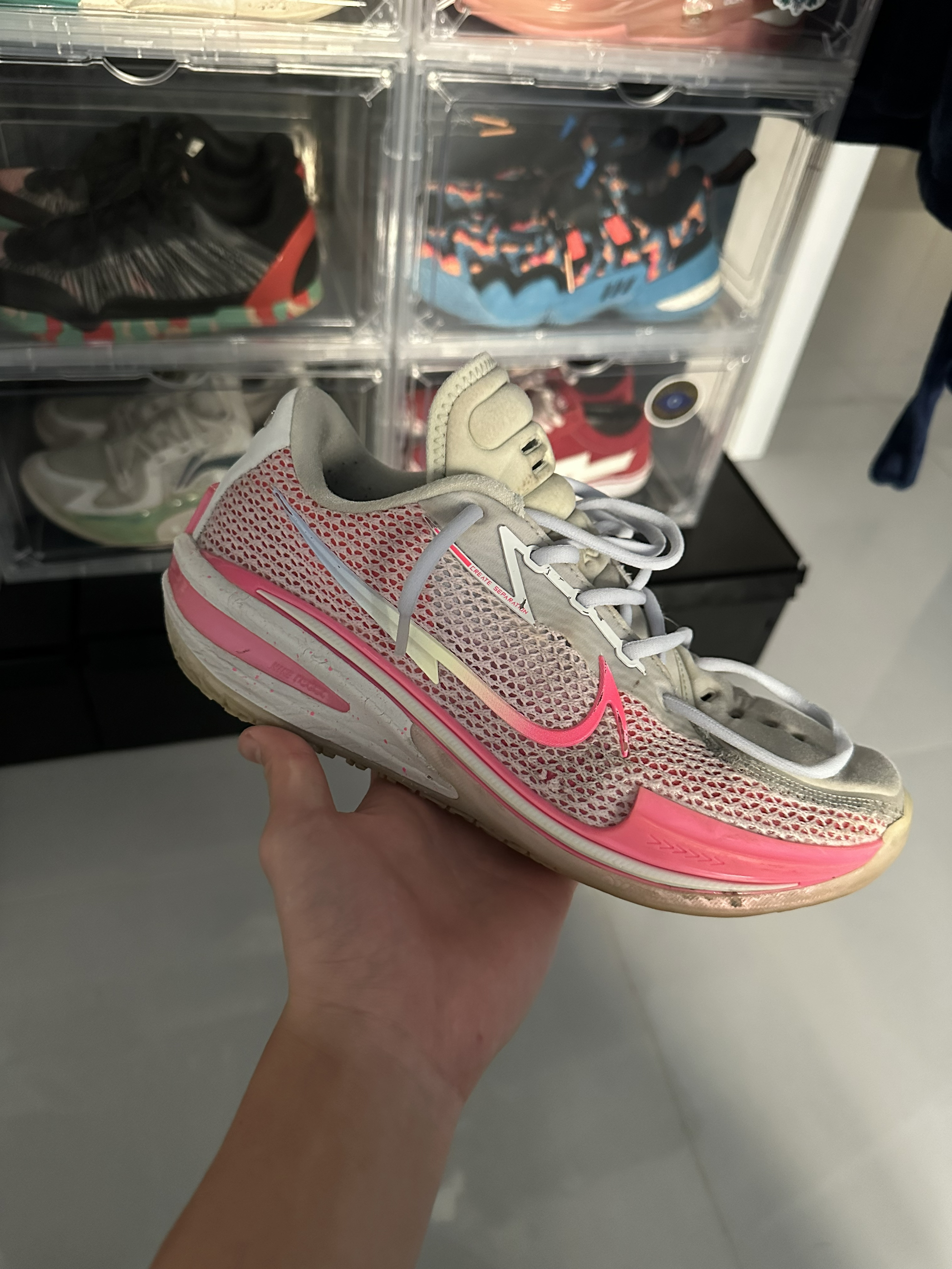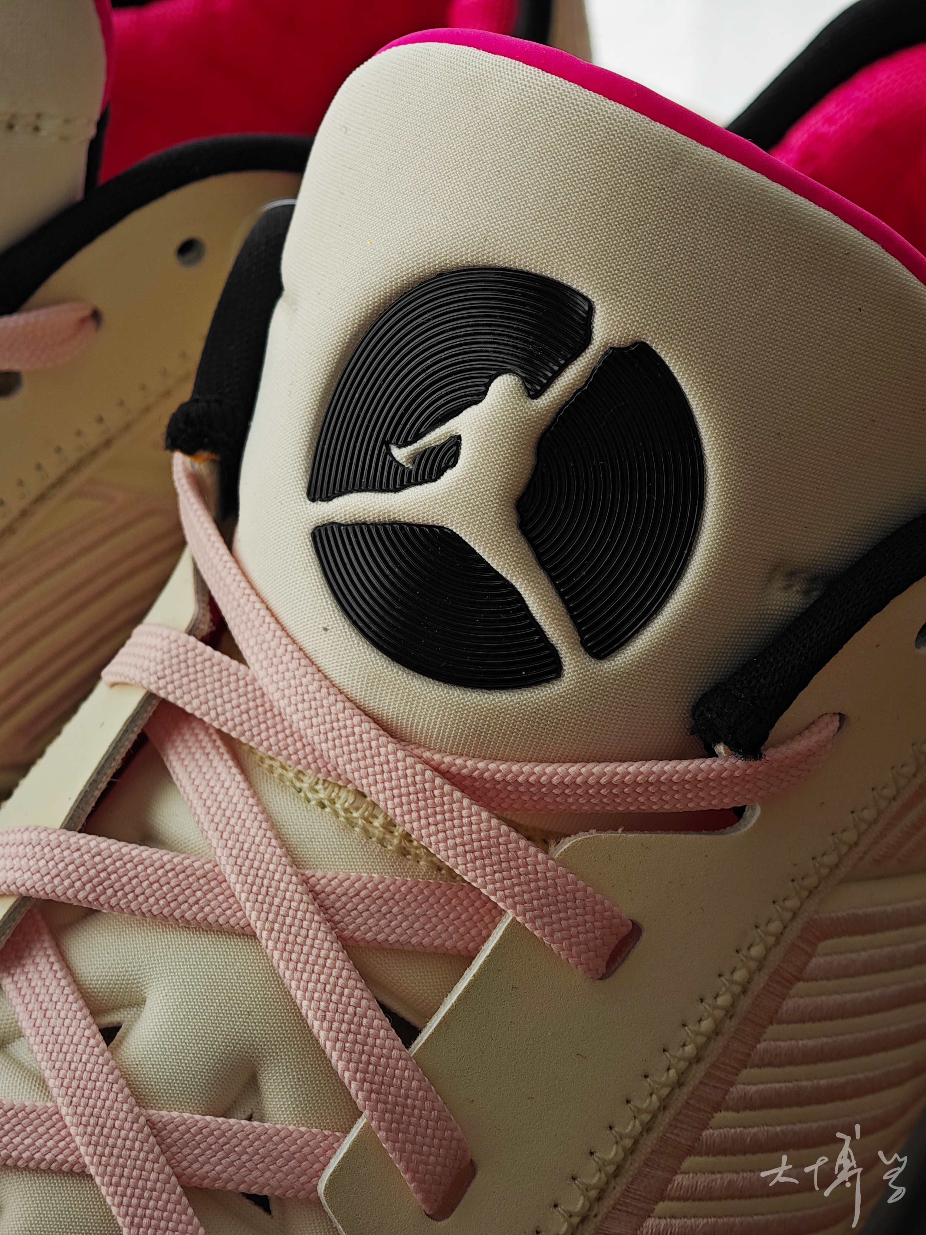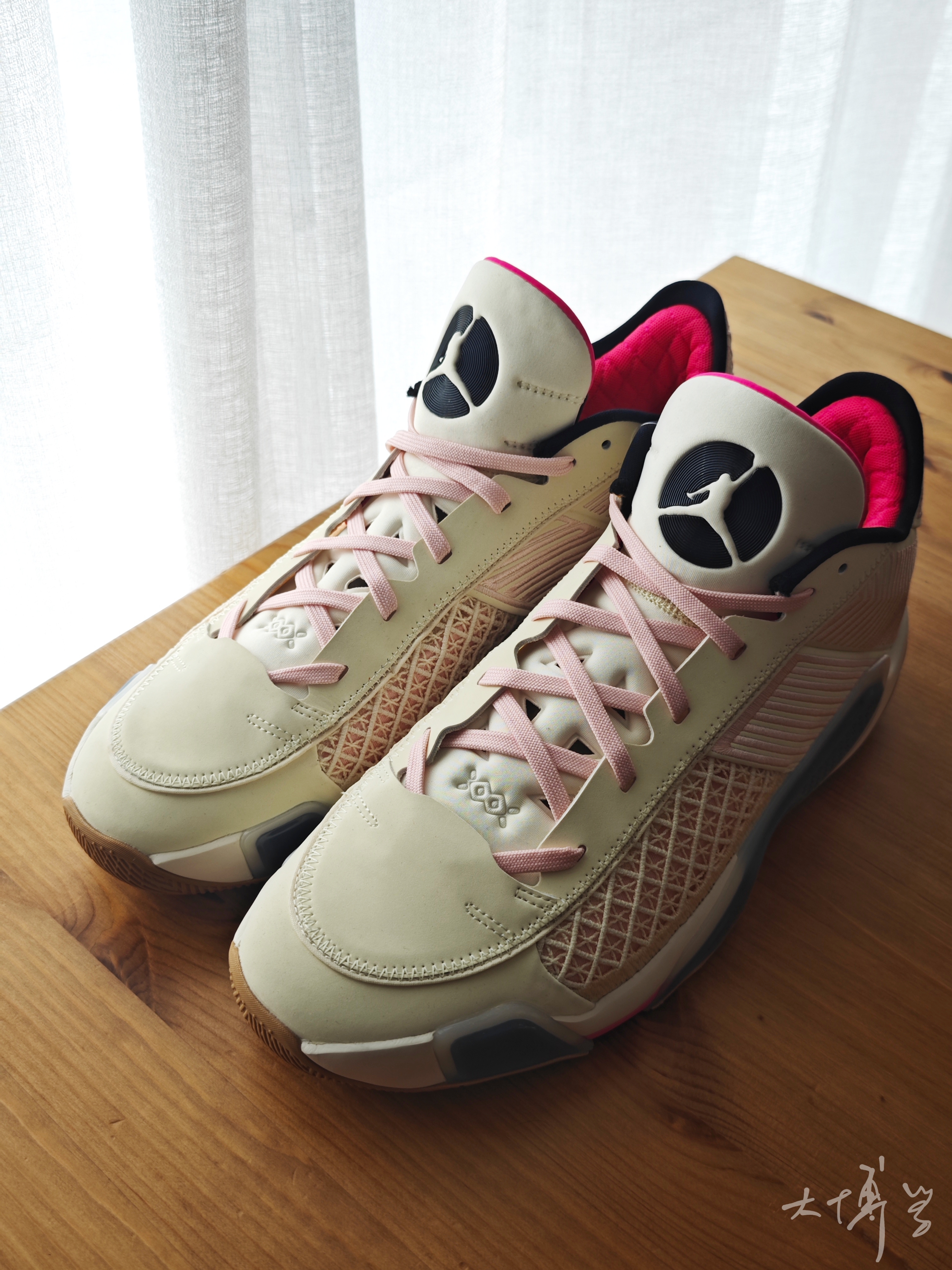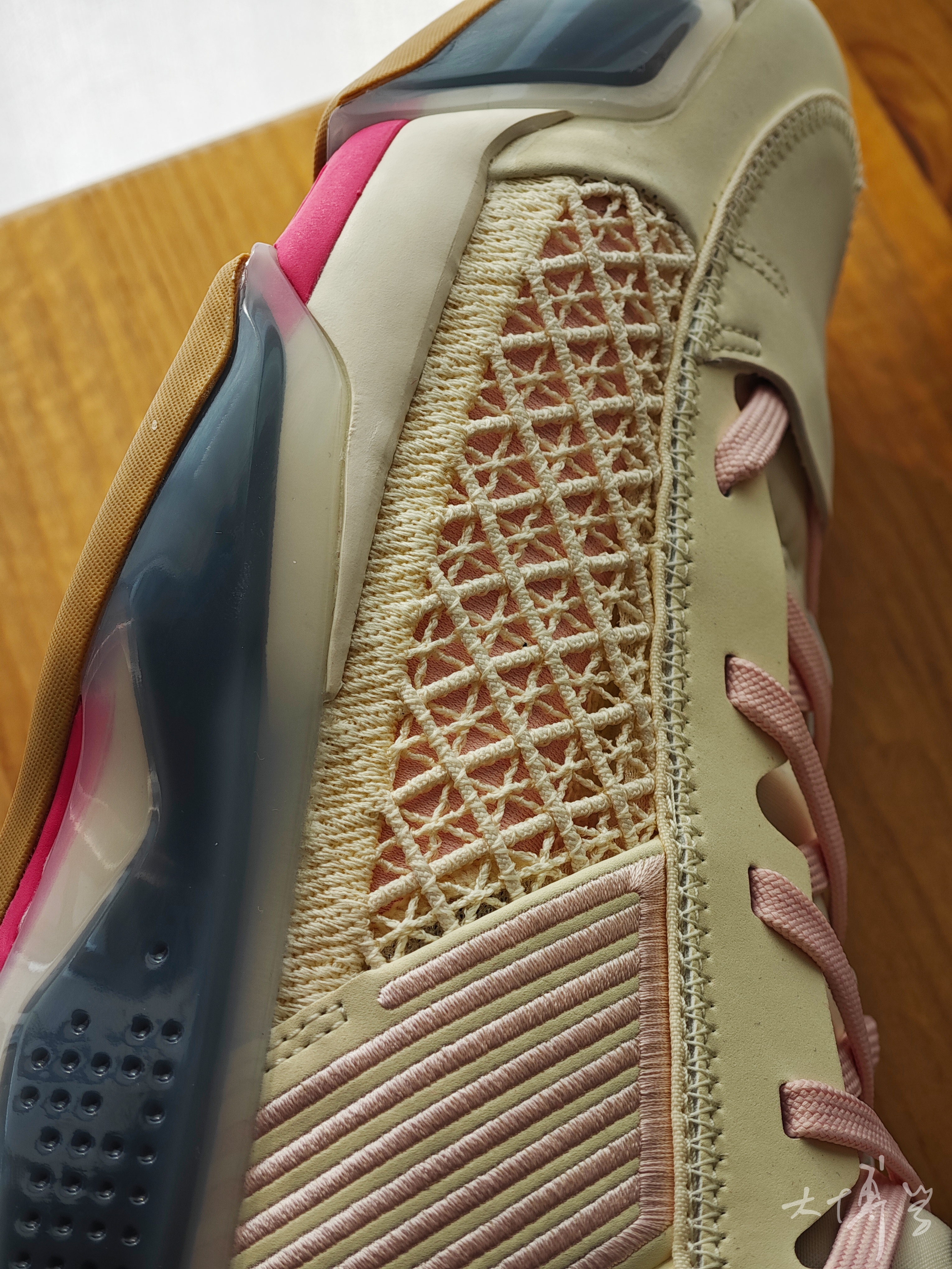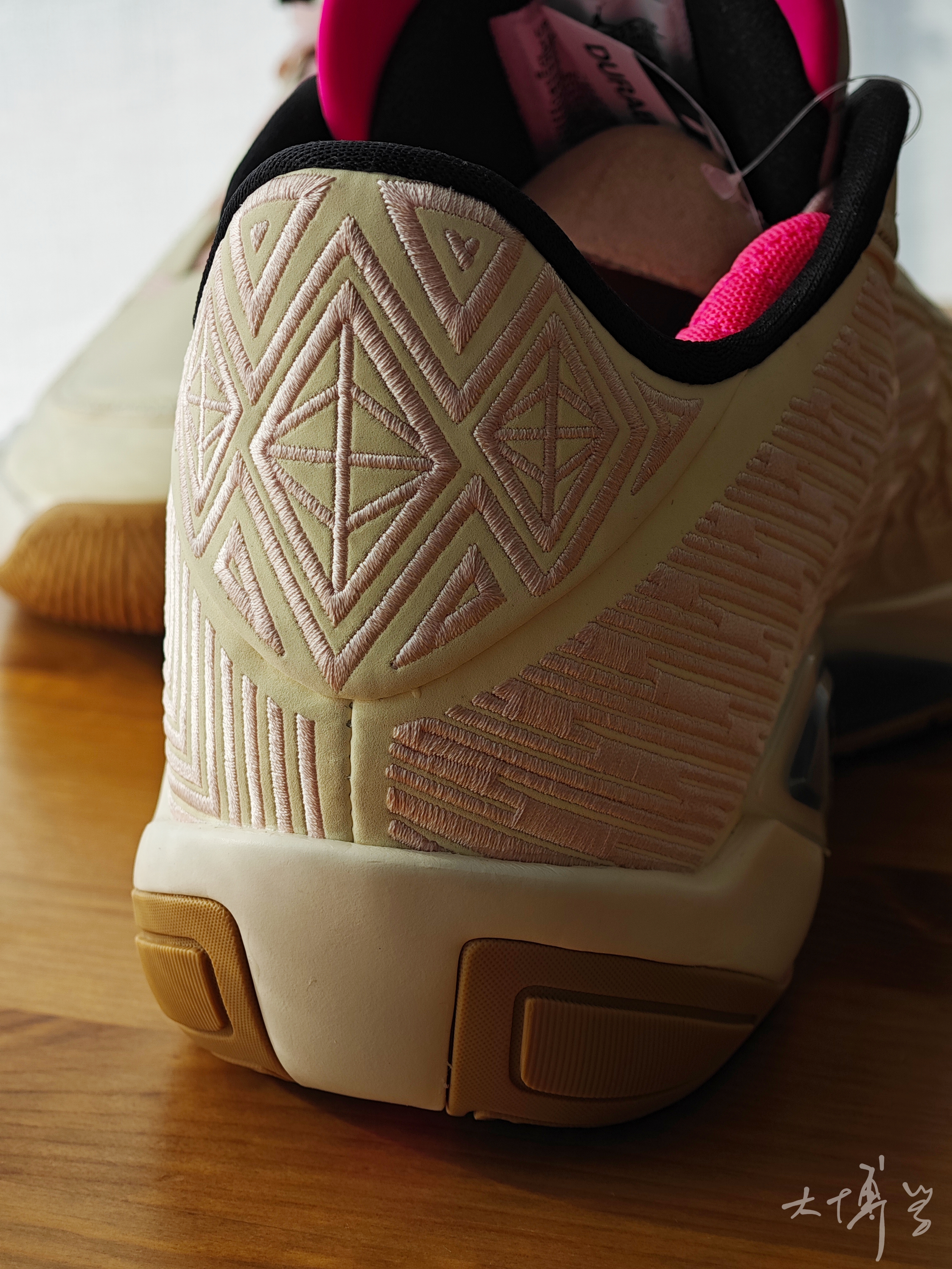 AJ 38 low要比AJ 38好看太多了 拿到这双low之后,我心里一直都这么想 扁平的鞋面换了造型 增加一层面料,看起来饱满多了,也更立体 鞋跟那些刺绣还在,只是变换了位置 后跟的刺绣让我想到了韦德的鞋 这双配色也好看 米色加粉色,加棕色鞋底 这款的颜值,我是满意的