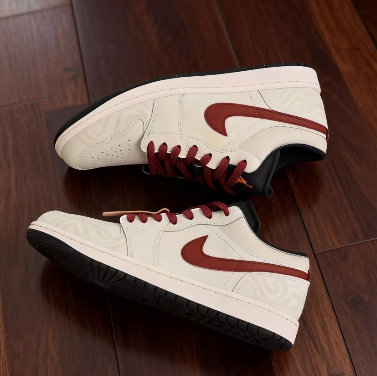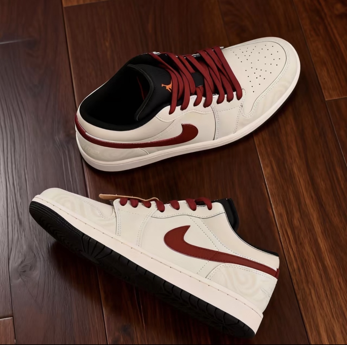 上脚这双AJ1 Low快一个月了,米白配酒红的配色低调又有质感,鞋身的暗纹还藏着小细节。脚感很软,日常通勤、逛展或者和朋友打球都穿它,搭牛仔裤、运动裤甚至休闲西装都不违和。对我来说,它不只是一双鞋,更像出门随手抓的百搭伙伴,舒服又省心。