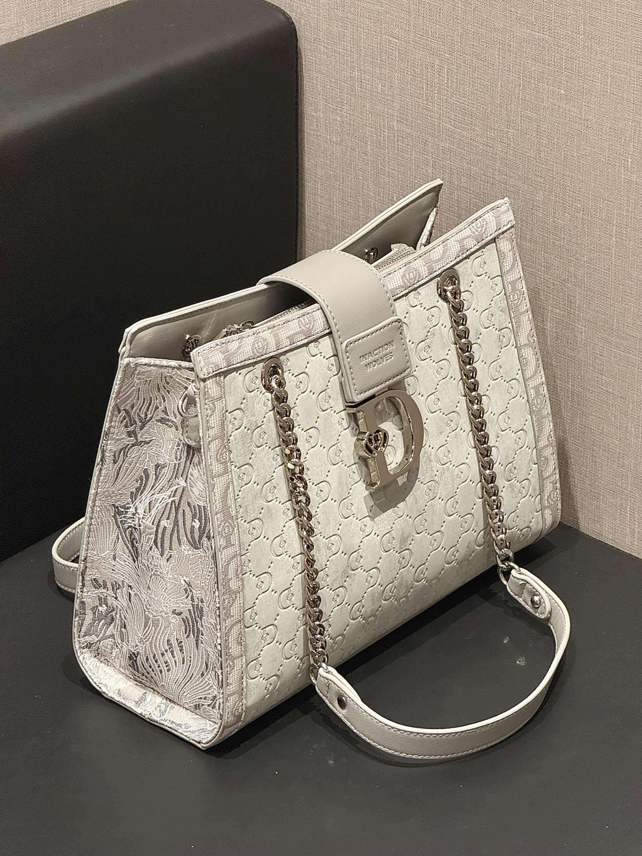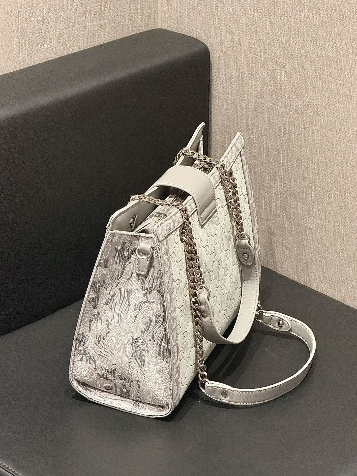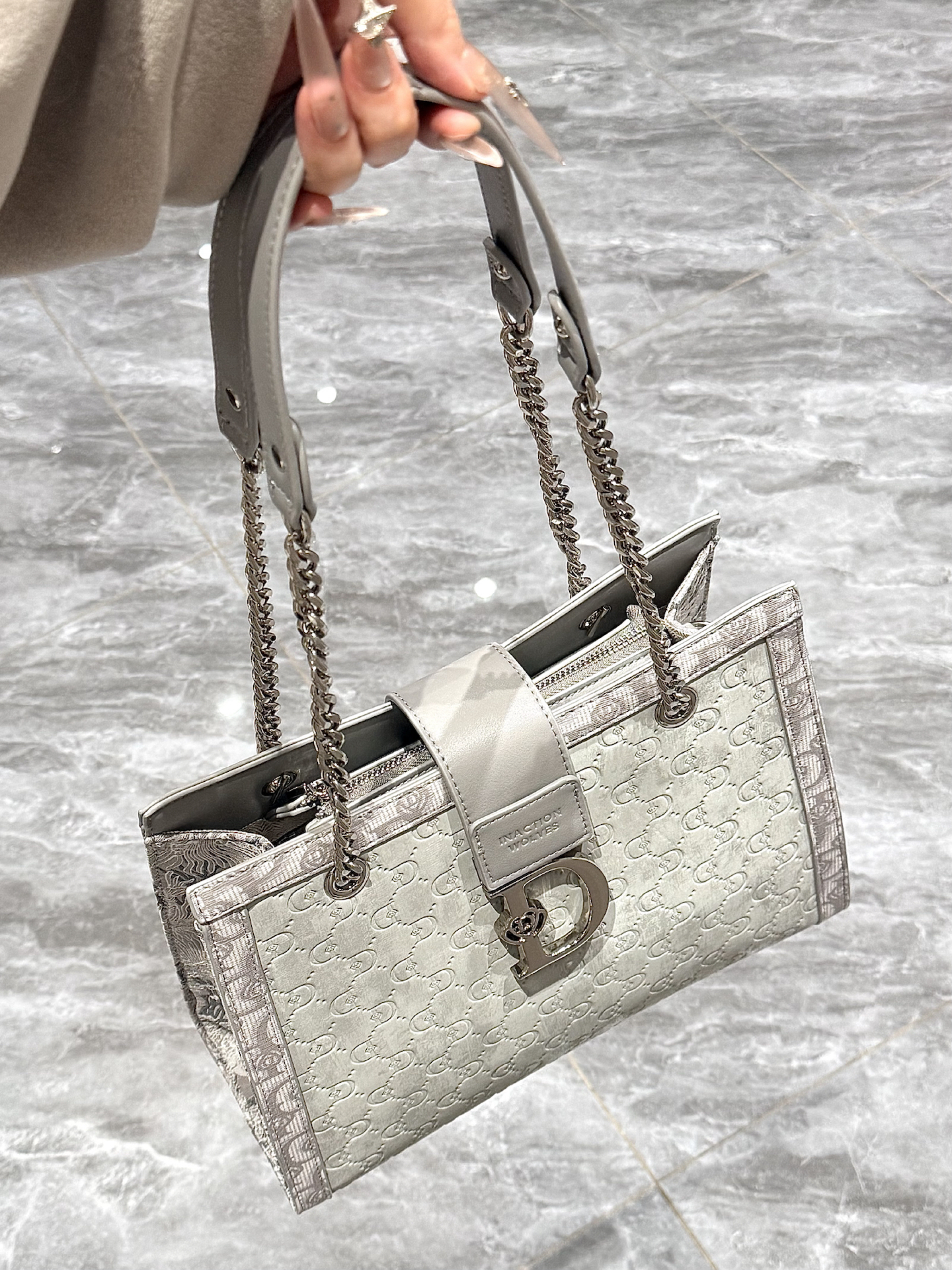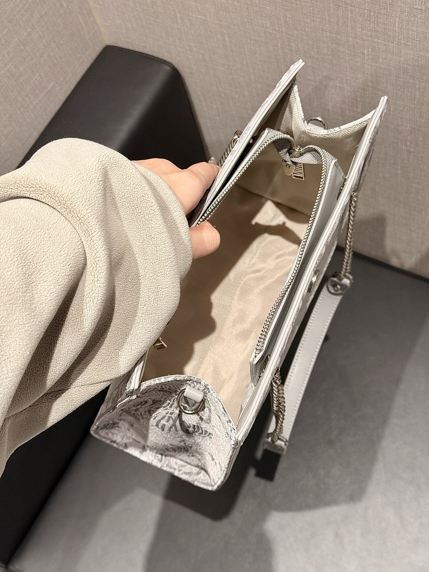 介个雾霾灰大托特包也太好看了吧 丝绒的质地很显高级 容量也挺大的 日常的东西都装得下 秋冬搭配大衣也太有气质了!