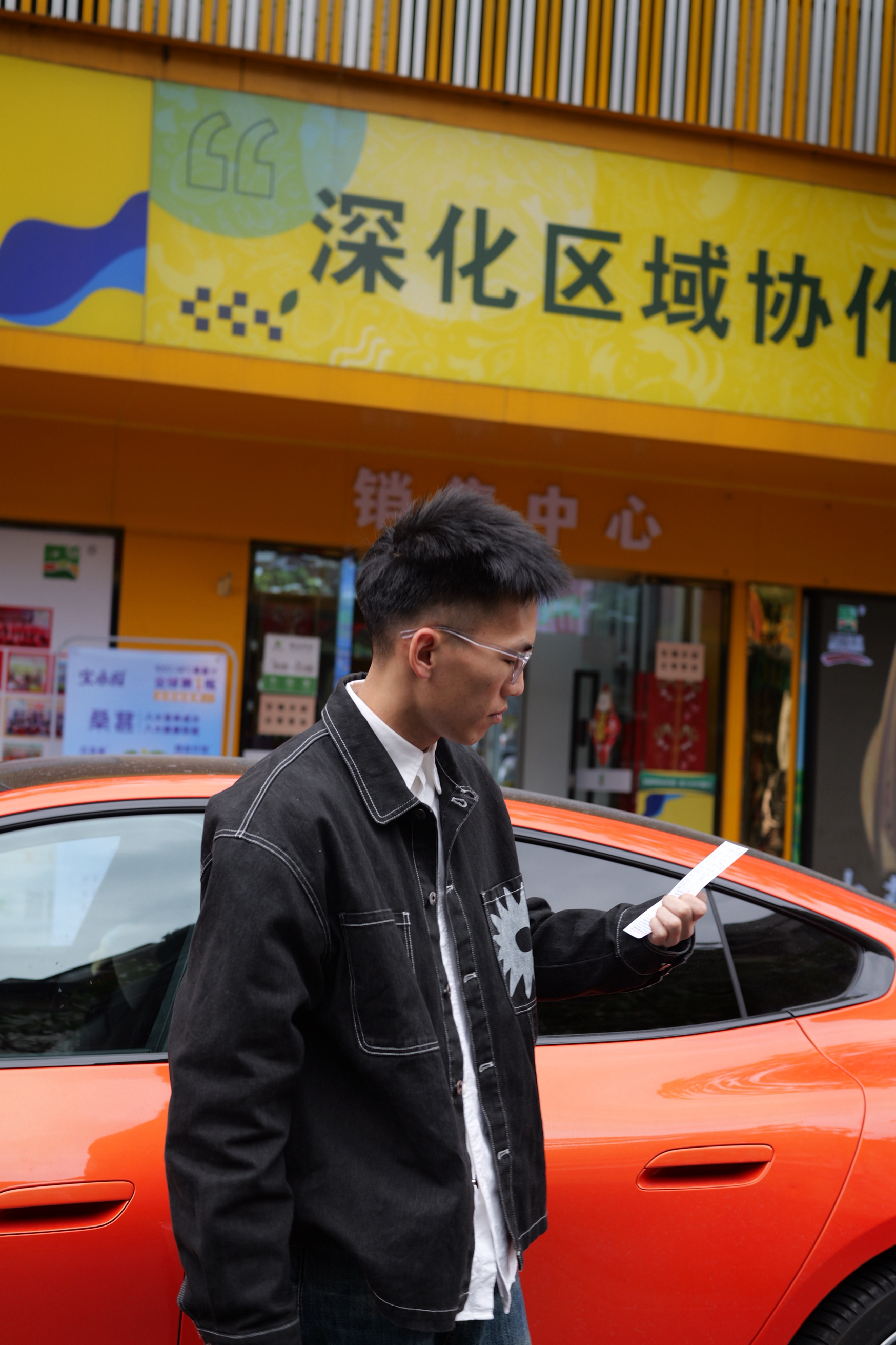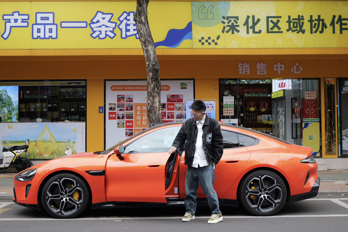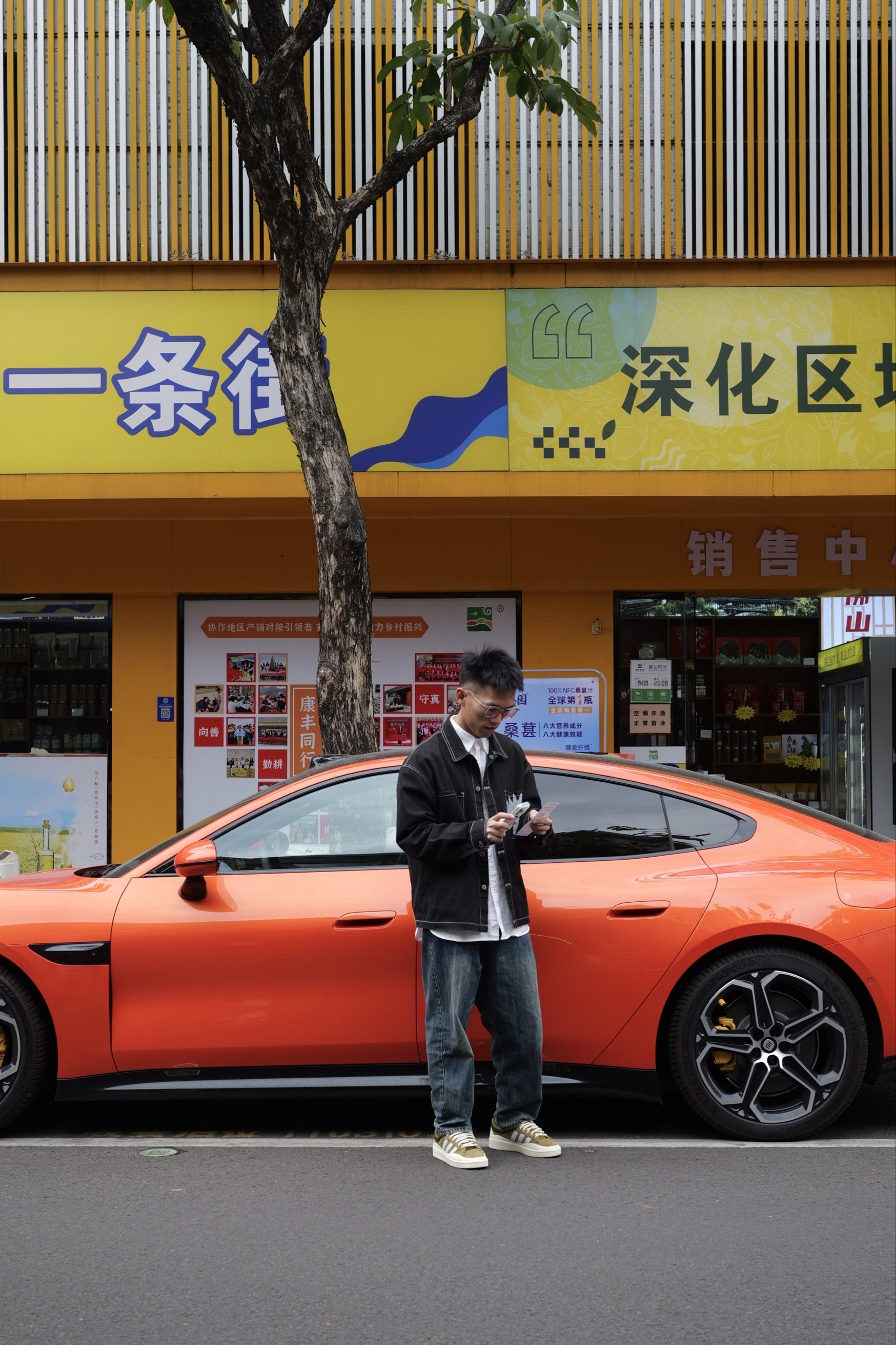 降温的广东突然要穿三件了 没有阳光的街道 和 熔岩橙的Su7 👔:Futuremade 👖:UrbanStandard 👟:Bad Bunny Adidas Campus