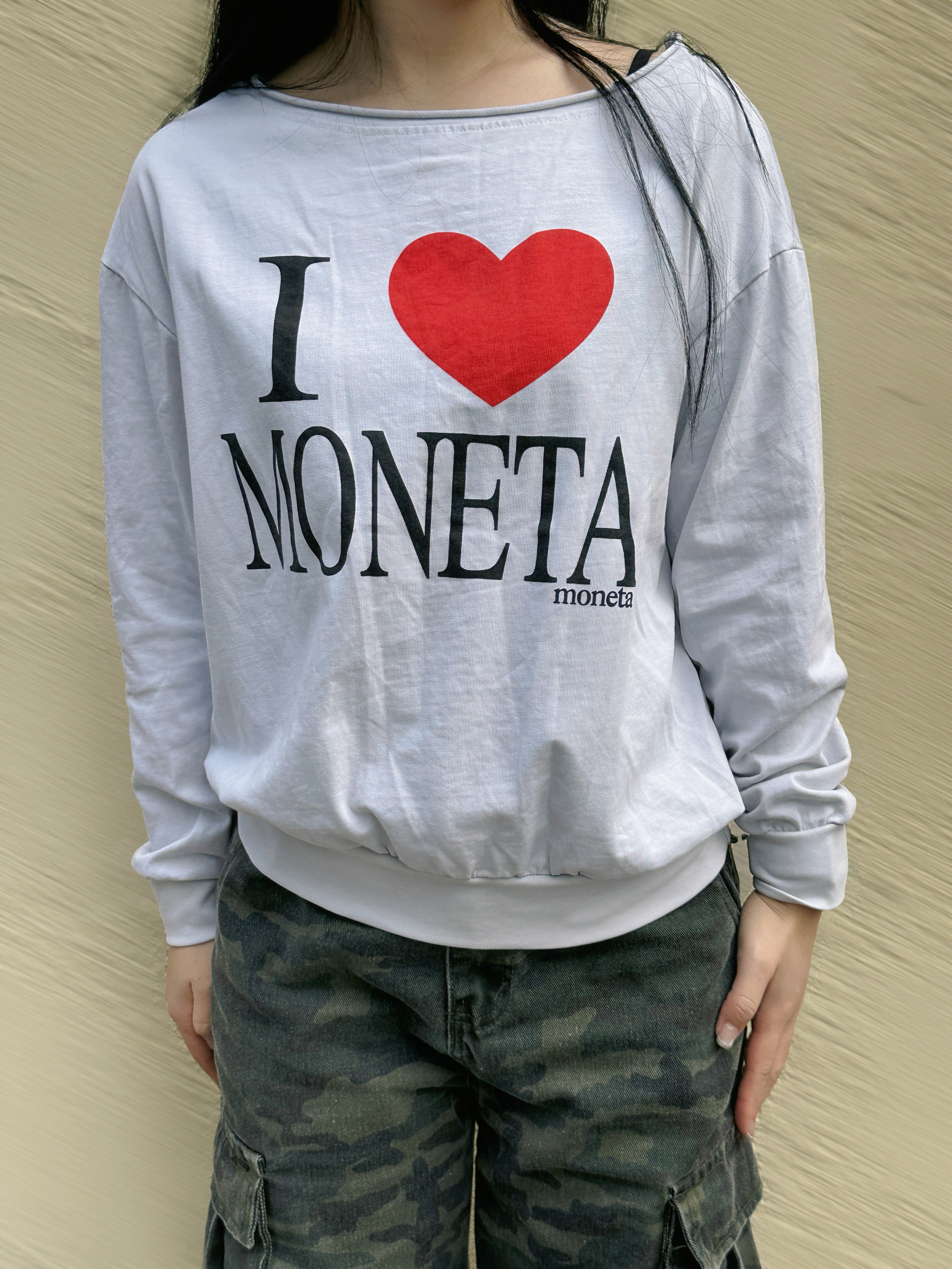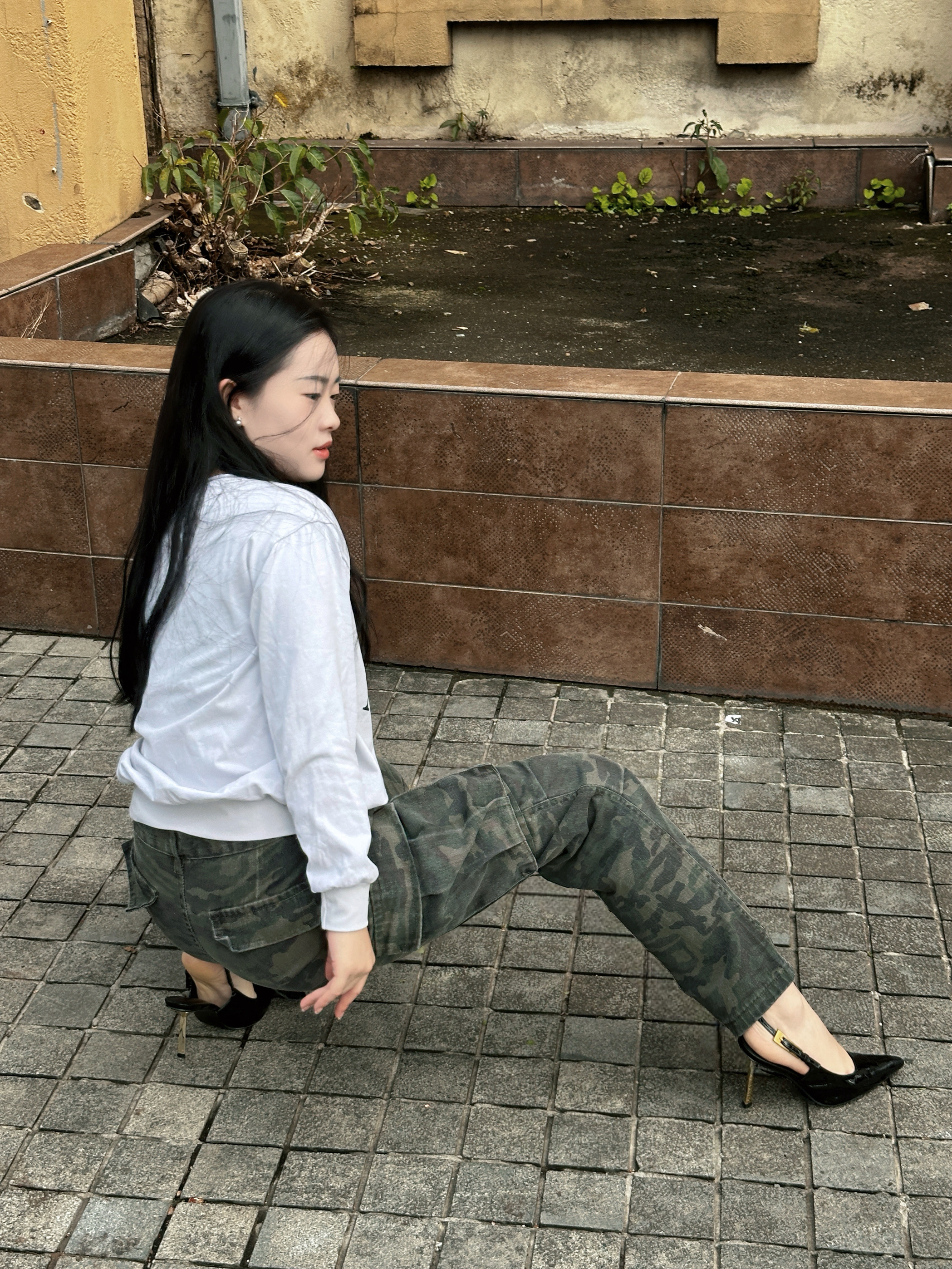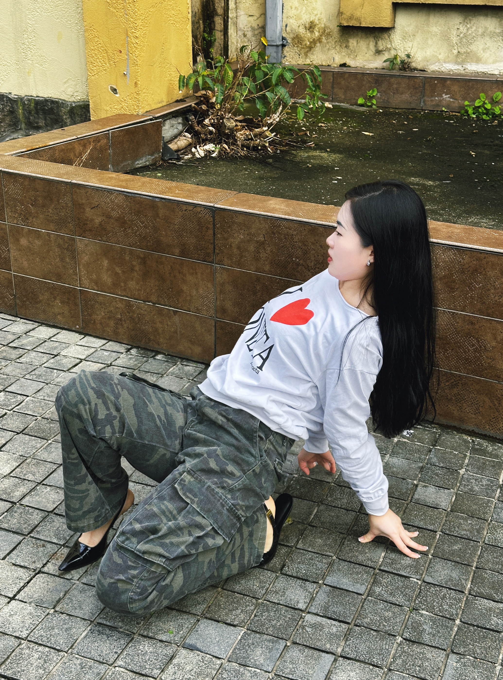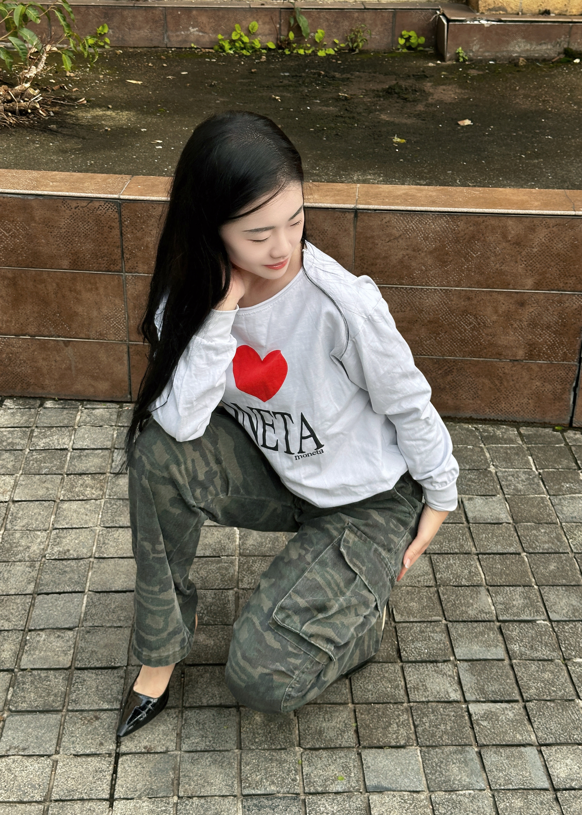 白爱心印花卫衣搭迷彩工装裤✨,甜酷风格碰撞,配尖鞋衬出随性街拍氛围📸