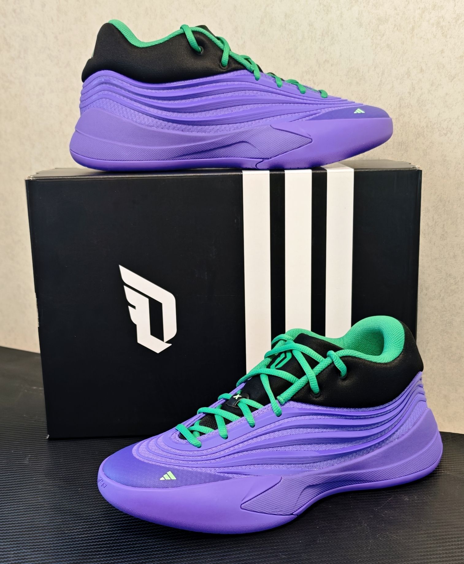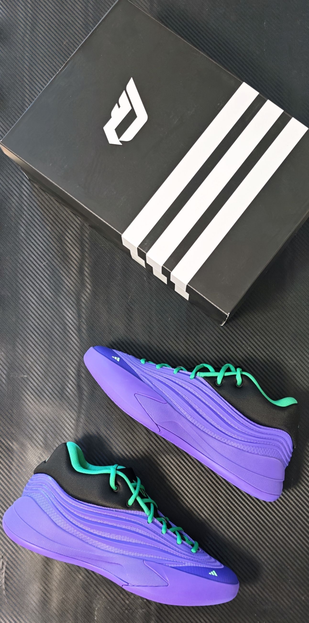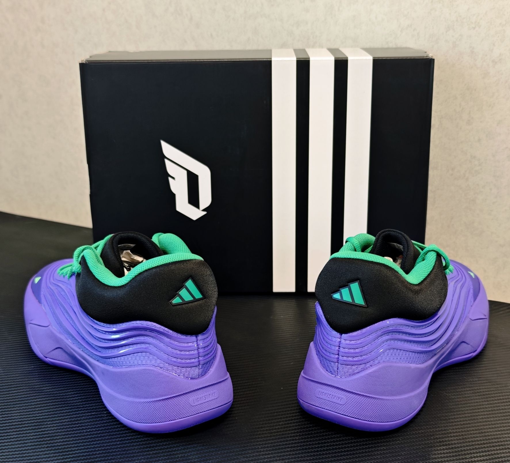 adidas 利拉德 10 代 实战评测 开箱印象 利拉德系列鞋盒一贯的简约风格,这款配色并不是单纯的亮紫,而是带有一种深邃的、类似于夜空渐变的感觉,辅以鞋舌、后跟等处的黑色区块进行视觉分割,沉稳中透着犀利。那一抹荧光绿鞋带,无疑是点睛之笔,如同暗夜中的一道闪电,瞬间激活了整个设计的运动感与潮流属性。整体做工扎实,鞋面材质层次丰富,预示着不俗的实战定位。 外观设计 - 配色:紫色是利拉德的...