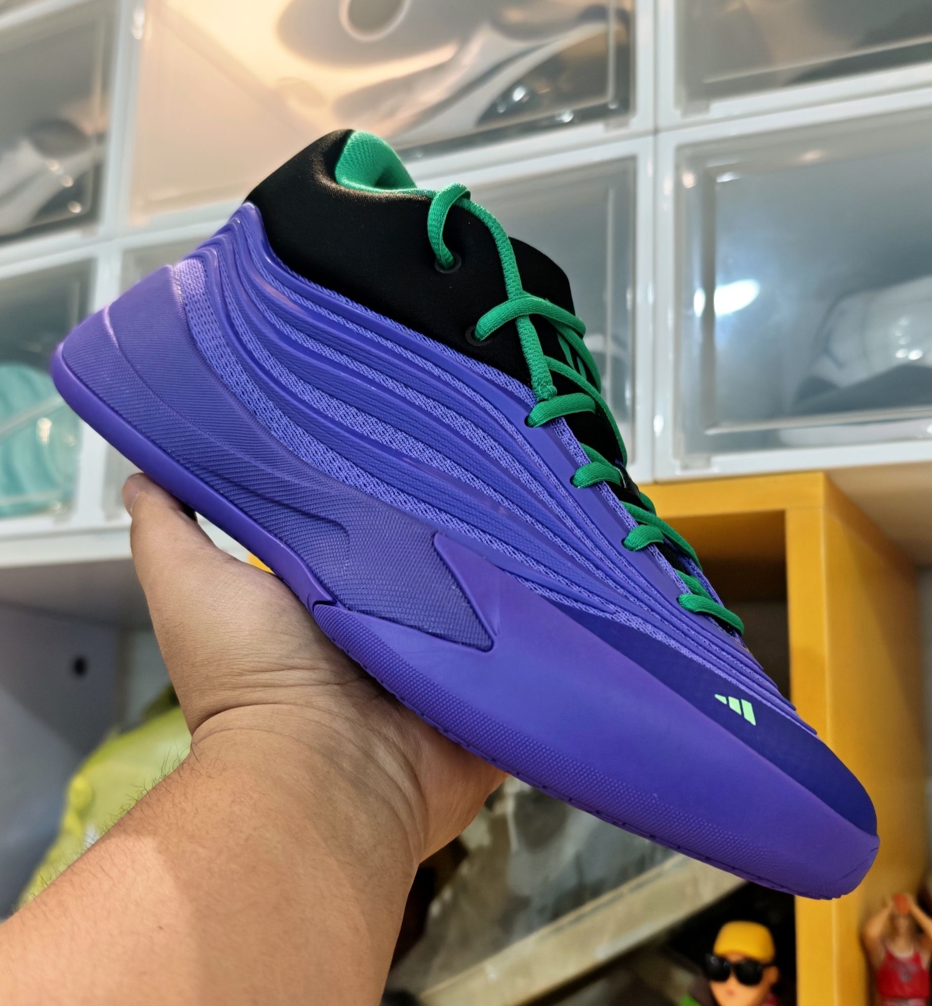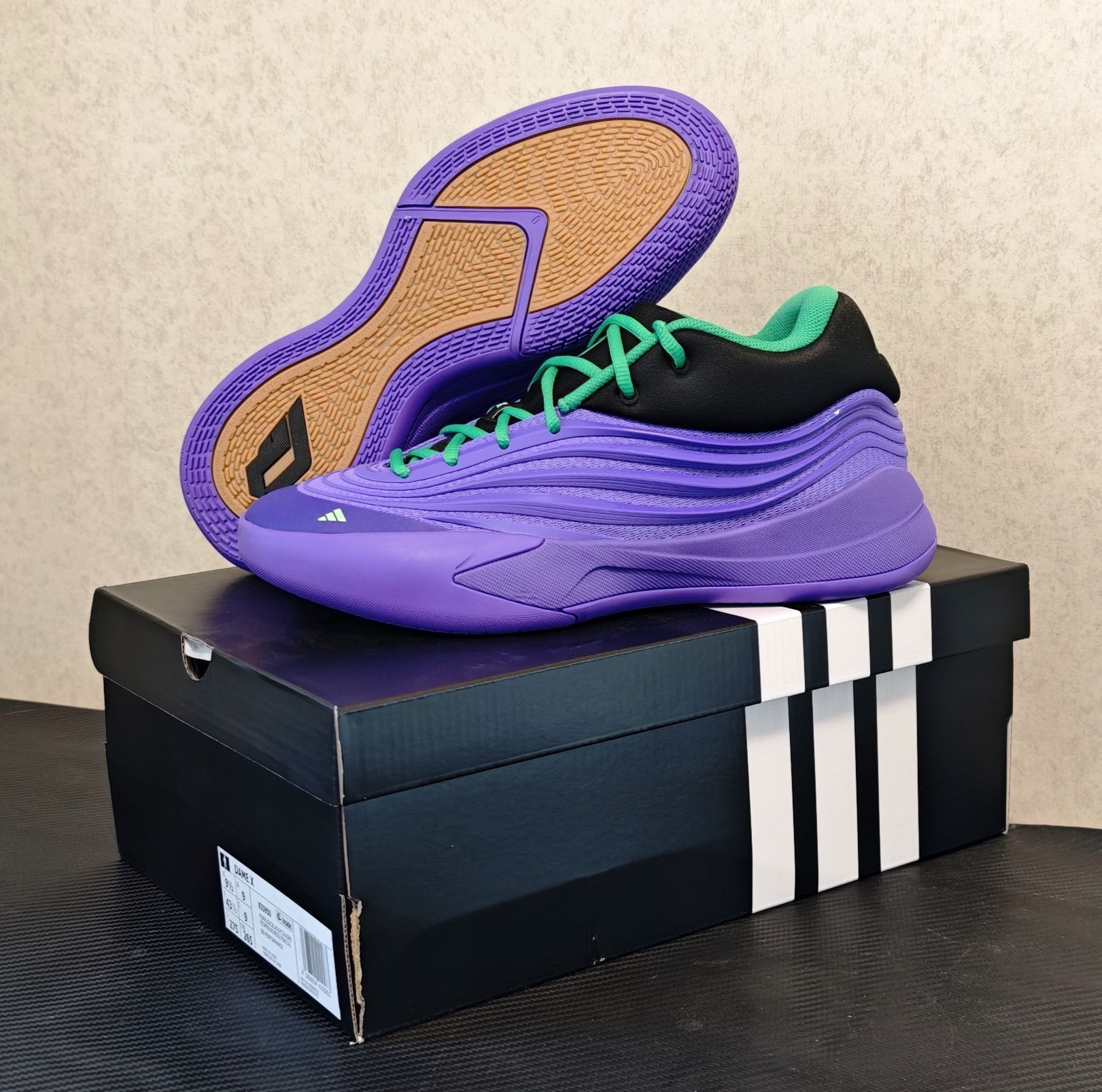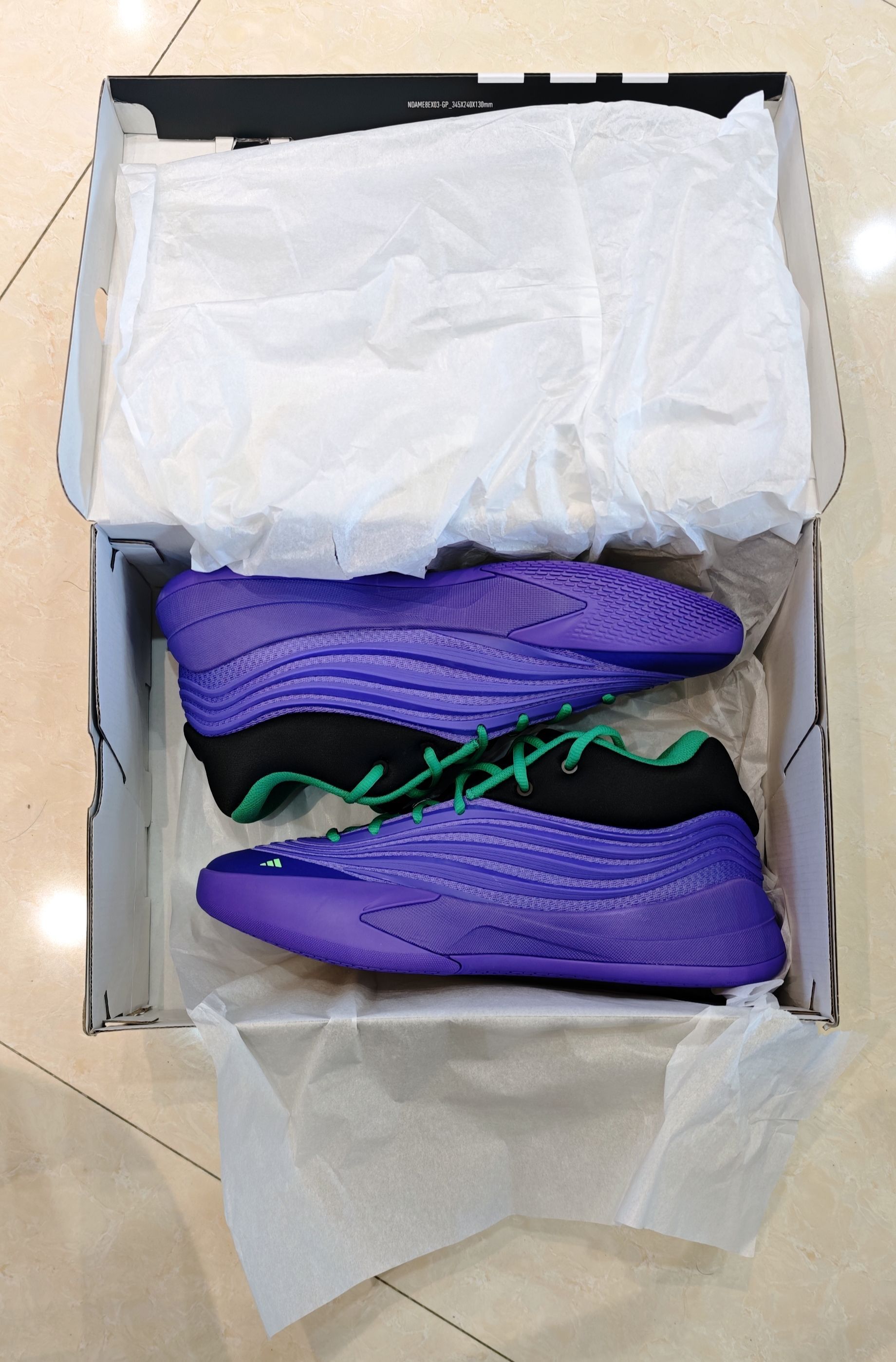adidas 利拉德 10 代 实战评测 开箱印象 利拉德系列鞋盒一贯的简约风格,这款配色并不是单纯的亮紫,而是带有一种深邃的、类似于夜空渐变的感觉,辅以鞋舌、后跟等处的黑色区块进行视觉分割,沉稳中透着犀利。那一抹荧光绿鞋带,无疑是点睛之笔,如同暗夜中的一道闪电,瞬间激活了整个设计的运动感与潮流属性。整体做工扎实,鞋面材质层次丰富,预示着不俗的实战定位。 外观设计 - 配色:紫色是利拉德的...