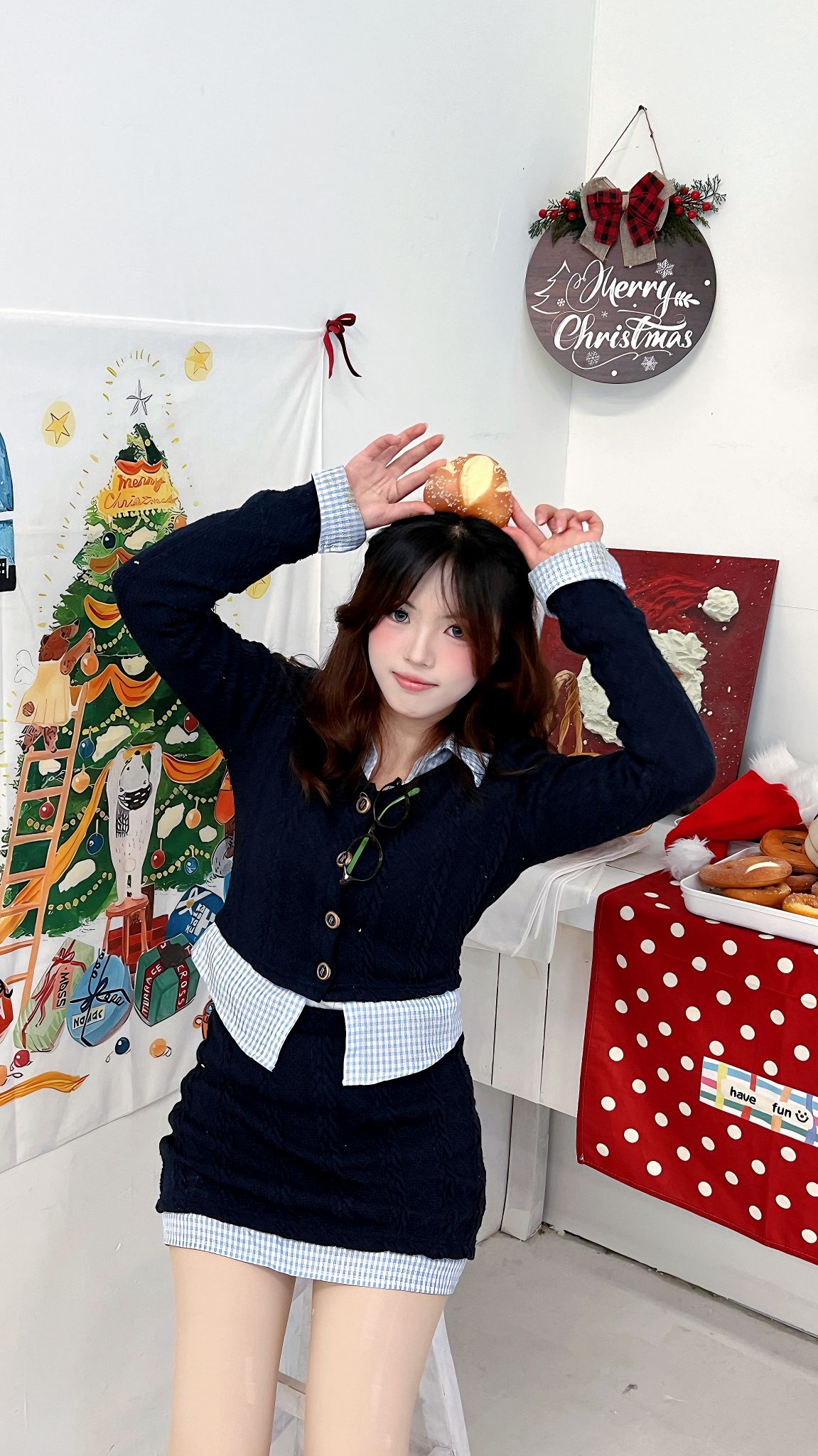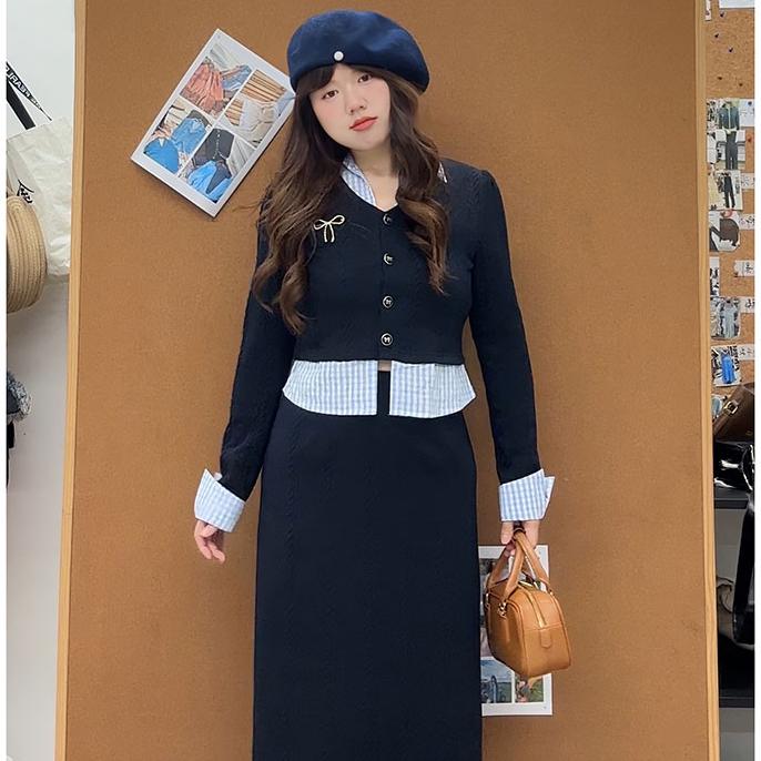 挖到宝的韩系套装,尊嘟很好搭~ 藏青色针织面料软软的很舒服,拼接格纹翻领还带点小设计感 裙子是a字版型,配小皮鞋和堆堆袜 很韩系的一套,拍照也嘎嘎出片呢