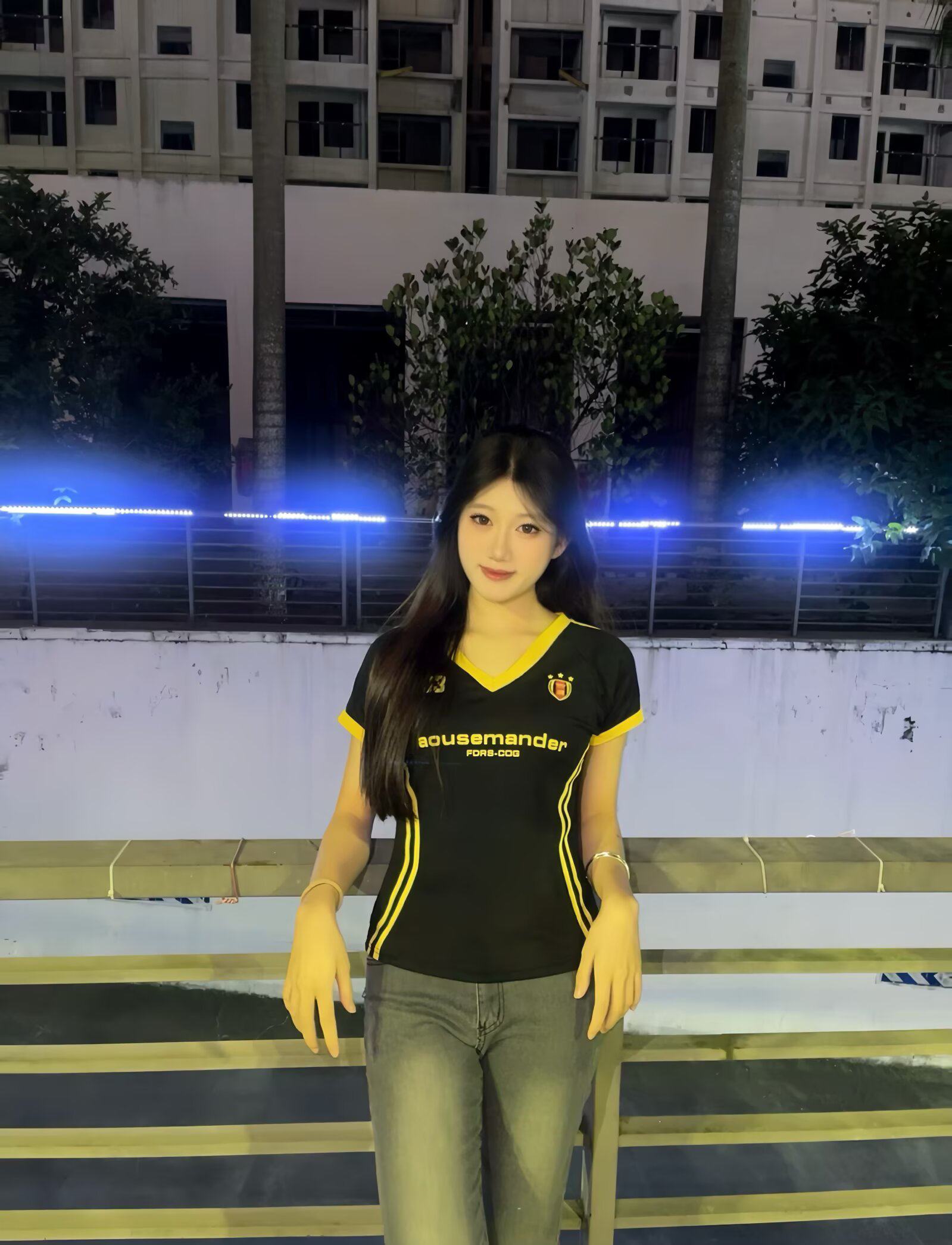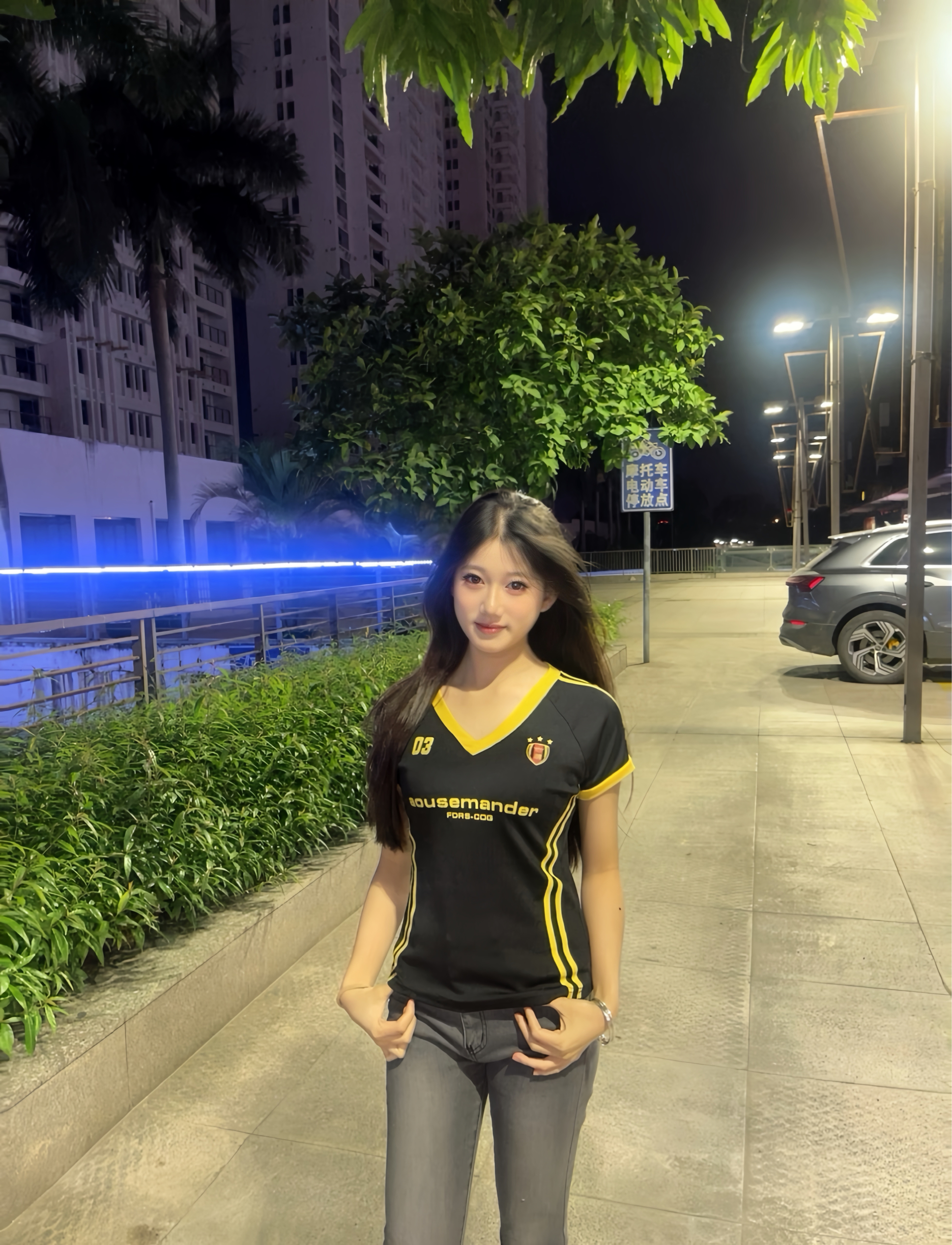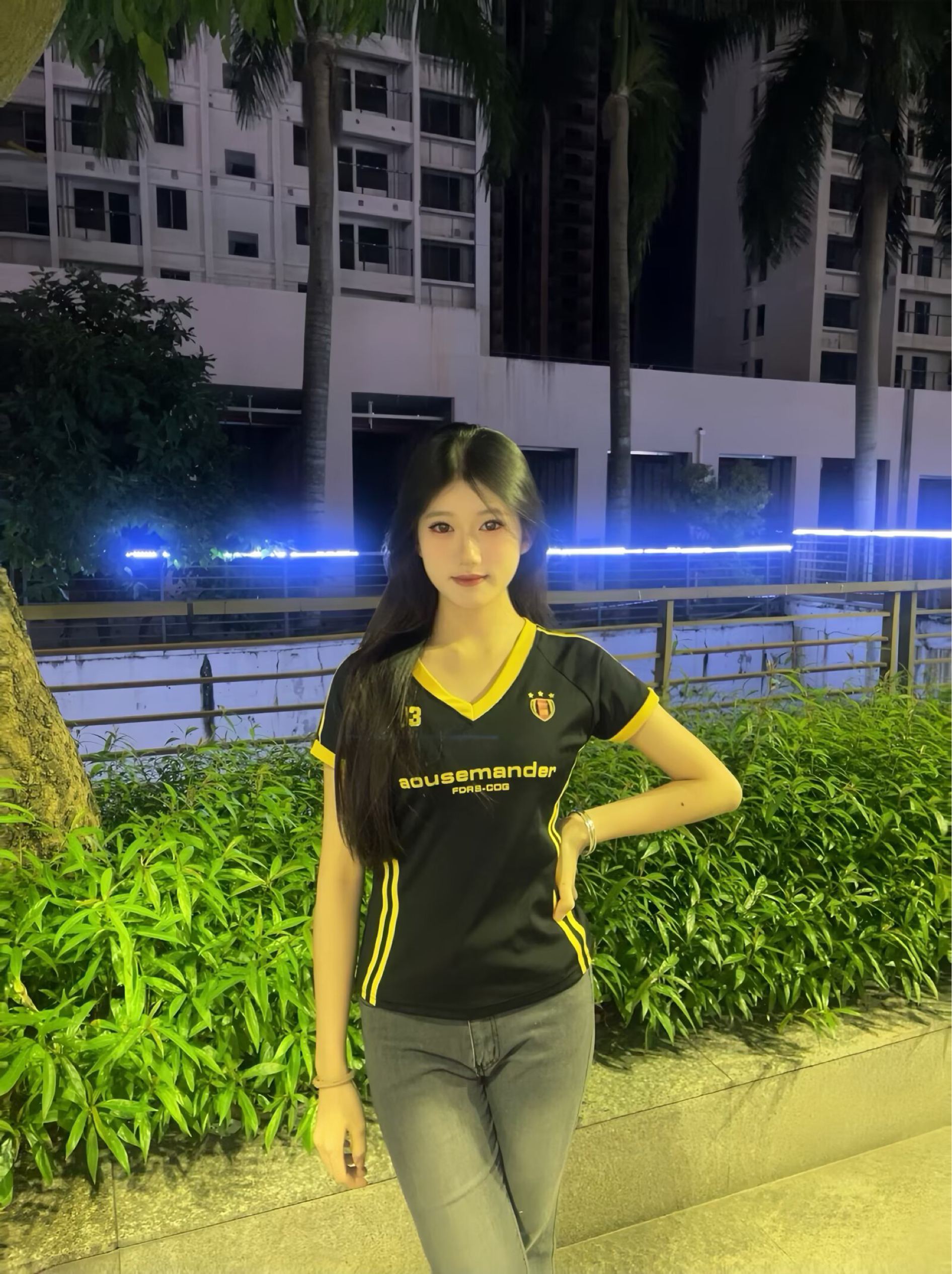 这身黑黄配色的运动风穿搭 既有街头的活力感 又不失简约利落 宽松的版型让行动很自在 不会有束缚感 深色系的上衣和牛仔裤的组合 在夜晚的灯光下显得很有质感 点缀的黄色细节也为整体增添了亮点 让人在休闲中也能感受到时尚的氛围.