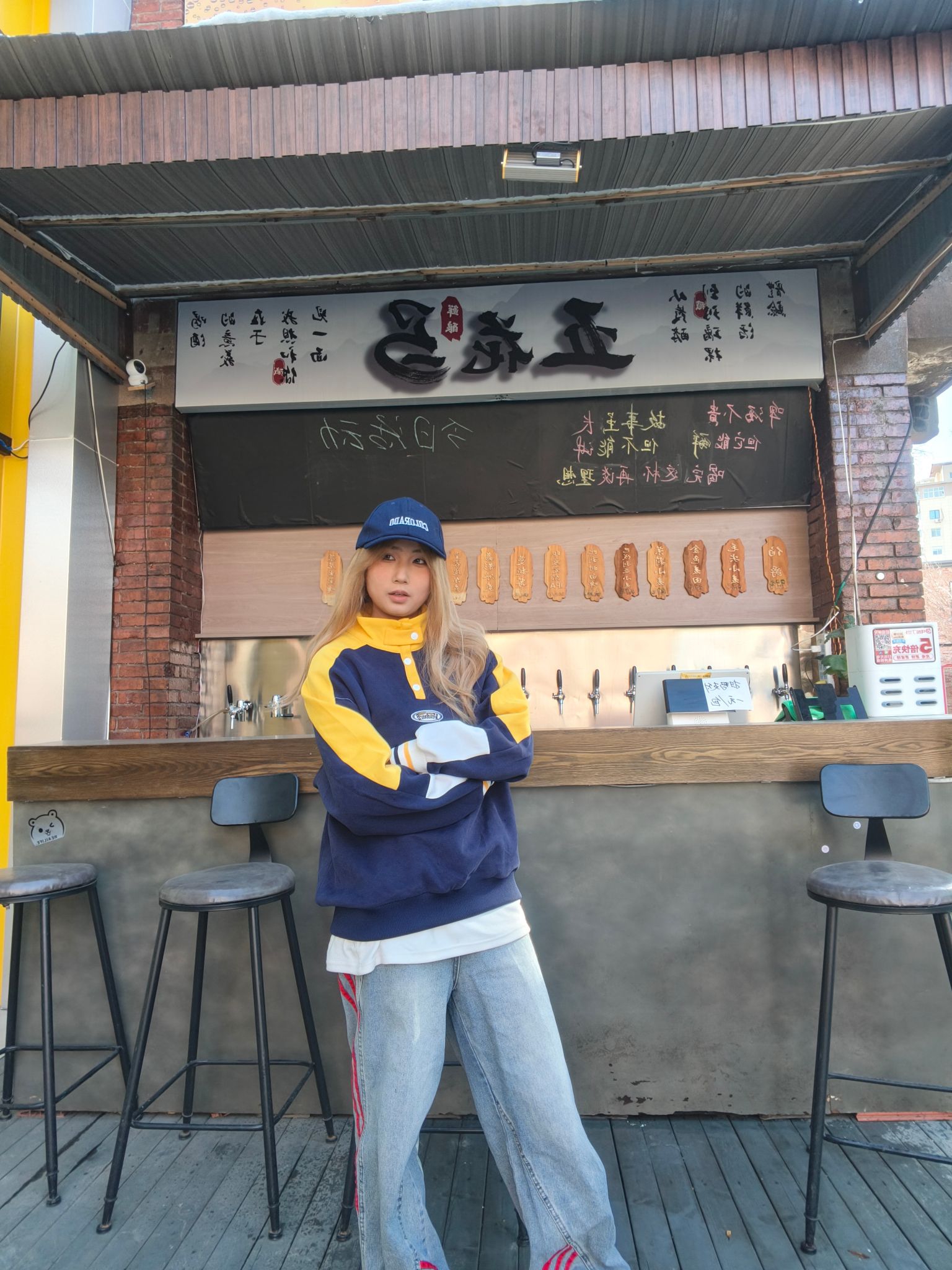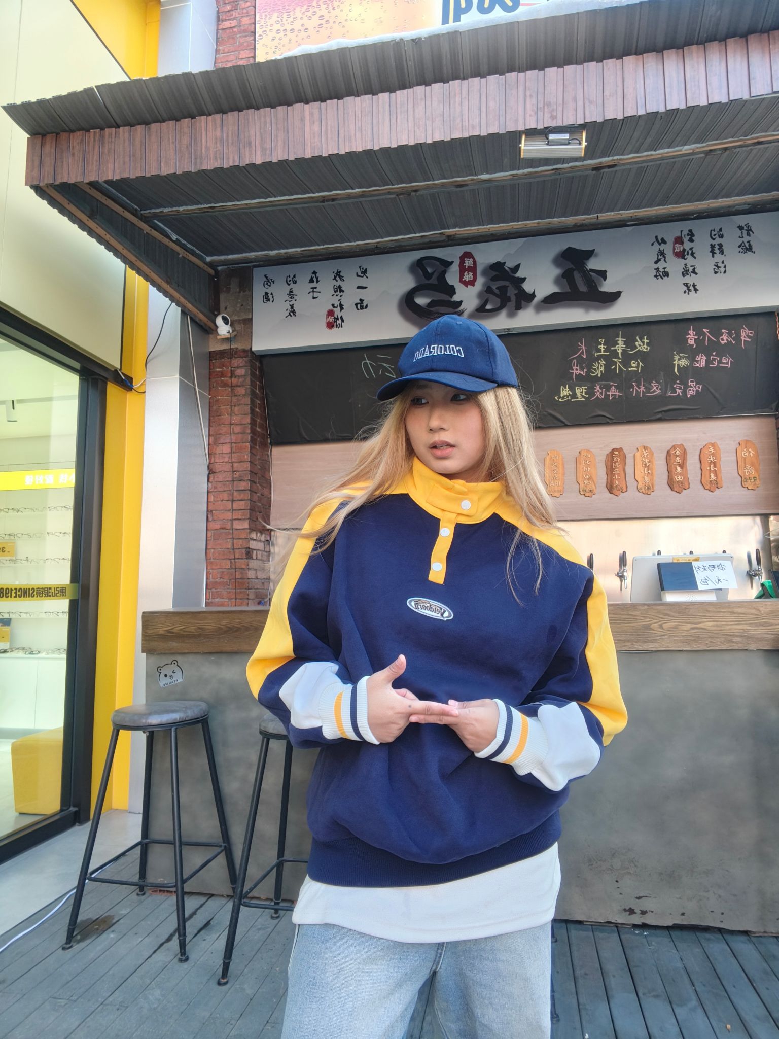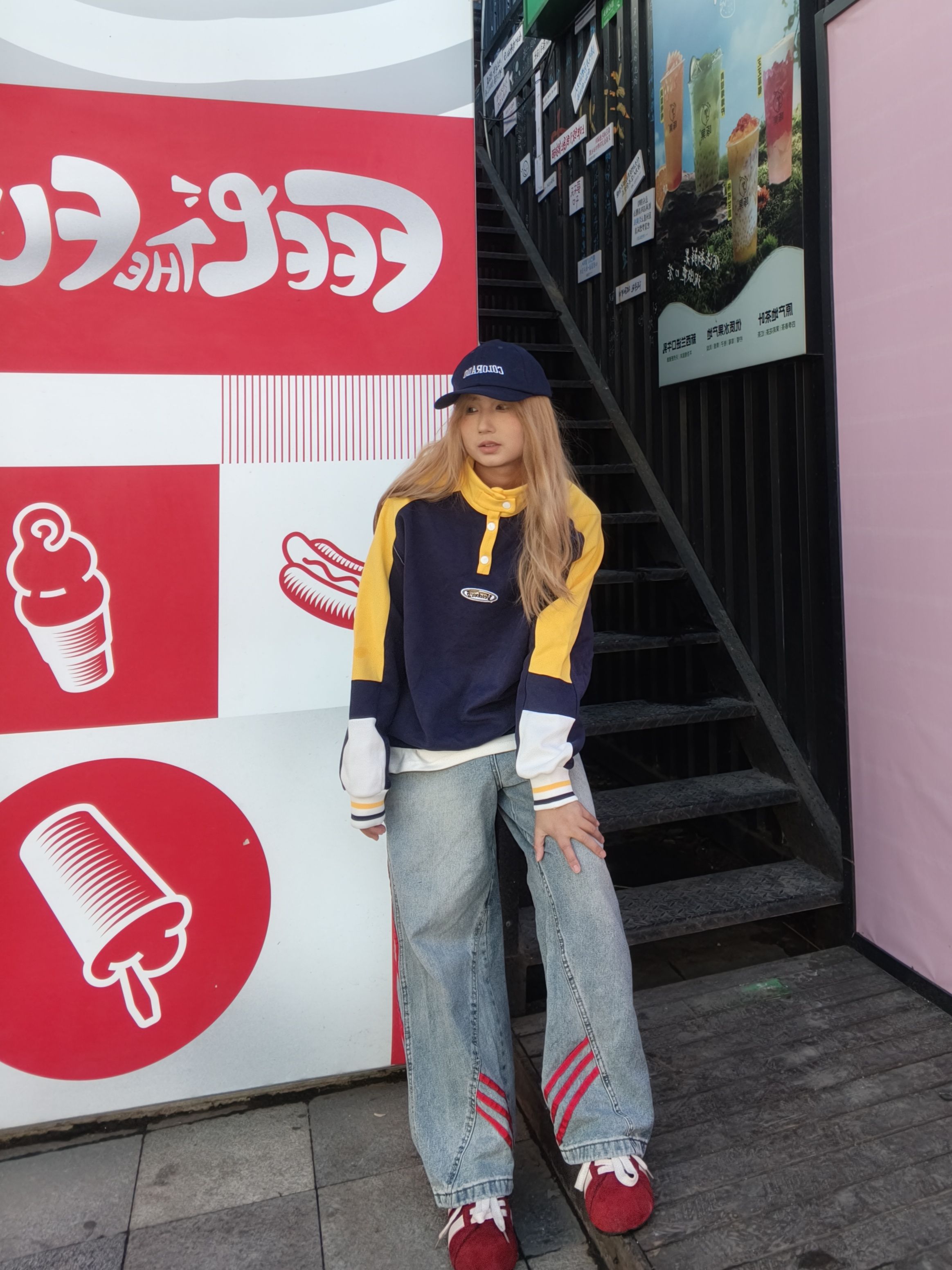 165cm50kgL码,维动VEIDOORN品牌,想美事做美式女,这款卫衣也太符合我的人设了,是那种很阳光很酷的感觉,衣服的拼接设计特别好看且独特,上身之后显的潮流,宽松的版型特别显瘦,领口是开衫扣排的设计,尺码可以参考我的身高体重去拍