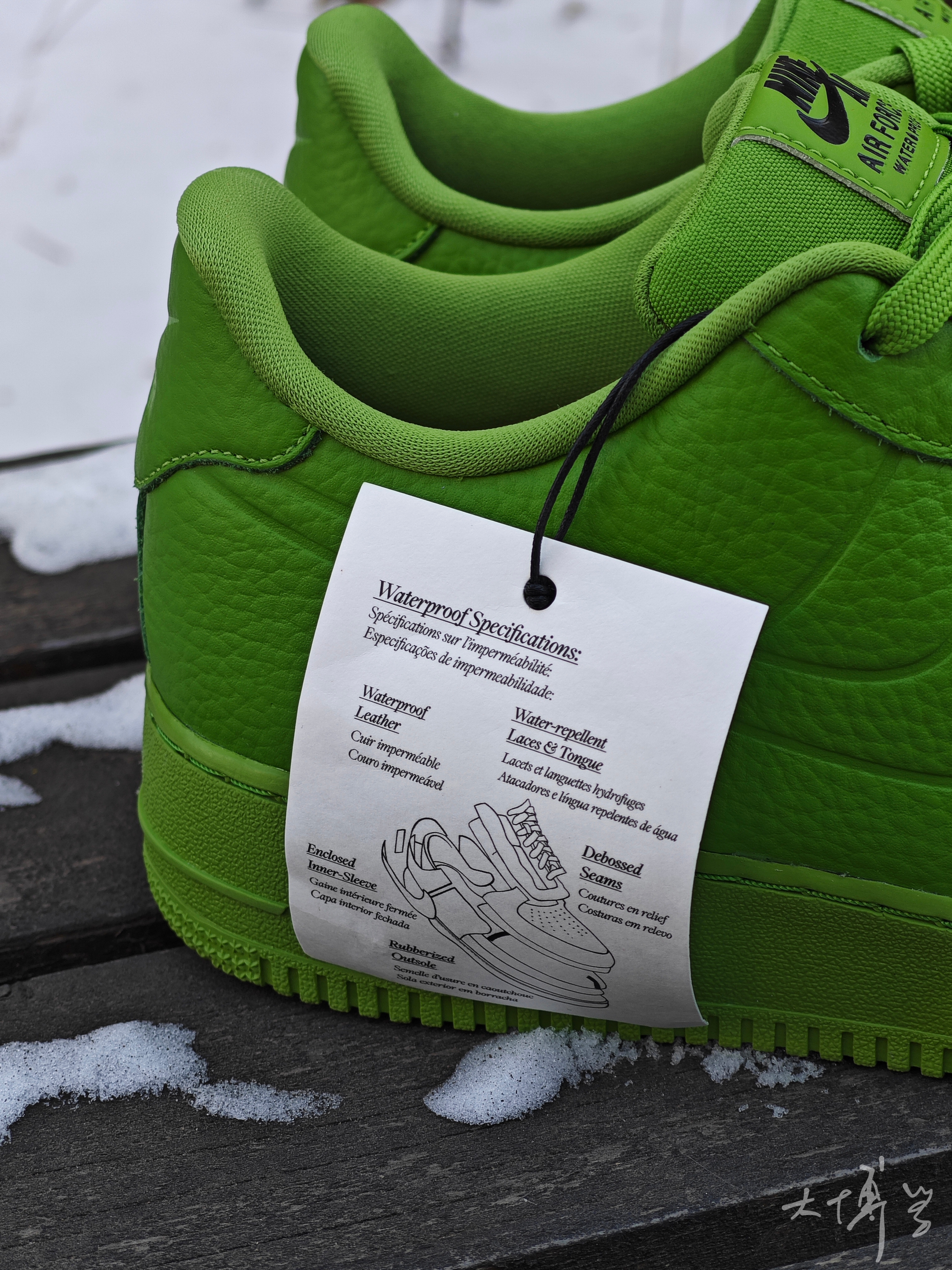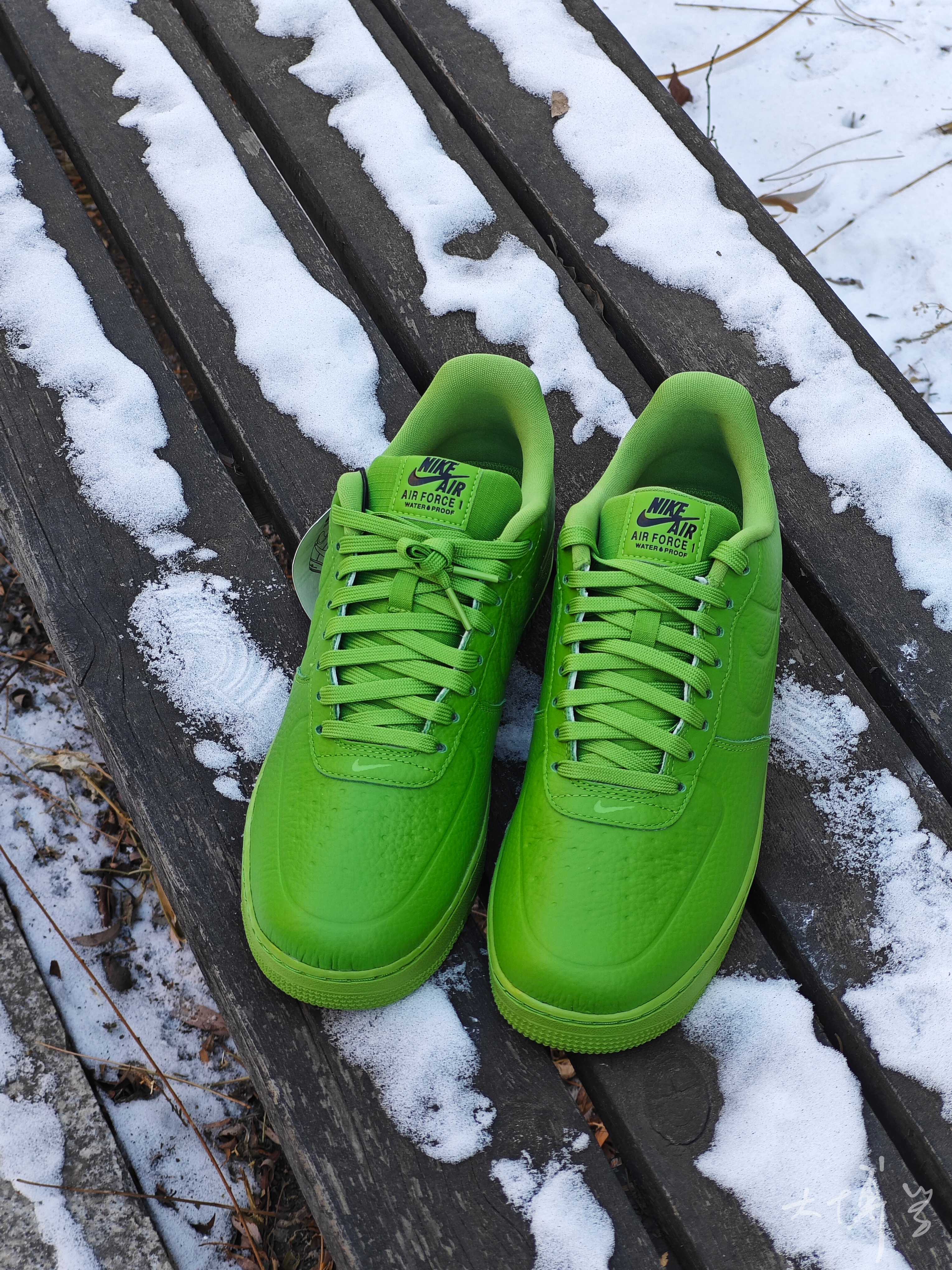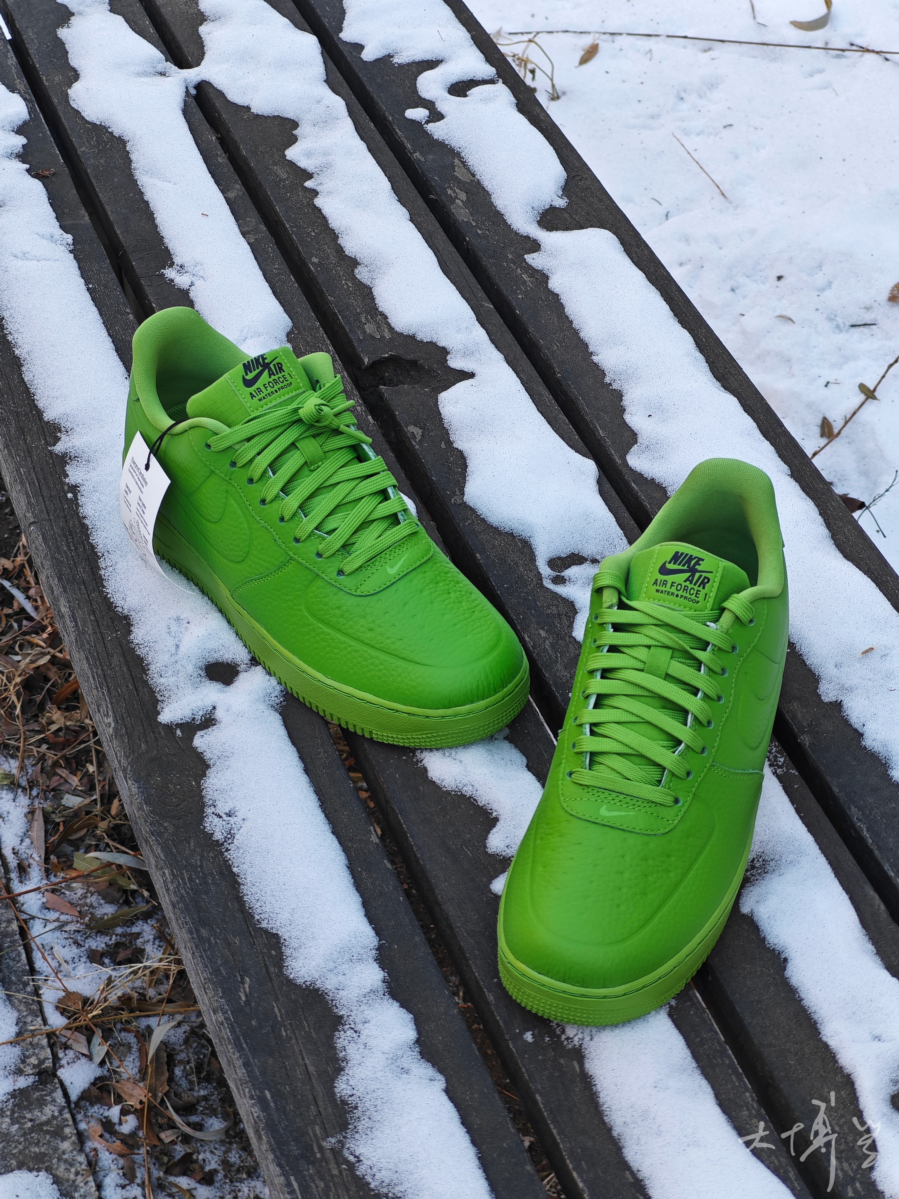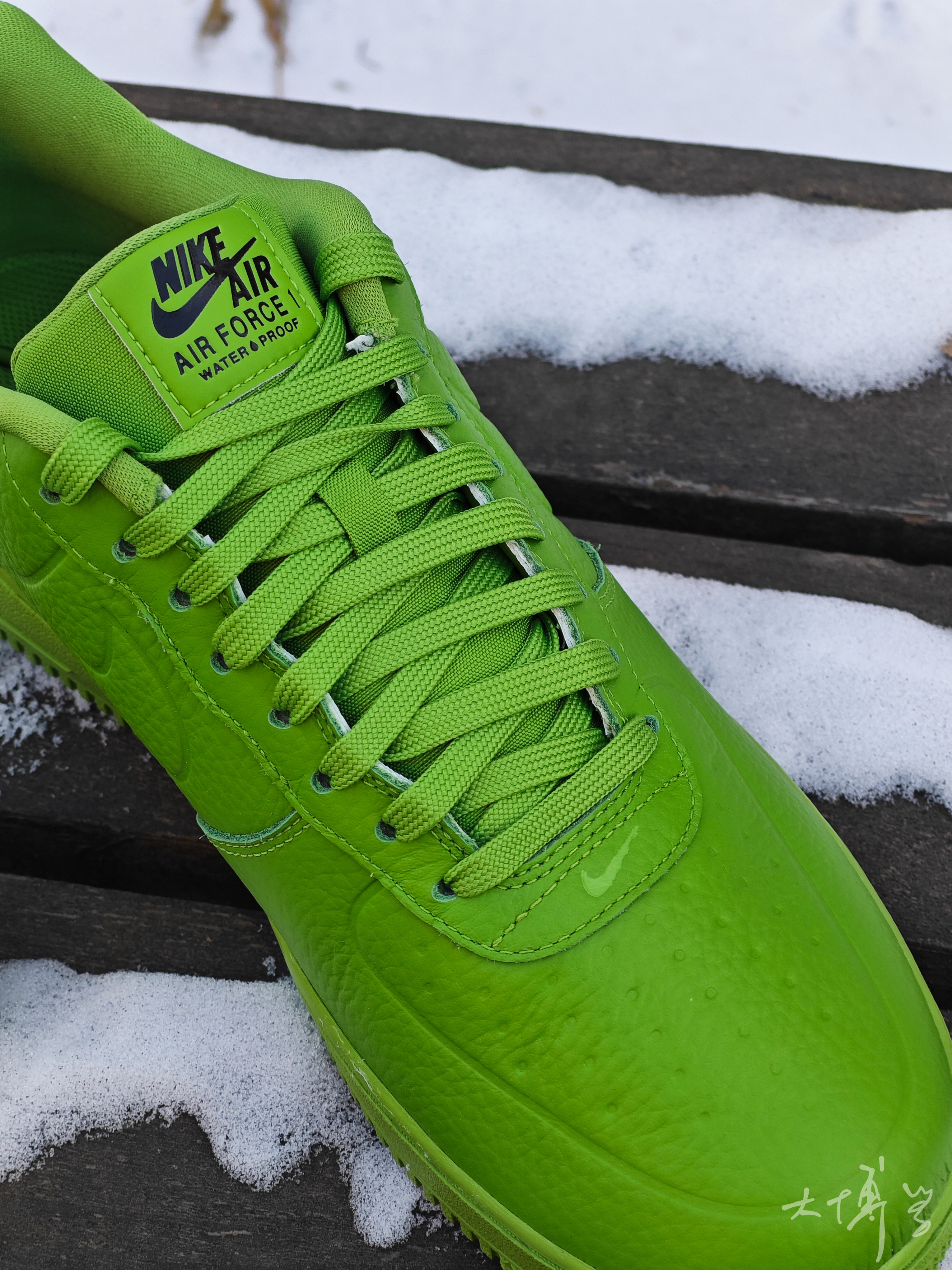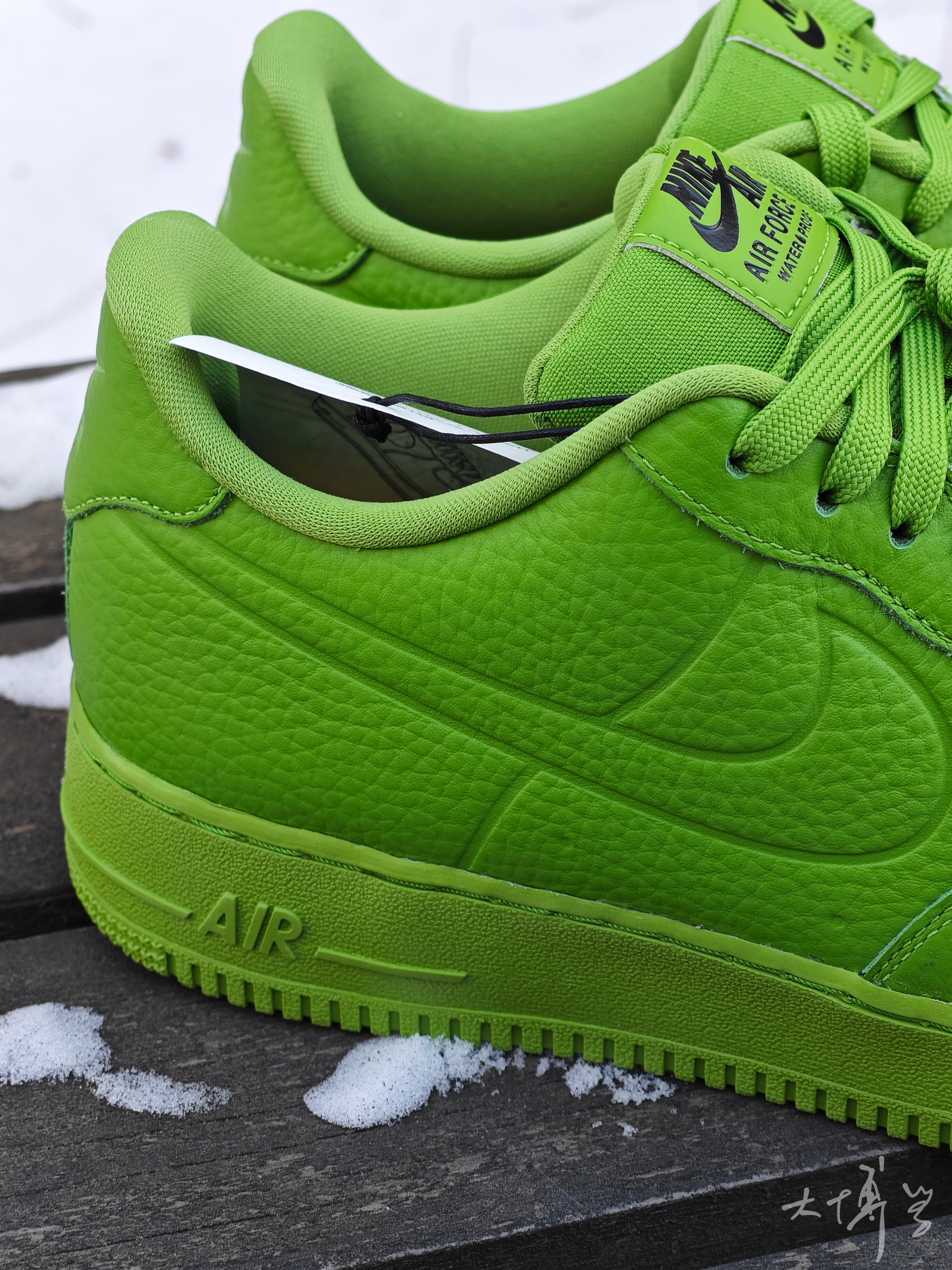 一双颜色很亮眼的AF 1 绿色的皮革鞋面 荔枝纹理很明显 除了配色抢眼,功能也很强大 这双AF 1的鞋面、鞋舌、内衬 都做了防水处理 因为考虑防水要求,鞋面的透气孔都封死了 很多细节都是模具压出来的 鞋底的颜色和鞋面基本一样,色差不大 我是很喜欢这款AF 1 low