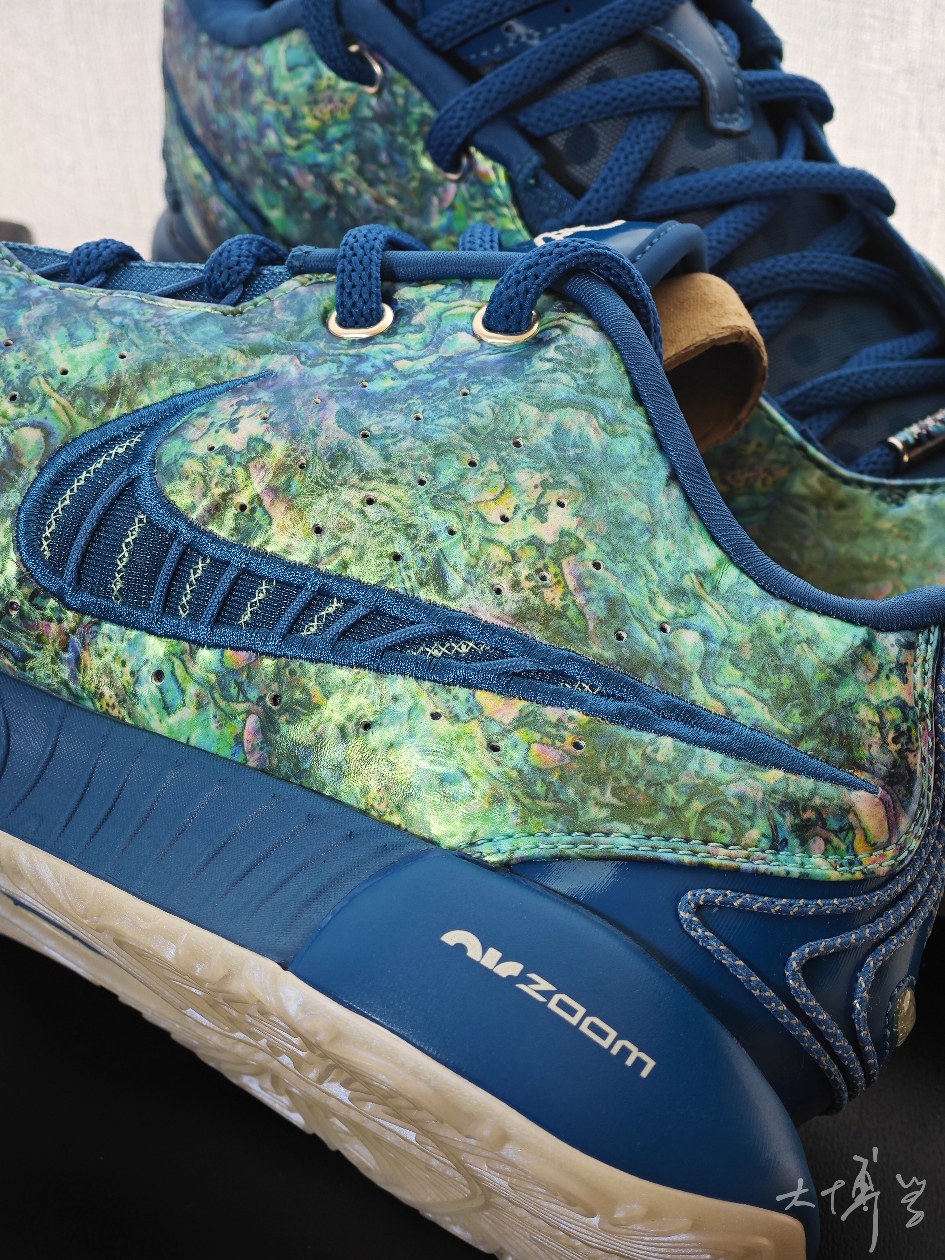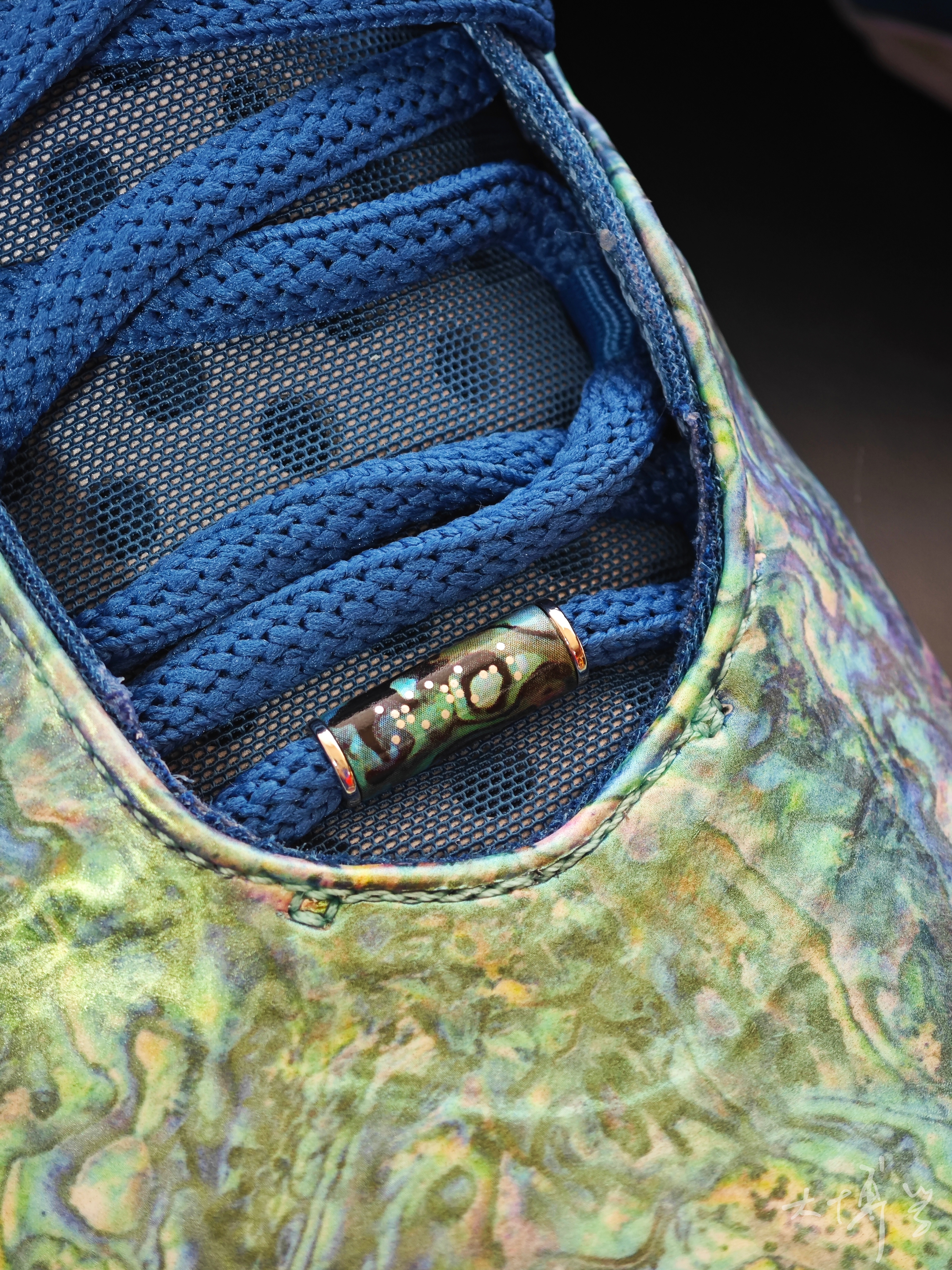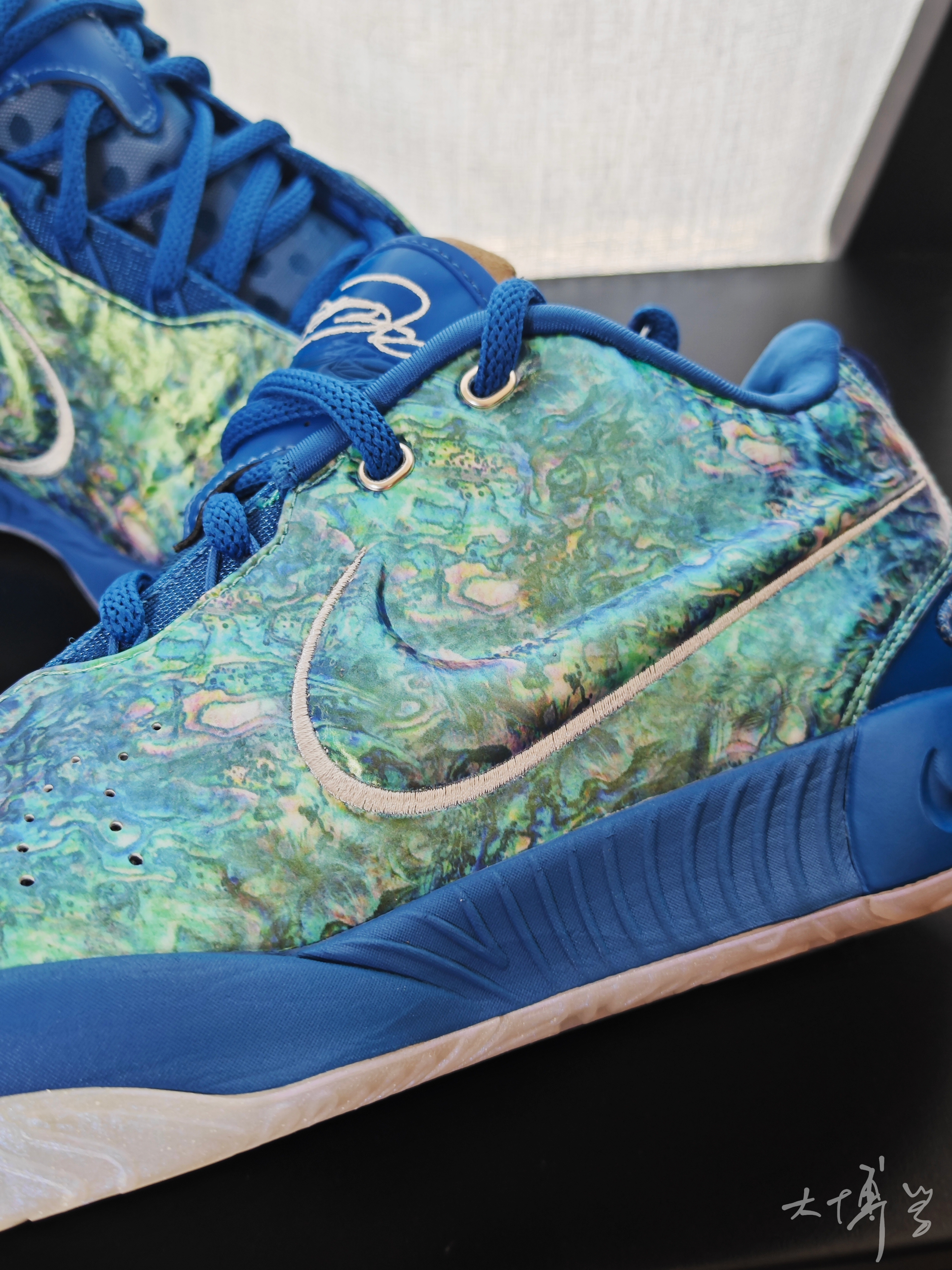 勒布朗21出了很多款 鞋面材质大致分了几种 麂皮,漆皮,人造革 记得好像还有水洗丹宁布 这双蓝绿色的鞋面是人造革的 质感偏硬,鞋面配色很有特点 很像珍珠母贝的感觉 蓝绿的变换光泽 又有大马士革钢的味道 在勒布朗21之中,这款未必最好看 但一定是最有创意的一款