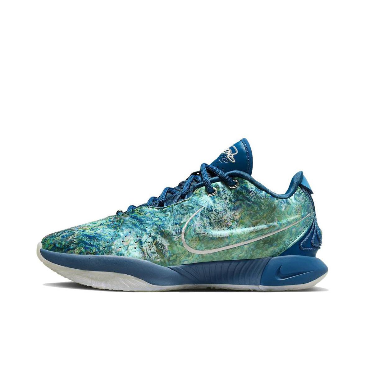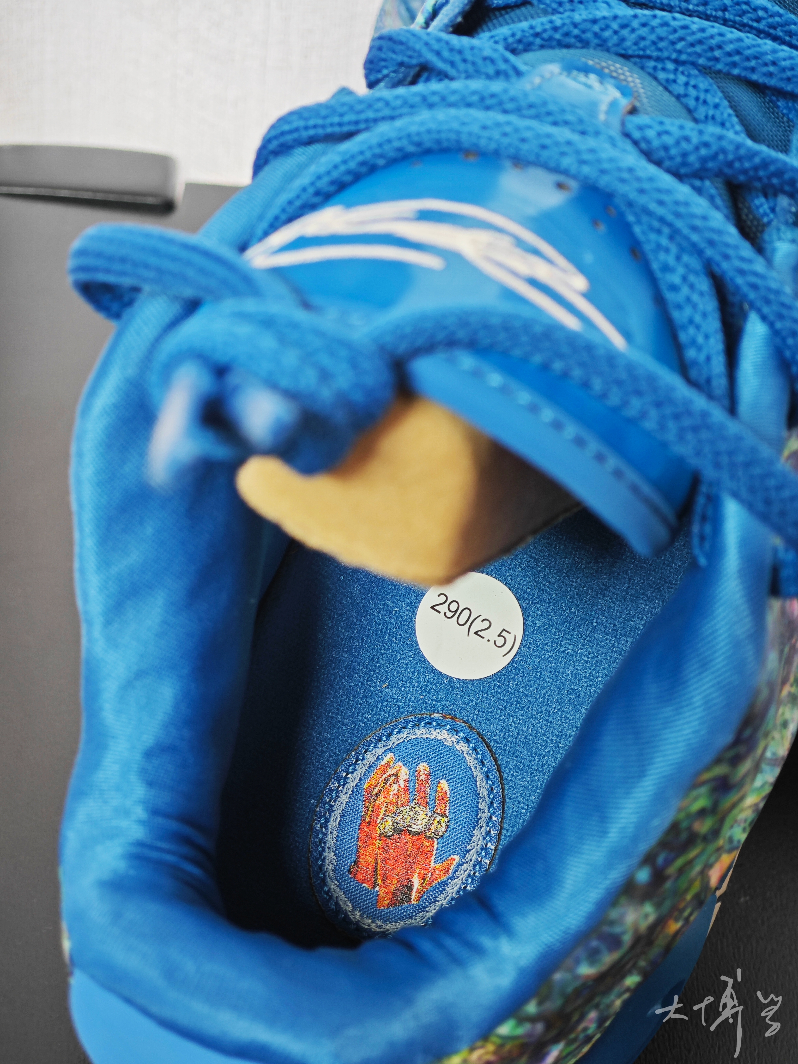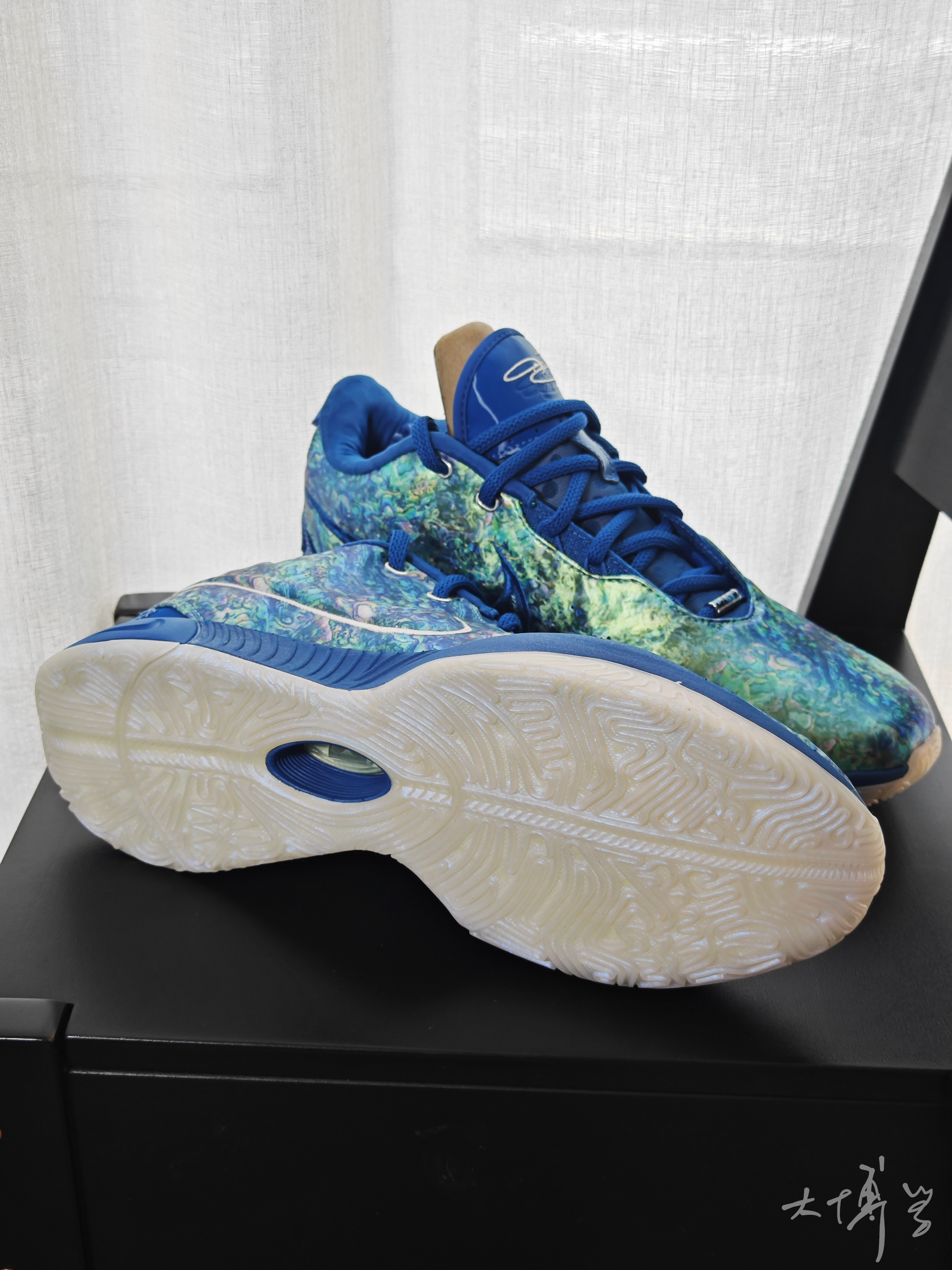勒布朗21出了很多款 鞋面材质大致分了几种 麂皮,漆皮,人造革 记得好像还有水洗丹宁布 这双蓝绿色的鞋面是人造革的 质感偏硬,鞋面配色很有特点 很像珍珠母贝的感觉 蓝绿的变换光泽 又有大马士革钢的味道 在勒布朗21之中,这款未必最好看 但一定是最有创意的一款