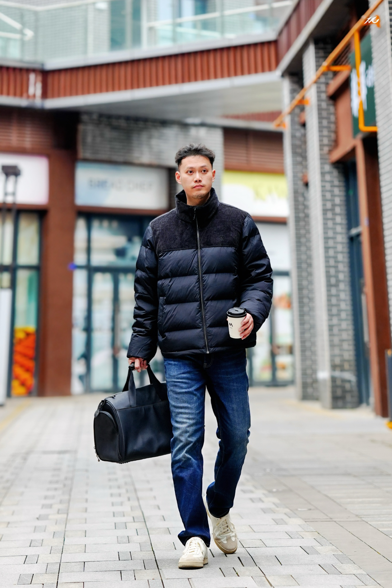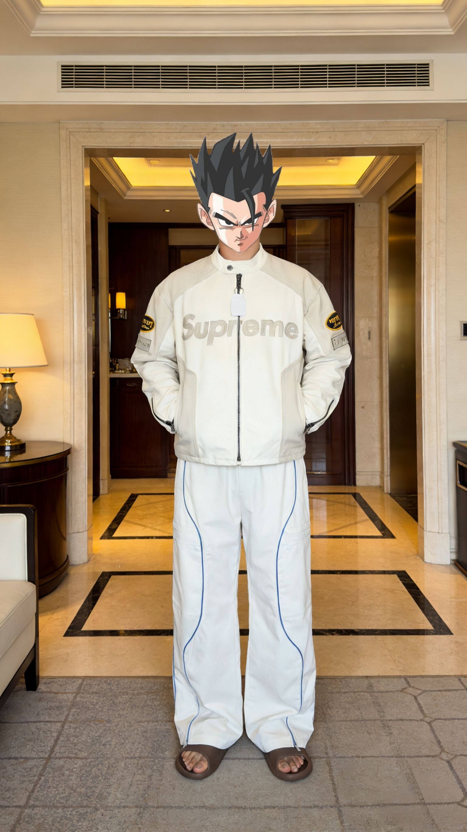 Supreme 机车夹克搭配白蓝线条工装裤,街头潮酷感拉满!夹克皮质柔软挺括,工装裤垂坠感佳!