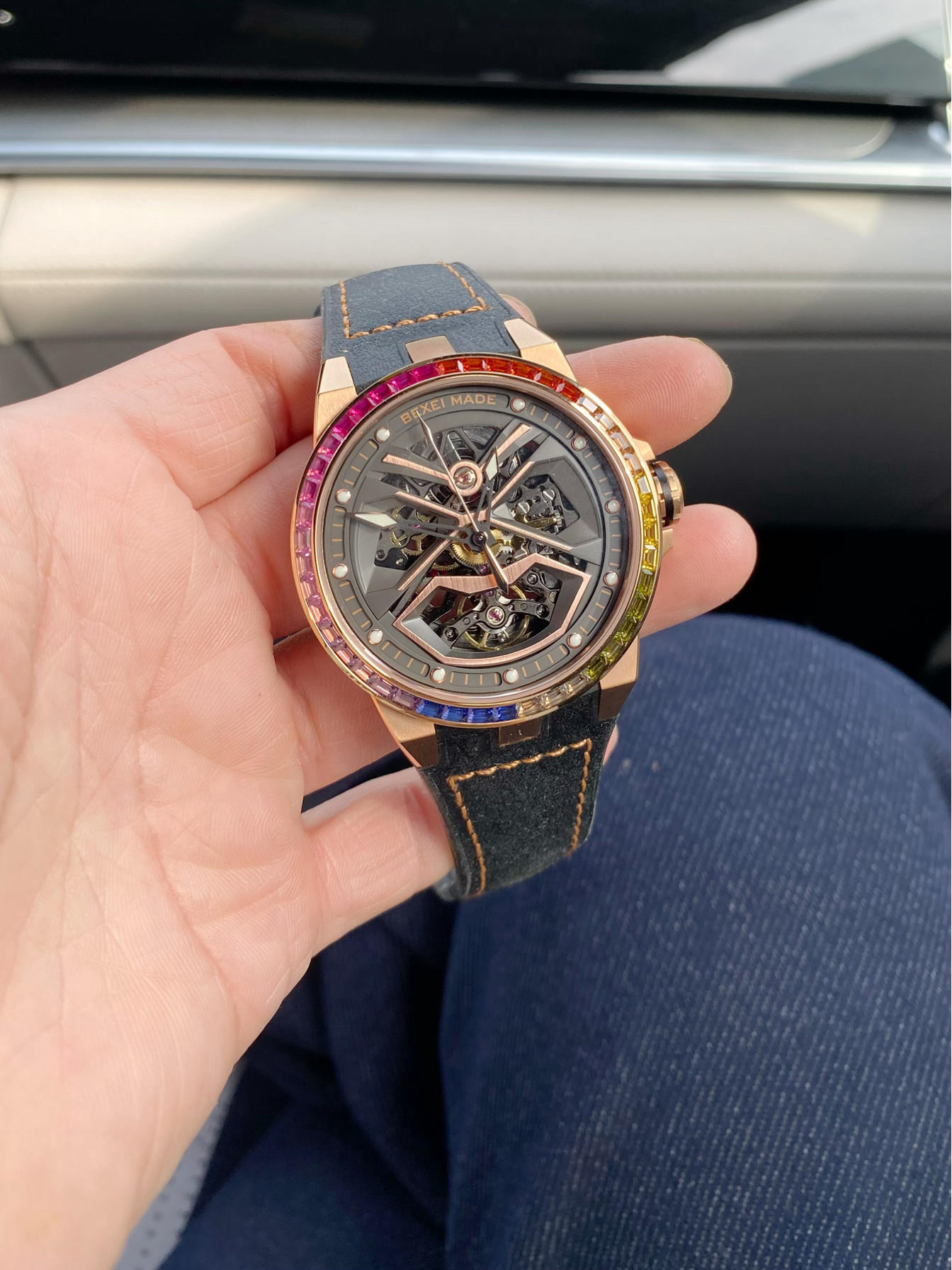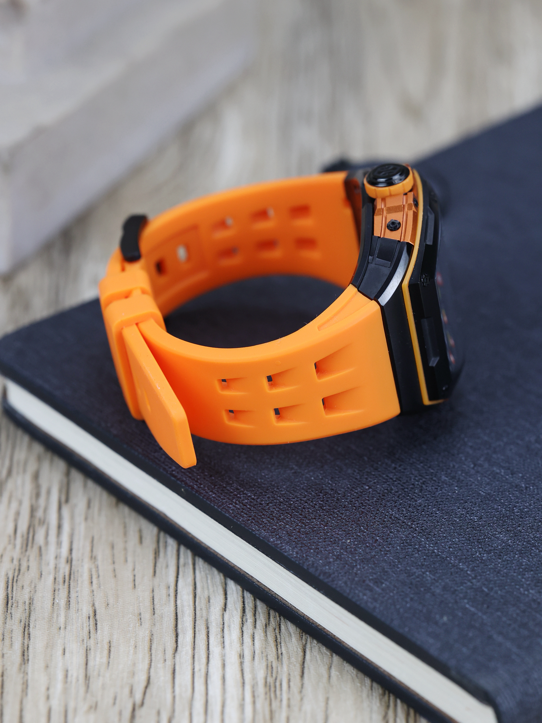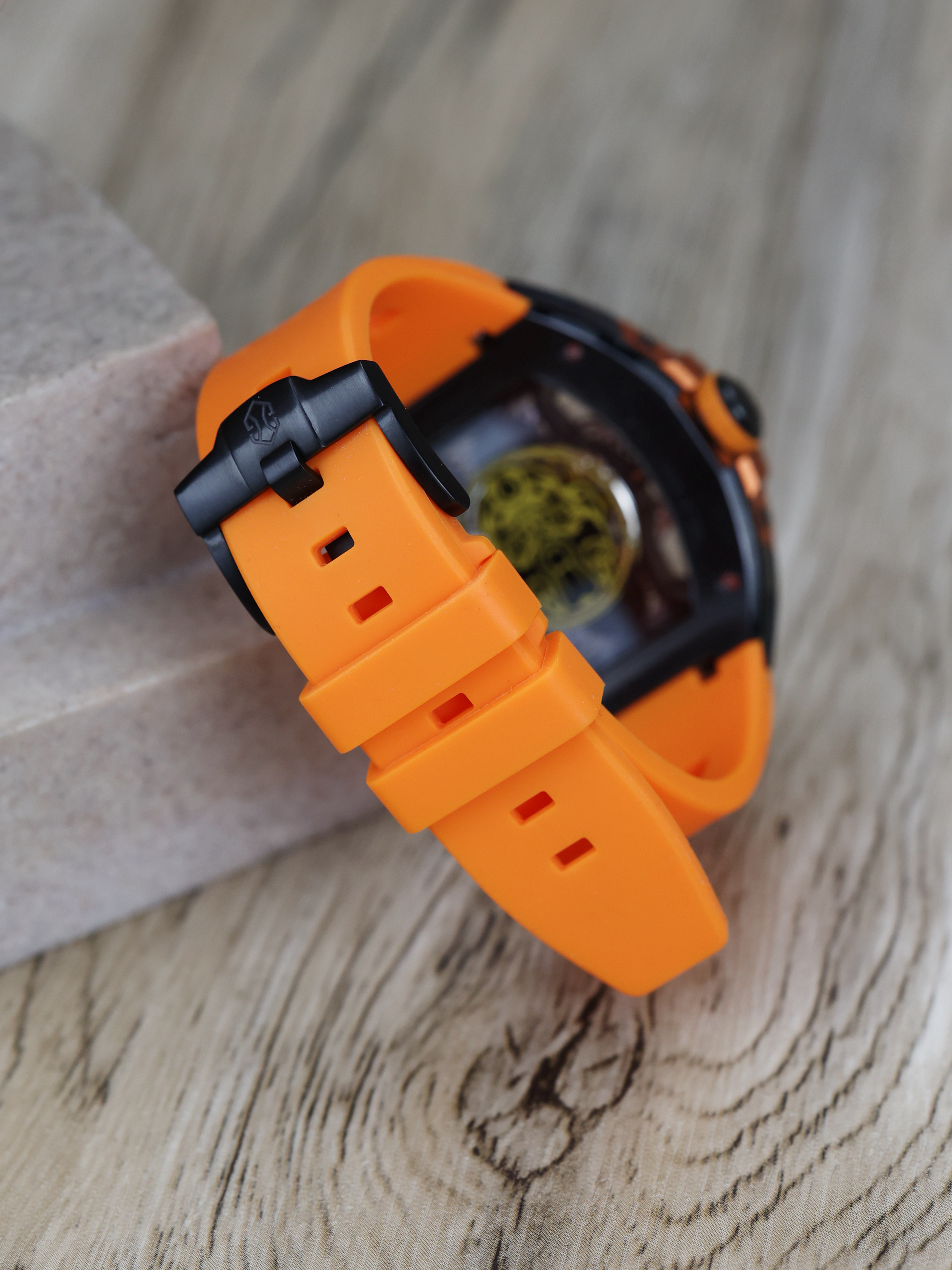 我发现橘红色的主导确实容易吸引人,虽然只是手表的表带和表圈装饰是橘红色的,但由于表盘的镂空太彻底,导致我眼里全是橘红😅,我感觉戴着它回头率是少不了了😔