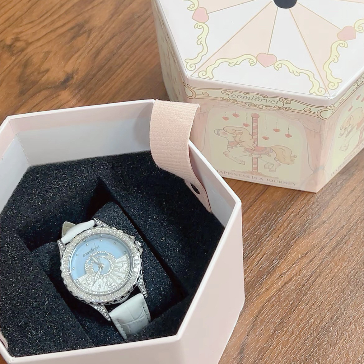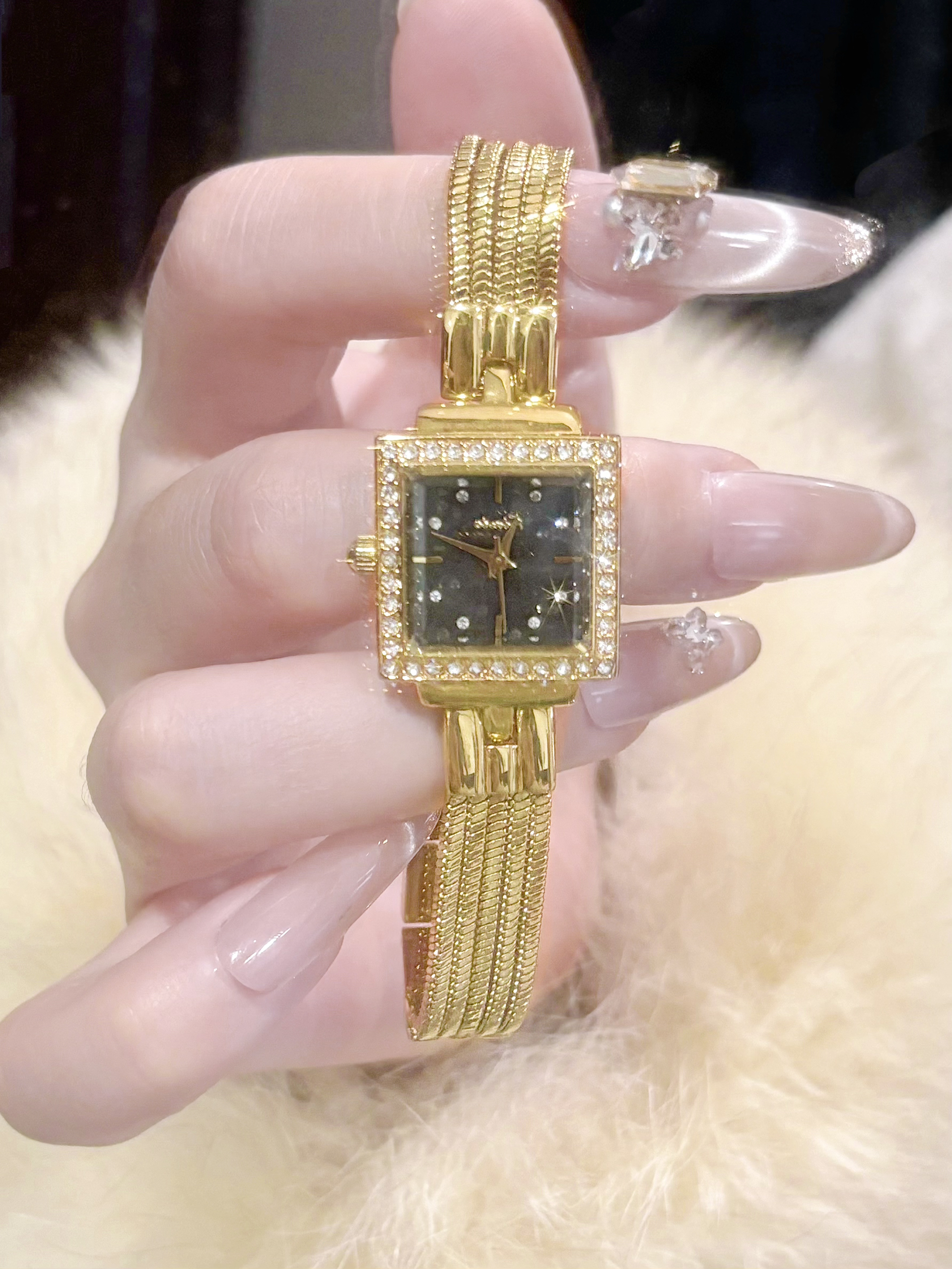 介个就是我最近都在戴的小金表啦 我觉得还蛮百搭的哦款式也简单大方 表盘还有一圈的碎钻blingbling的 金色的这种暖调戴在手上就还蛮衬肤色耶 平时我穿毛毛外套戴会显得很贵气哦 刚好过几天跨年约会就戴介个啦~