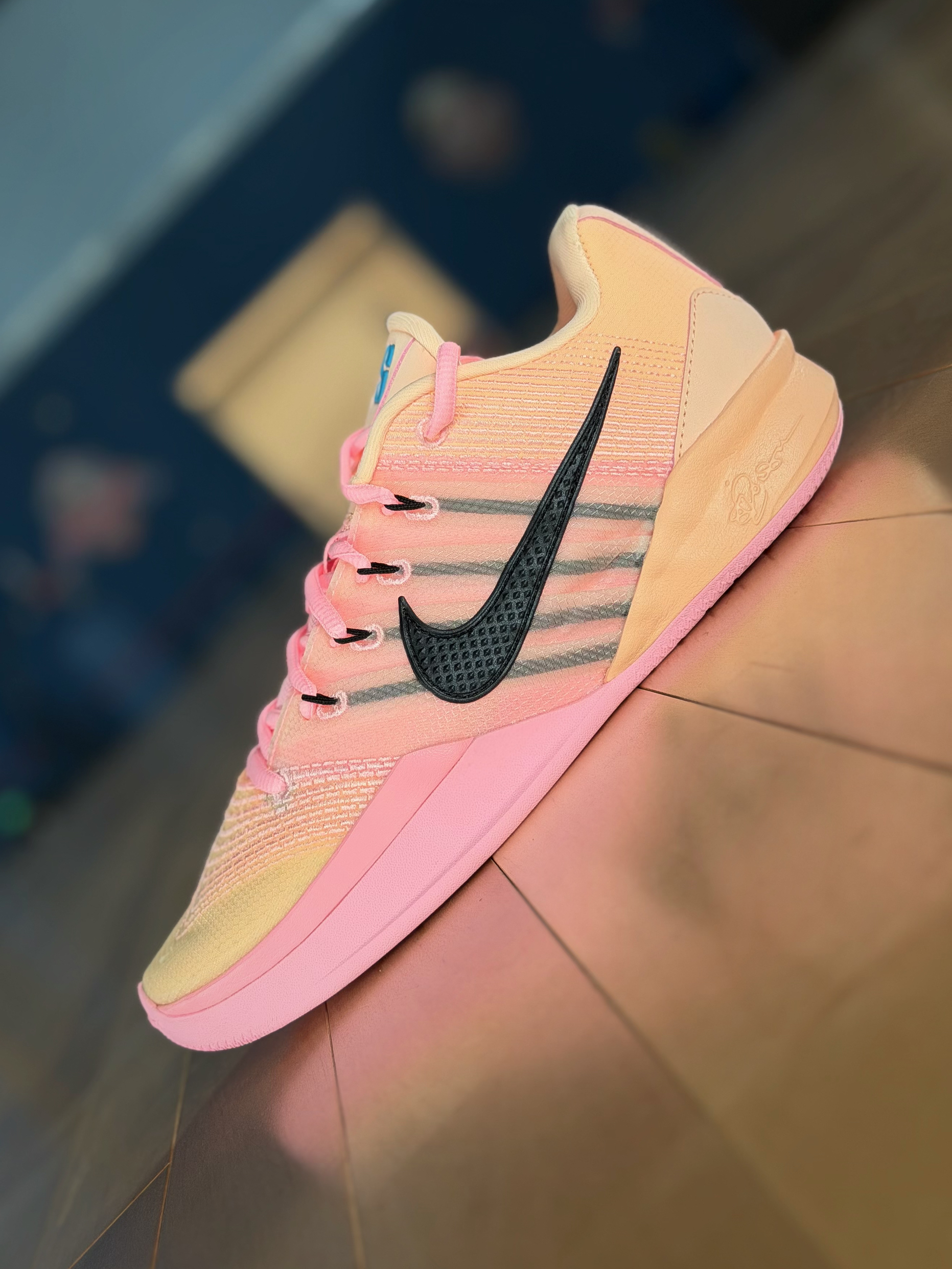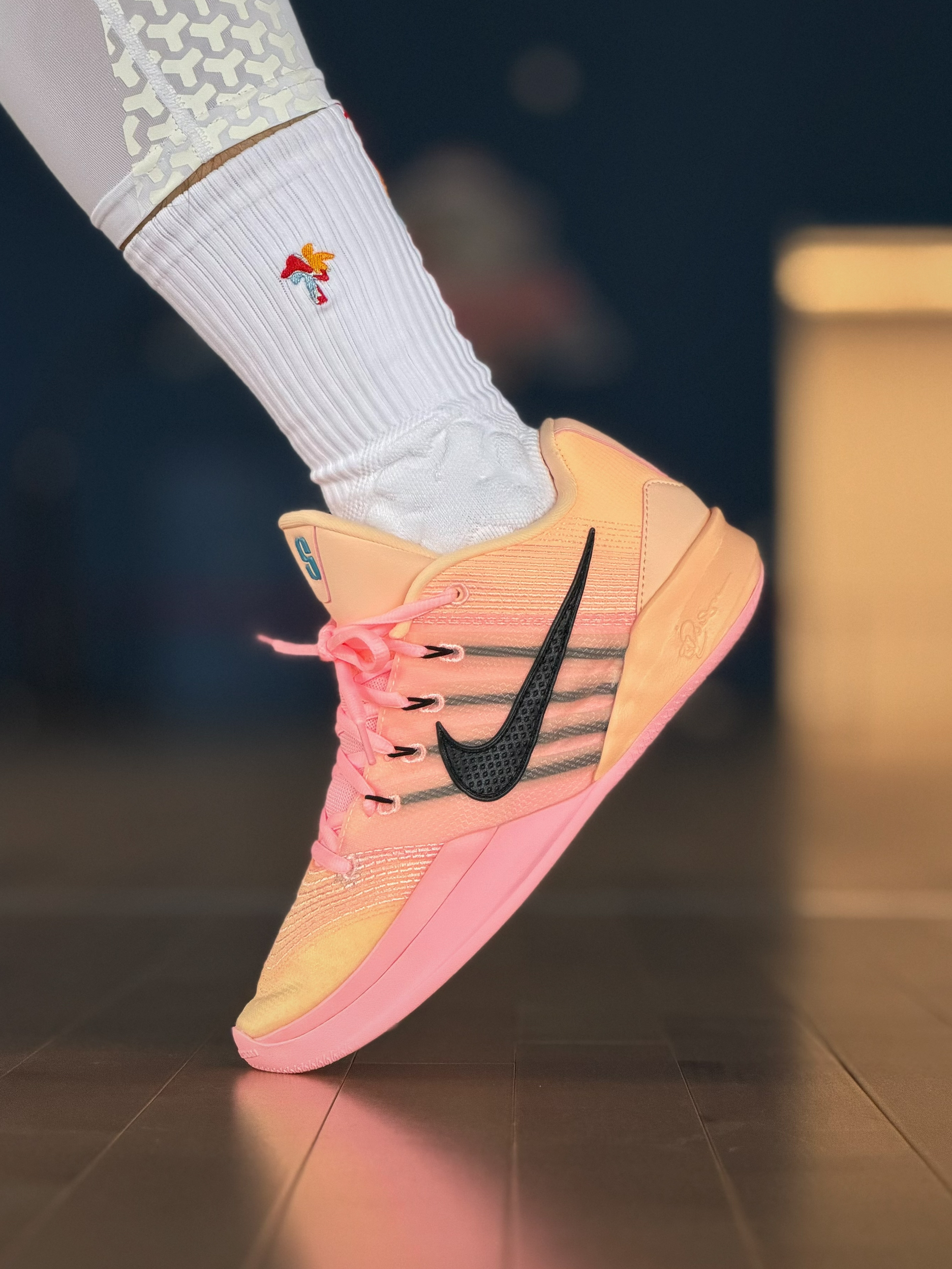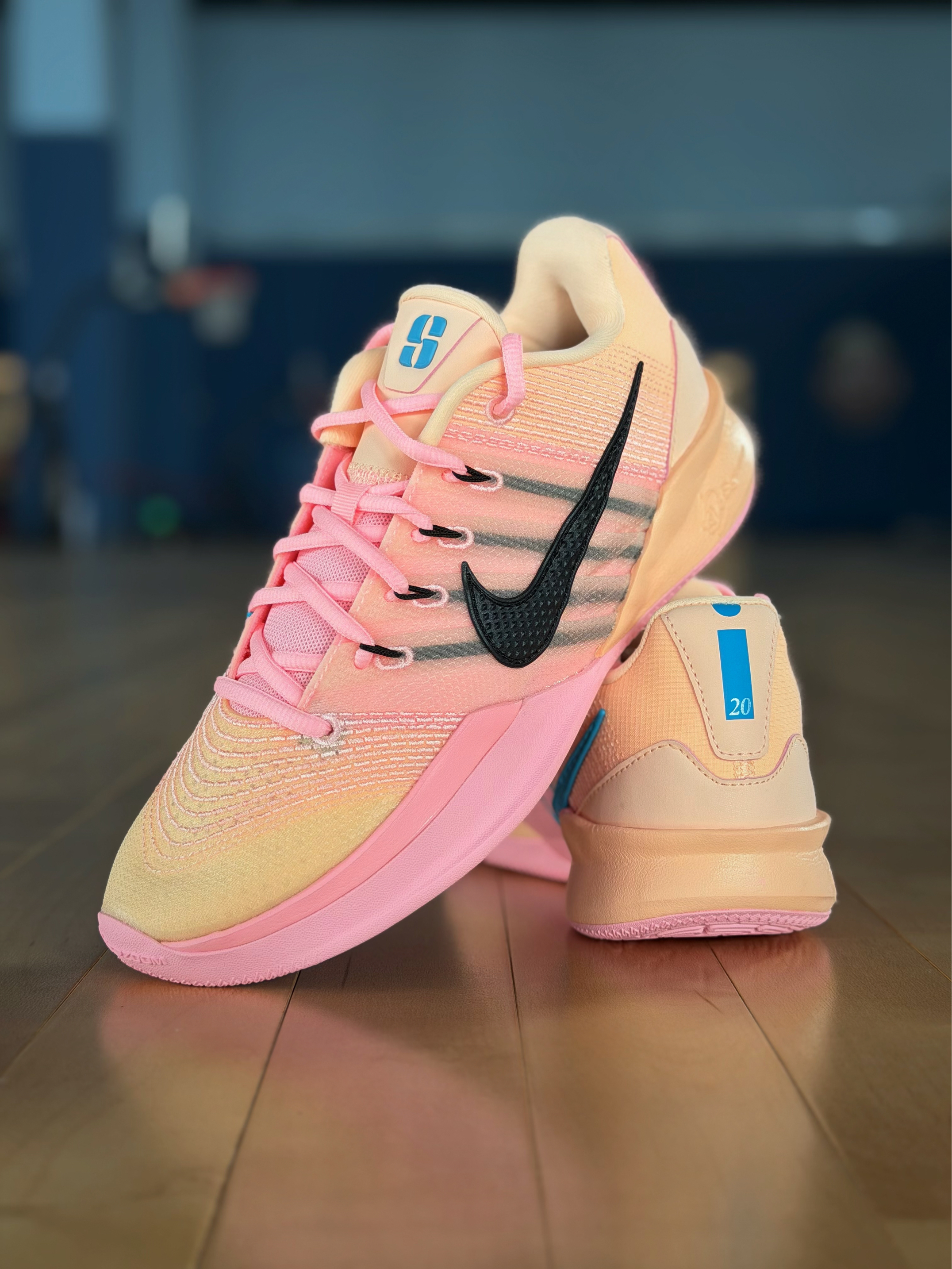 这双Sabrina3篮球鞋,粉色配色,颜值确实好看的!鞋面有动态飞线,实战的时候,变向或者突破,鞋面很稳定,没有产生大的形变! 前掌气垫响应干脆,起跳落地不震脚 橡胶外底,纹路清晰,耐磨和防滑效果不错!