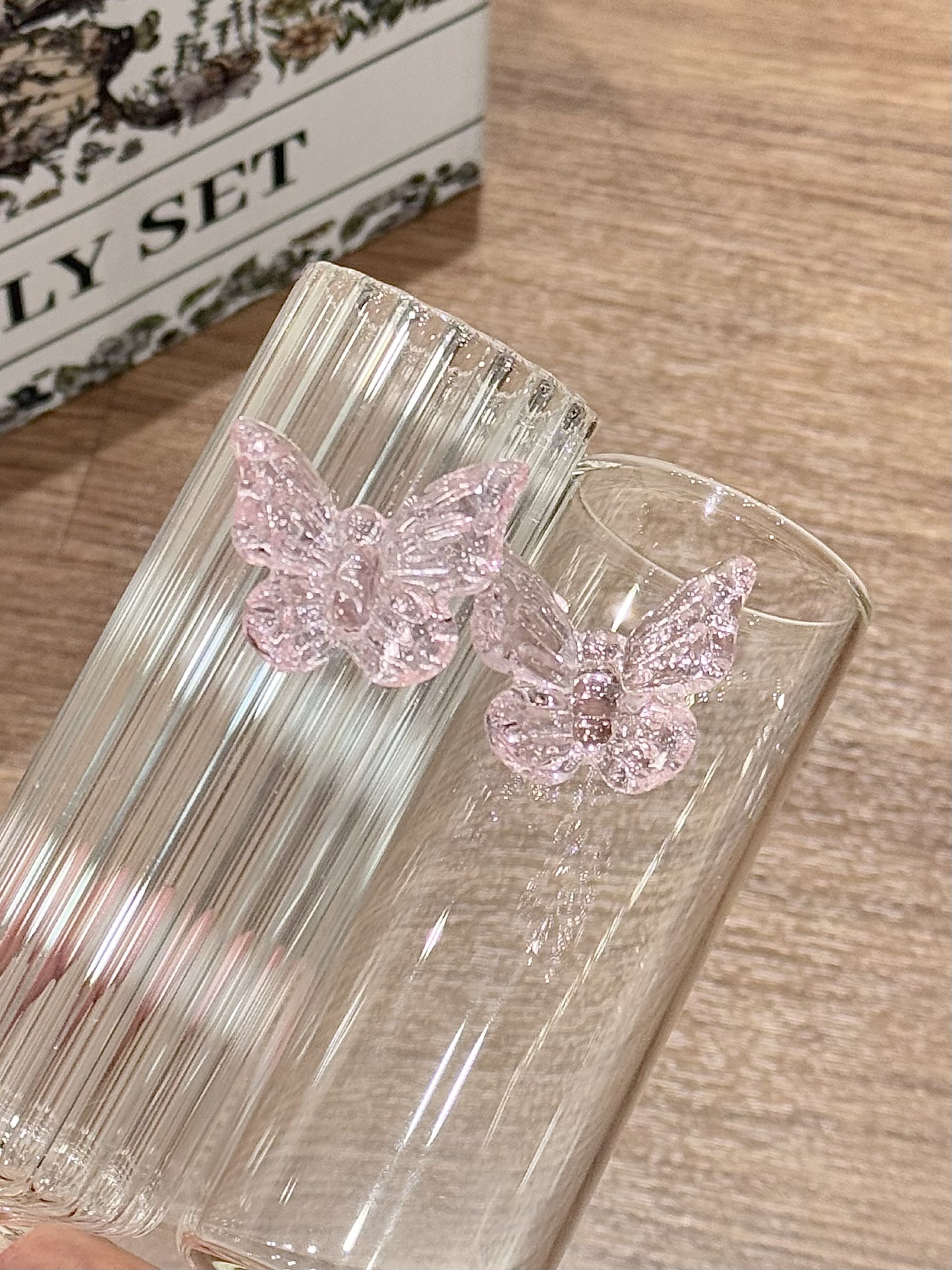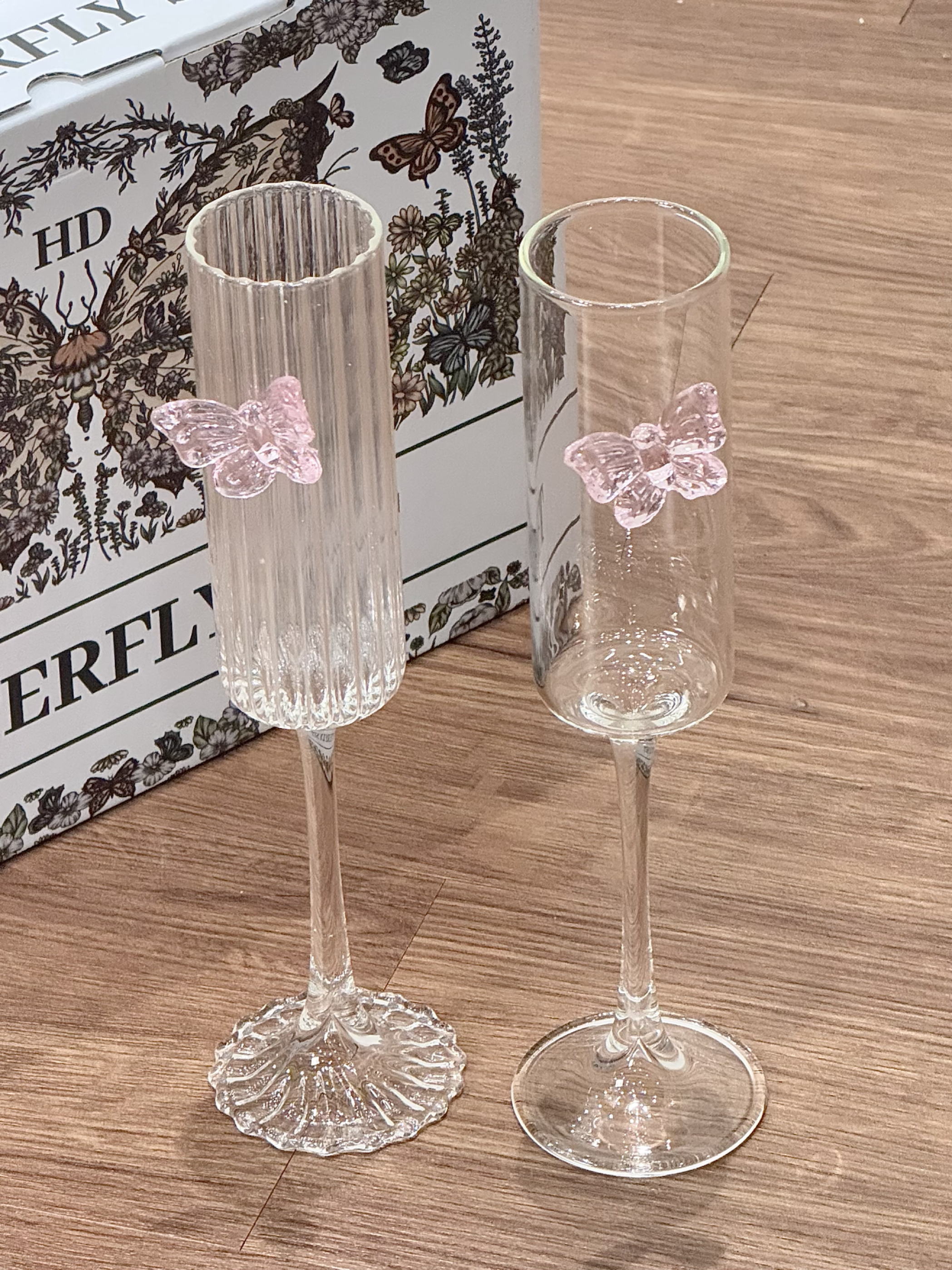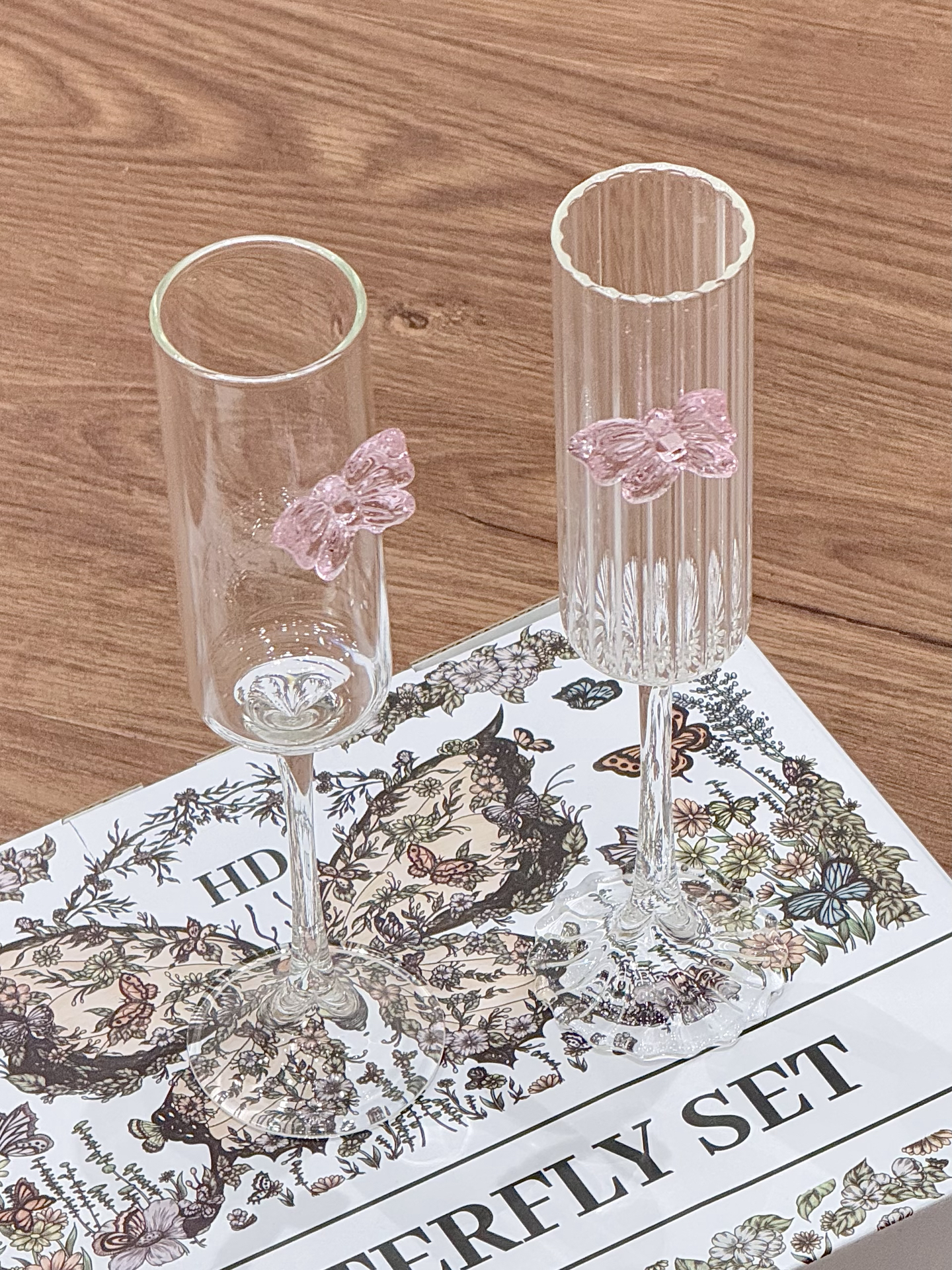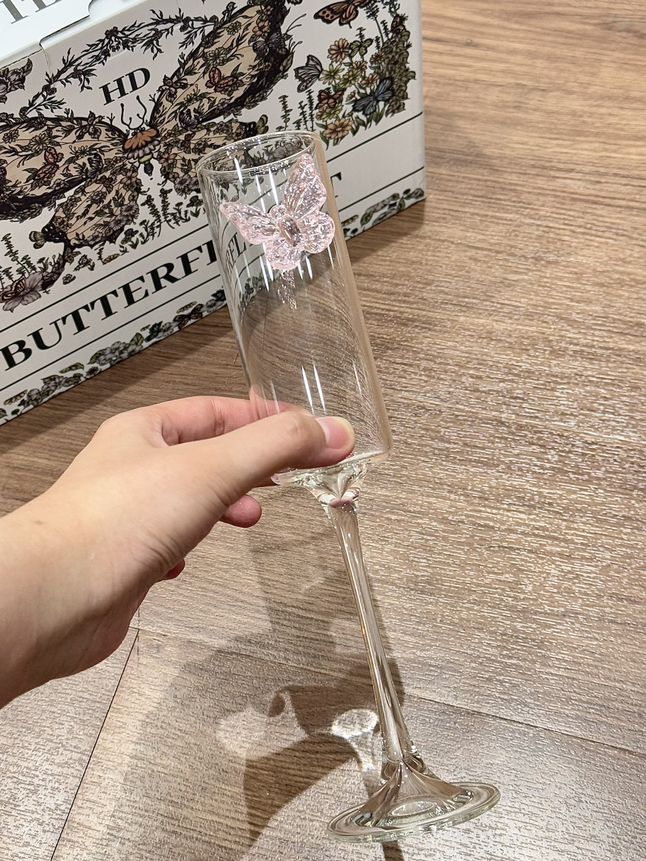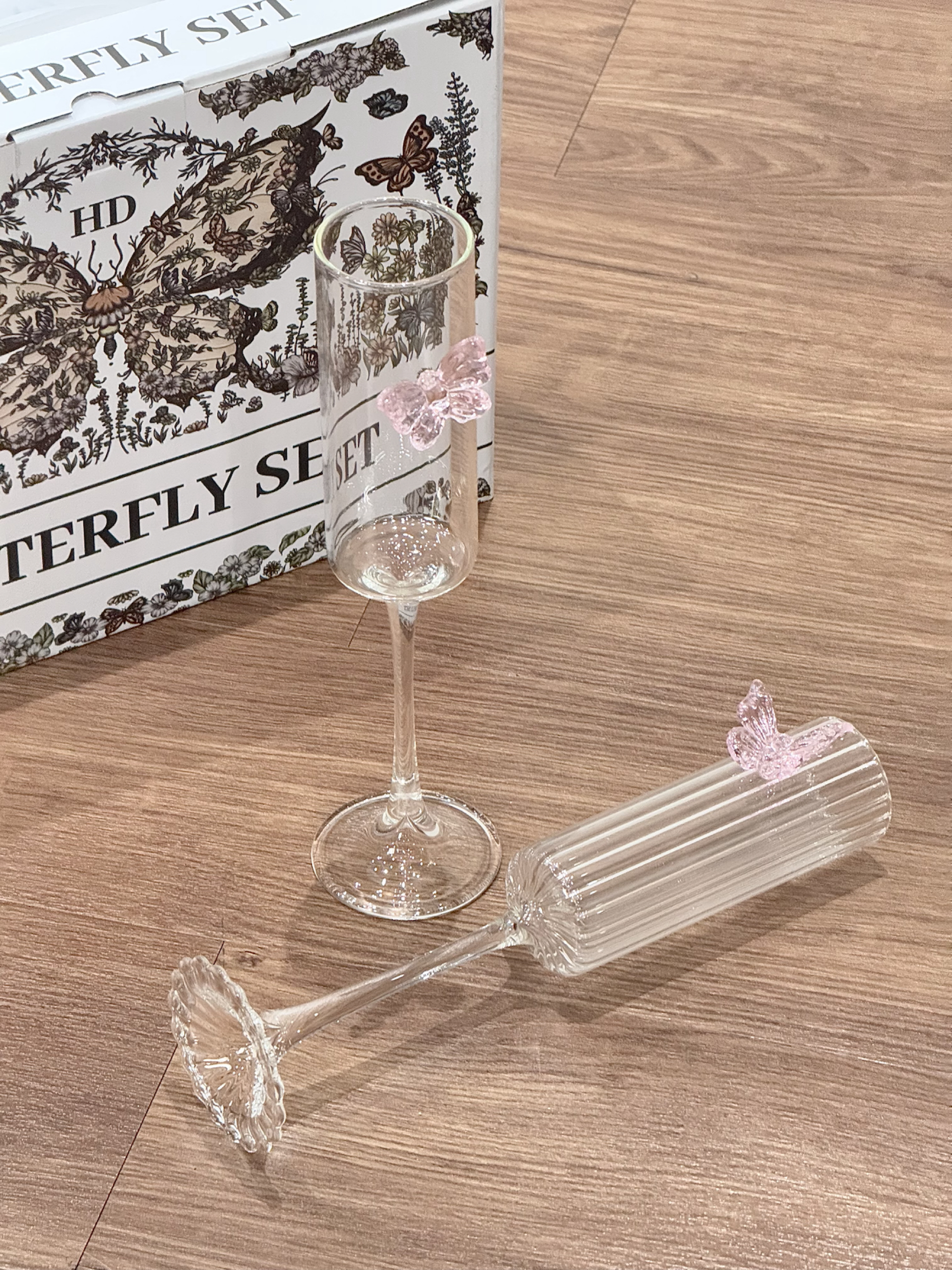 挖到了敲美的高脚杯礼盒了耶 杯身上还点缀了粉粉嫩嫩的小蝴蝶 平时用来喝点小酒也很有氛围感 礼盒装的 我觉得送人也是好合适呀!