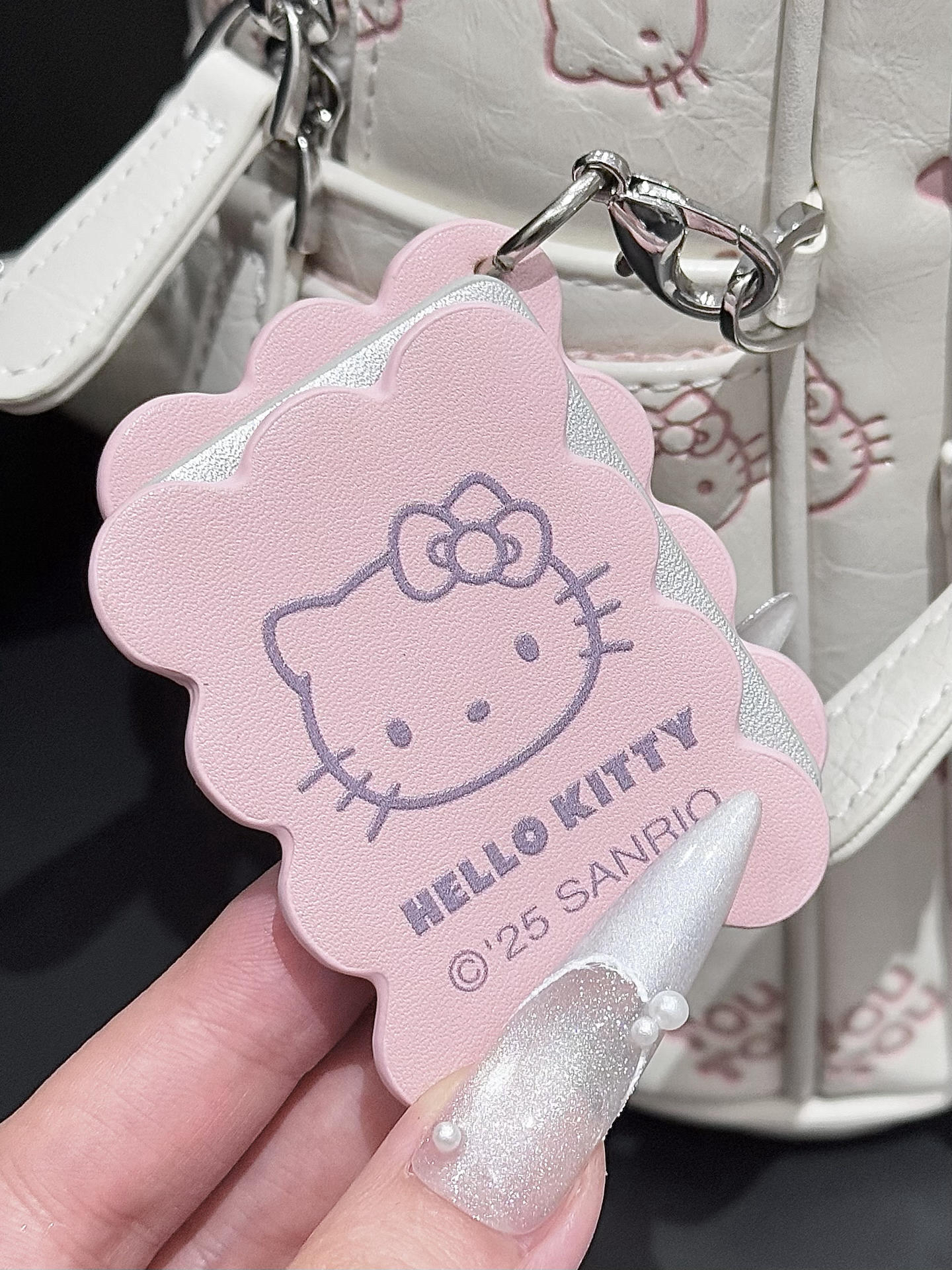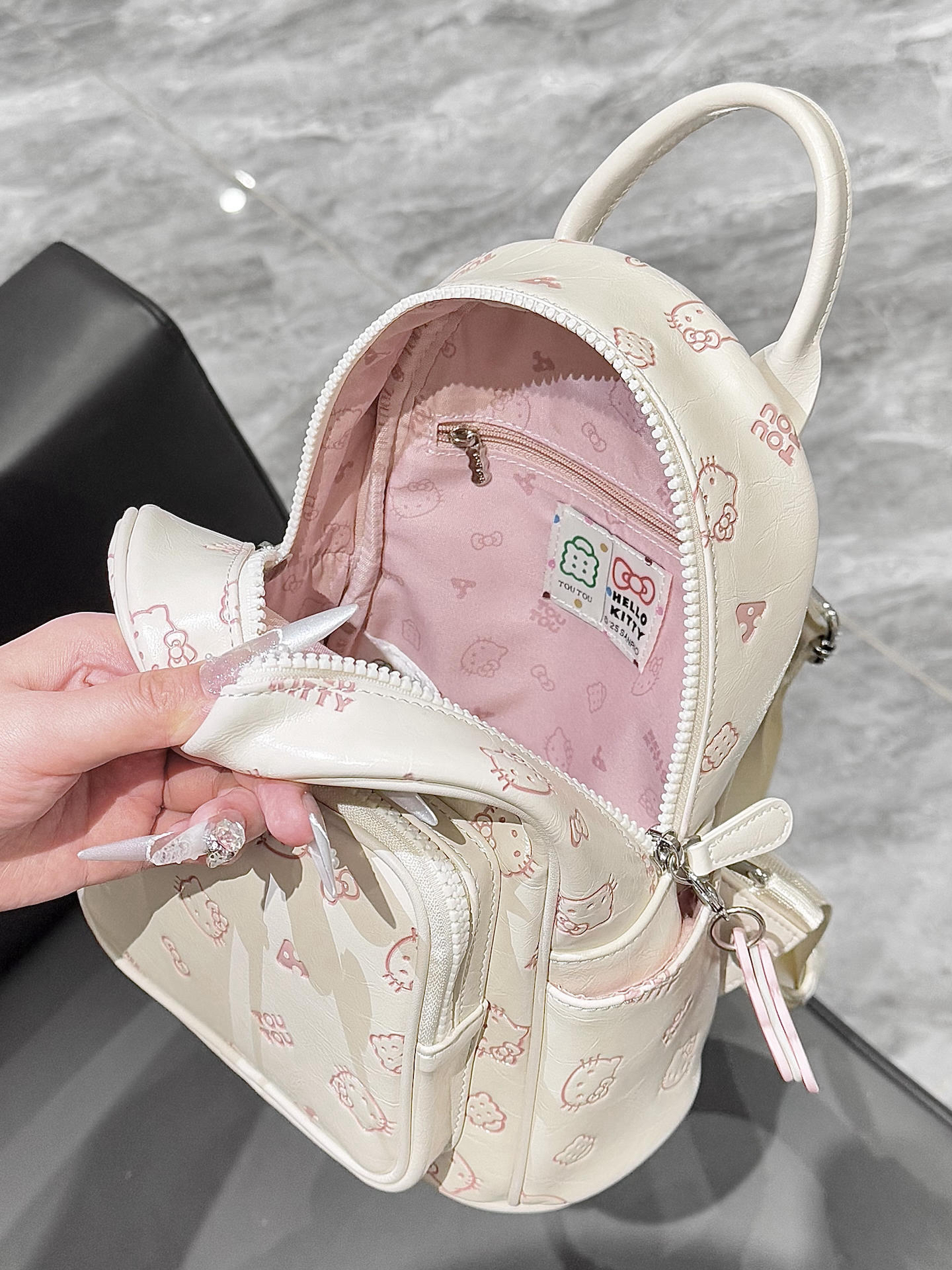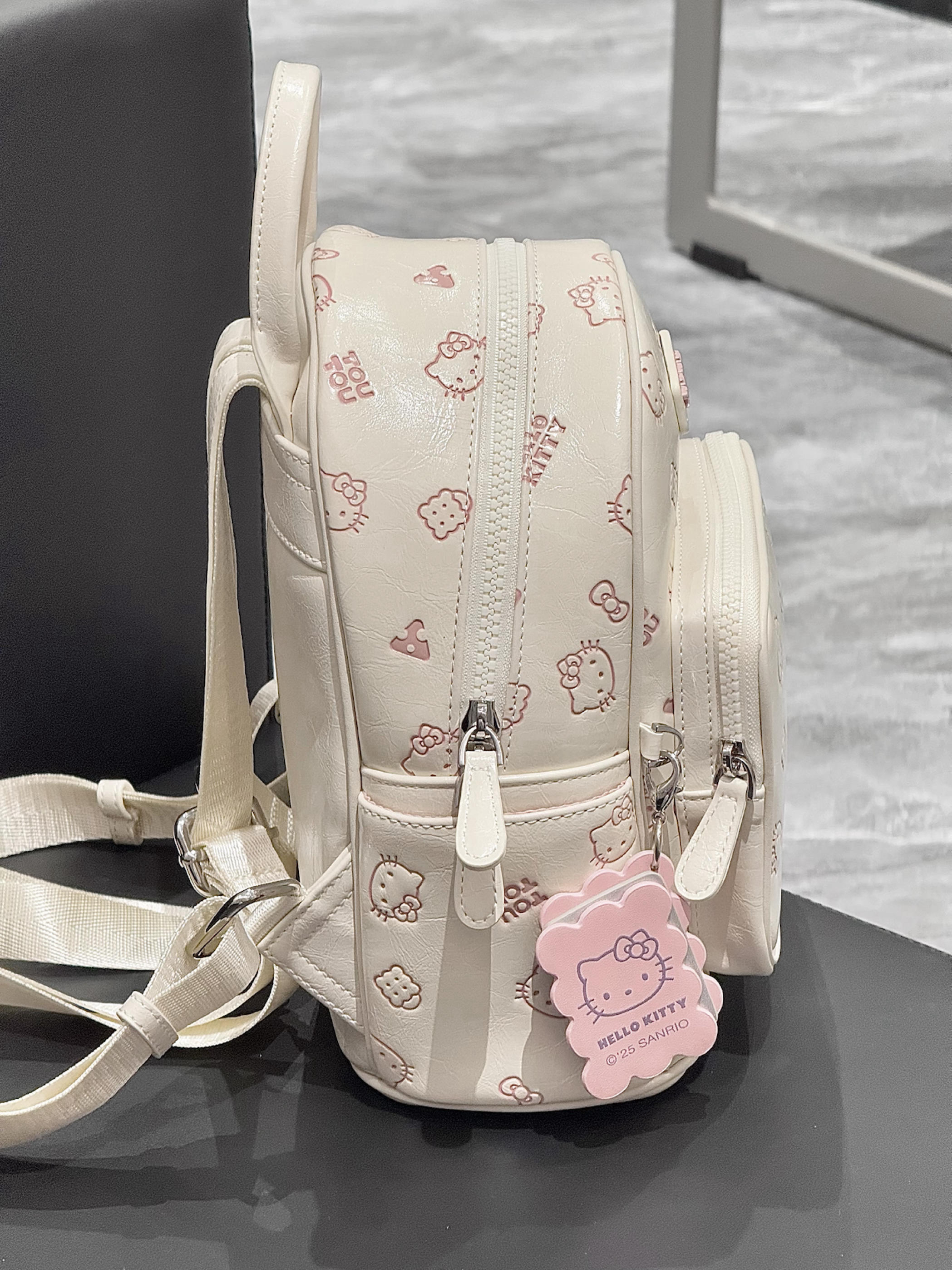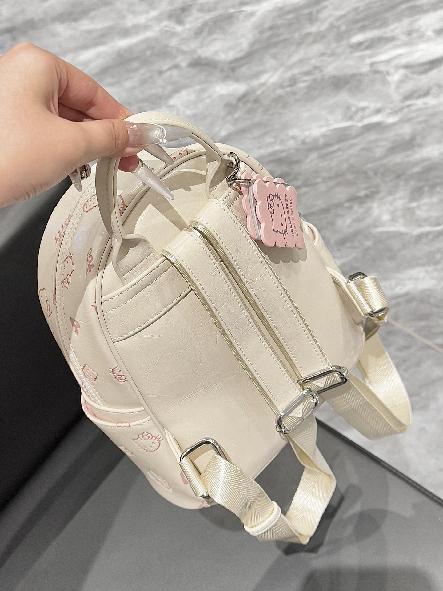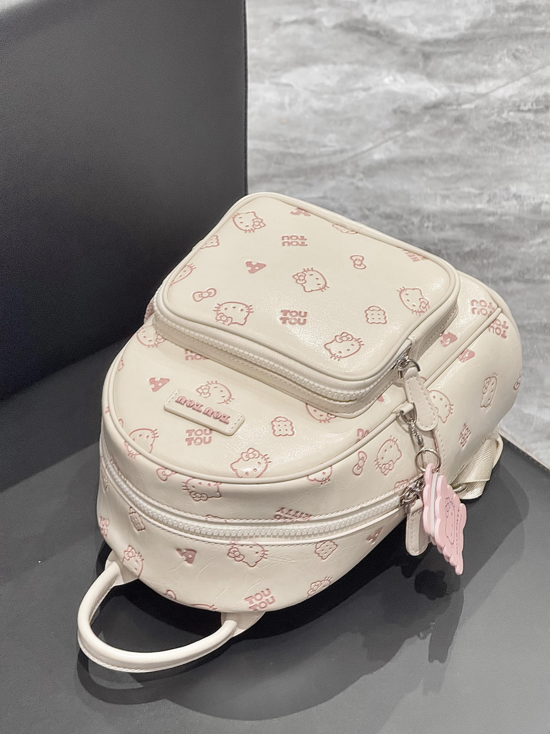 选双肩包我是有眼光的呀 介只kitty的双肩包我可太爱了 米白色搭配粉粉的kitty印花好搭呀 还搭配了一个饼干挂件 容量也很不错 可以装书本 ipad 我觉得上课或者通勤背都挺不错的呀!