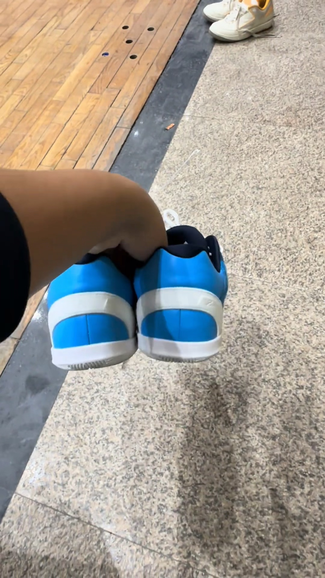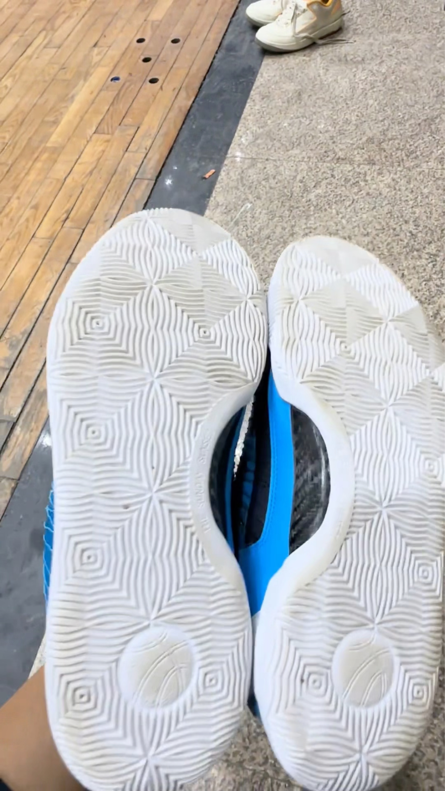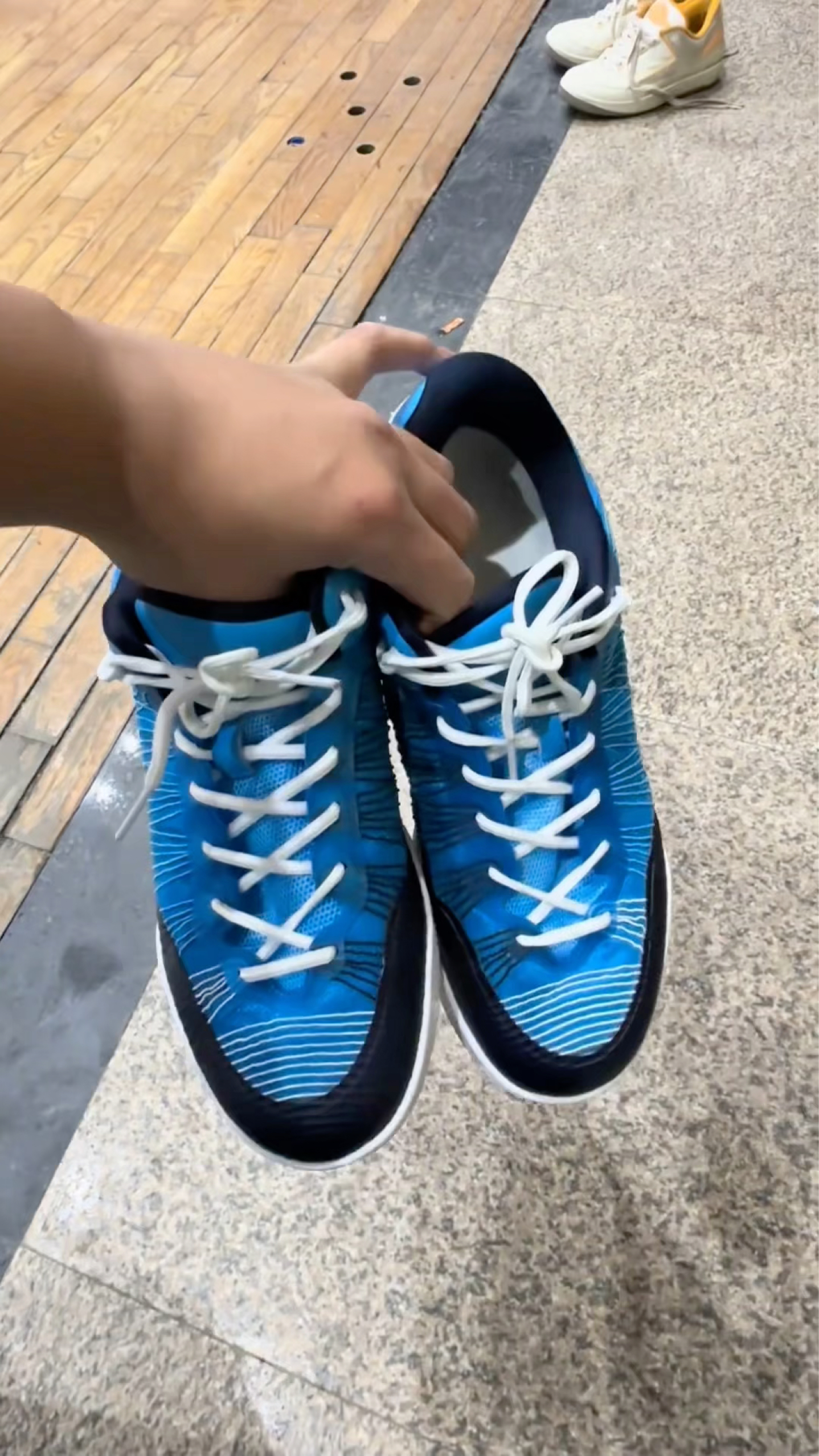外观设计很抓眼,蓝黑撞色搭配白色线条纹理,视觉上很有动感,鞋面的网布材质看着透气性应该不错,日常打球穿,颜值和实用性都能兼顾。